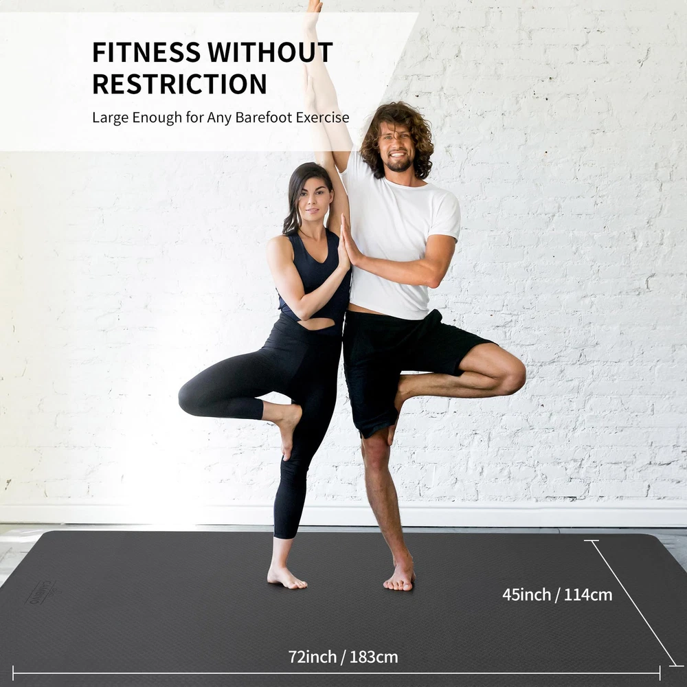 Fitness Without Restriction: Extra length and width(72"x 48"), You will never feel restricted or limited by the size of this fitness mat; Extra-large space allows you to do any Yoga Poses, Pilates, Stretch, Foam Rolling, Cardio Workouts, Meditations and various barefoot bodyweight training like Squats, Lunges, Push-ups, Plank Variations, and Calisthenics Grippy Not Slippy: Our Yoga Mat using a Two-toned Textured non-slip design so you can perform any movement with confidence; Wavy underside stops the mat from sliding on the floor; The laser graved surface prevents hands and feet from slipping out of position so you can hold poses no matter how vigorous your practice gets and whether you¡¯re practicing on a wood floor, or tile ( Not recommended for use on a rug) Optimize Workout Performance: The extra thick yoga mat and the textured surface stabilizes your body, relieves pressure points in all yoga postures, aids in balance to hold postures longer, and protect your joints and knees without compromising support or stability; Great for beginners, pros and yoga trainers, fitness exercises or rehabilitative purpose Versatile and Convenient: This fitness yoga mat is designed very lightweight and comes with storage straps that allows you to take it with you at work, at the gym, camping, and much more; Great for yoga, sit-ups, push-ups, aerobic exercises, outdoor camping, and much more; Roll it for convenient storage after use; A must-have for every yoga enthusiast Yoga mat of 2 versions logo will be sent RANDOMLY; Package Include: Large yoga mat, a microfiber towel, two mat straps; Note: We recommend that you use our yoga mat barefoot or with yoga socks, but do not wear shoes, because the shoes are rather hard on the material of yoga mats and can tear the mat