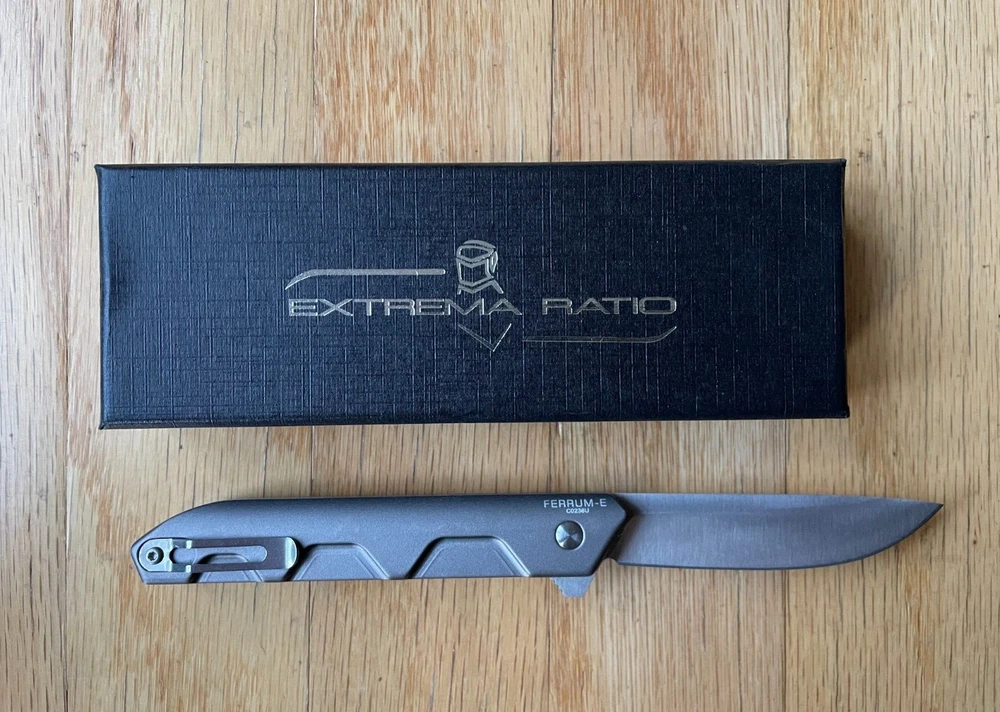 Ferrum E is a simple, essential and functional EDC (Every Day Carry) folding knife. It has a drop point blade and a slim and compact shape. The two anodized heat treated anticorodal aluminum handle scales make its grip light, slim as well as durable. It can be placed in a pocket, in small flashlight holsters or in a single M.O.L.L.E. system webbing. It comes with a flipper assisted opening. The blade rotates on ball bearings resulting in a fluid and firm movement. This mechanism allows the user an easy and rapid opening of the blade, even with just one hand. The locking mechanism is the time-tested liner lock. The reversible clip is located on the back. Ferrum E is available in two versions, both with satin blade finishing. Ferrum E Tactical Mud comes with a brand-new anodized grey-green handle finishing. Buy with confidence with our, 30 Day Return policy if you are not completely satisfied.