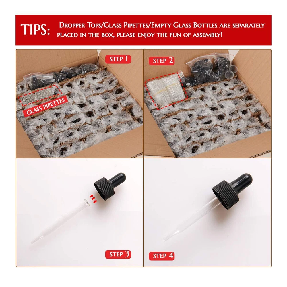 Why Glass? - Oil will make plastic sticky. - Glass is free of harmful chemicals, BPA free, and lead-free. - Glass will not dissolve the chemicals in your ingredients. - Amber-colored glass protects the sensitive liquid from degradation from light. - Glass material is wear-resistant, reusable, and more durable. What Does Hoa Kinh Eye Dropper Bottles Give You? Safe Materials Made of corrosion-resistant glass, these glass dropper bottles are BPA free and lead-free, contain no dangerous chemicals, which can store liquid effectively and safely. Protects Your Liquids Amber glass bottle provides ultraviolet protection, especially important for aromatherapy, essential oils & herbal treatments to preserve beneficial effects, ensure the liquid a long term safe. Wide Applications: Ideal for blending essential oil, dispensing perfumes & colognes for travel, making handmade hair care oil, providing your plants with precisely measured liquid fertilizer, storing chemistry and laboratory chemicals, etc. Product Specification: Color: amber glass, clear dip tubes, black cap Quantity: 48pcs Capacity: 1oz = 30ml Size: 1.2"(D) x 4"(H)(Contains dropper top) Package Include: 48 × Amber Glass Bottle 48 × glass droppers 2 × Plastic Funnel Tips: Dropper tops and glass droppers are separate and stuffed in the grid of the box. Please enjoy the fun of assembling by yourself! Cost-effective: Set of 48 eye dropper bottles with pipettes dropper and rubber bulbs which is enough to store essential oil, perfume or other liquids. Two extra plastic Funnels will help you transfer liquids into the glass dropper bottles mess UV Protection: Our amber dropper bottles will effectively filter out harmful UV rays to protect your sensitive essential oils from quick volatilization Leak-proof: Carefully selected corrosion-resistant glass which makes our small dropper bottles thick, smooth and anti-shock. The screw thread finish bottle mouth is matched with black cap, which fit tightly and can prevent any liquid leakage Easy to Carry: Each 1oz/30ml glass bottle includes dropper top measures: 1.2"(D) x 4"(H), perfect size for your perfume, essential oils. Conveniently carry in your purse or makeup bag to take for travel or picnic Utility: Reusable, refillable, practical glass bottle with dropper, they are great for your loved ones and otter festive occasions