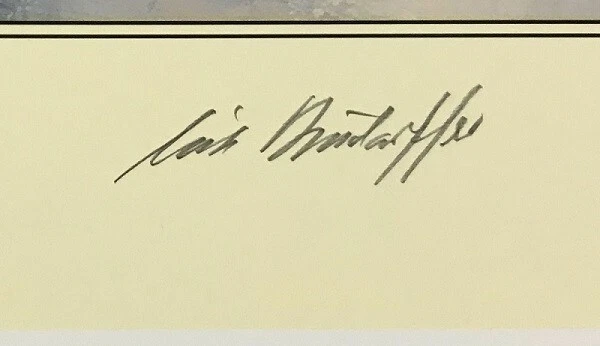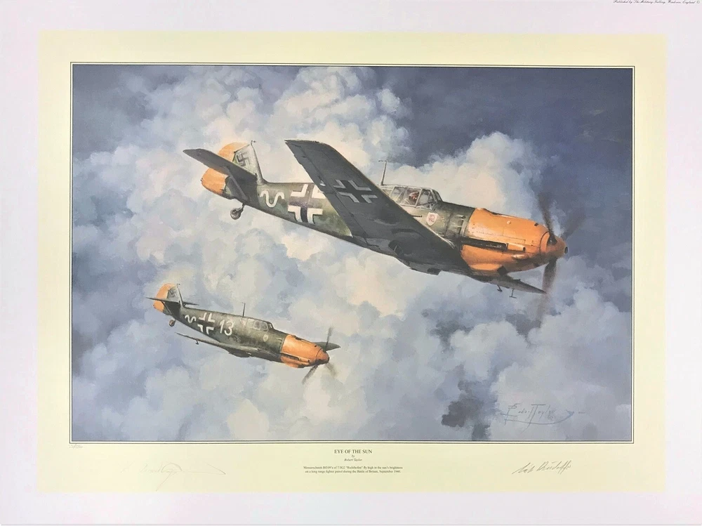 A PORTFOLIO TO COMMEMORATE THE 75th ANNIVERSARY OF THE BATTLE OF BRITAIN 1940 – 2015 EYE OF THE SUN By Robert Taylor Messerschmitt Bf109s from 7./JG2 Richthofen head out on a long-range fighter patrol in September 1940. With the sun behind them they hope to launch a surprise attack on unsuspecting RAF aircraft, however these enemy raiders will soon be intercepted by some of Fighter Command’s most determined “defenders of the realm.” THE SIGNATURES The print is individually hand numbered and signed by the artist Robert Taylor along with one of the most legendary Luftwaffe Aces of WWII: Major ERICH RUDORFFER Knights Cross with Oak Leaves & Swords - 222 victories This outstanding piece is the perfect opportunity for collectors to invest in a true piece of aviation history. ALSO AVAILABLE FRAMED & SHIPPED - Please ask for details We will always do our best to combine shipping on multiple purchases whenever possible – please ask. BUY WITH CONFIDENCE: We have been in business for over 20 years and our items are guaranteed to be in perfect condition, unless specified otherwise. SHIPPING: Our prints are rolled in acid free tissue and shipped in large, heavy duty shipping tubes. matted & framed pieces are 'flat packed' in substantial packaging. Our shipping is insured and guaranteed. YOUR PIECE OF MIND: As a reputable company, if any issues do arise we don't expect our customers to deal with it. So if there are any problems such as with condition, delivery or damages then we will take care of it with a replacement, store credit or your money back. Please note: The signatures on our pieces are not reproductions; they are original autographs, hand-signed by the veterans involved.