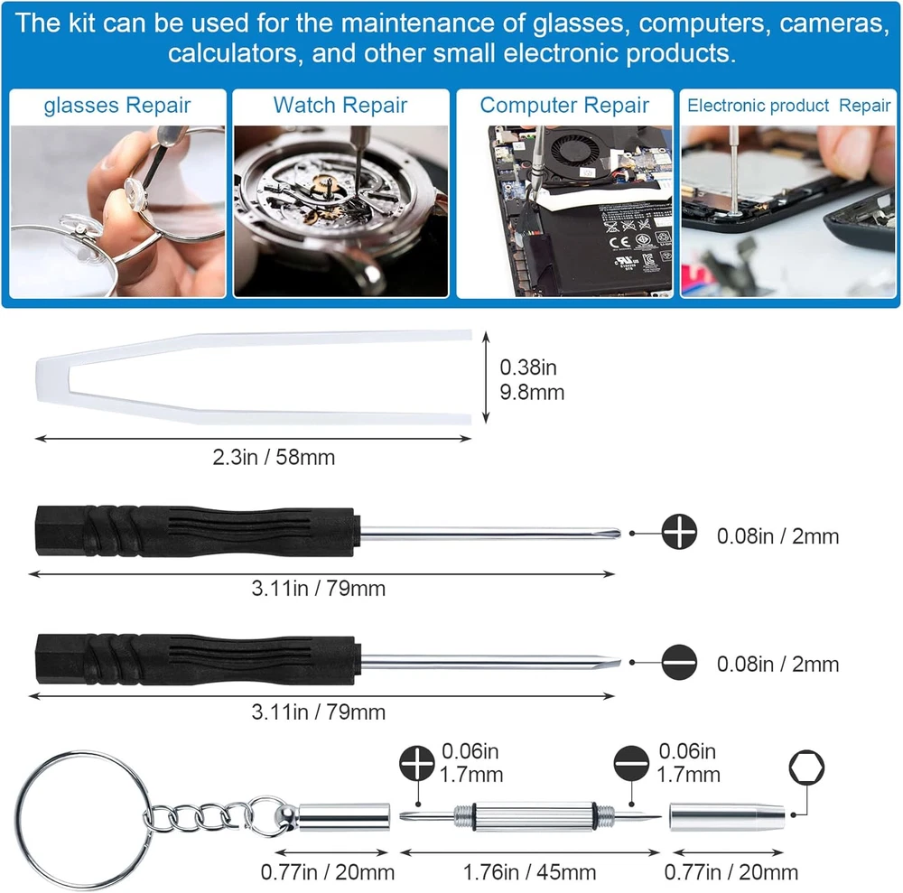Store New Arrivals Add to Favorite View Feedback Contact Eyeglasses Repair Kit, 3-In-1 Screwdriver, Slotted/Cross Bit Screwdrivers, 10Pairs Nose Pads, Tweezer, Anti-Slip Holder, Cleaning Cloth, Screws, Storage Box, for Glasses, Sunglass Description Batteries Required? No Color Black,transparent Material Silicone, Metal Head Style Flat Item Weight 2.39 ounces Batteries Included? No Package Dimensions 7.13 x 4.53 x 0.94 inches Package Include - The eyeglass repair kit includes 1pcs 3 in 1 multifunctional screwdriver, 1 slotted bit screwdriver, 1 cross bit screwdriver, about 500pcs different sizes screws, 10 pairs nose pads, 1pcs tweezer, 1 pair anti-slip holder, 1 cleaning cloth, 1 storage box. Sufficient repair tools and parts for repairing glasses yourself. Multifunzional Screwdriver & Assortments of Screws - The 3 in 1 keychain screwdriver includes a slotted bit, a cross bit screwdriver and a nut driver, the keychain design is convenient to carry. The specification of the bit on the keychain screwdriver is 1.7mm/0.06inch. The specification of the screwdriver with black anti-slip handle is: 2mm(0.08in) bit. There are assortments of screws, nuts, washers, pointed screws, and screw bolts to meet your different needs. High-quality Nose Pads - The nose pads are made premium quality silicone, transparent color, soft and comfortable, lightweight. Suitable for replacing your old, bad, missing, broken nose pads. They are good replacements for most glasses. Wide Applications - The eyeglasses repairing tools kit is suitable for eyeglasses, sunglasses, watches, clocks, computers, small electronics. You can repair your glasses yourself and don't need to go to the glasses. Meet the daily repair needs, save money and time. Before ordering, please pay attention to the size of the screw bit and screws. Perfect Gift & - The glasses repair tool kits are perfect gift for people who like repairing. A clear storage box for organizing. We are committed to providing you with quality products and services . If you have any questions, please feel free to . Product Description OIIKI Eyeglasses Repair Kit, 3-in-1 Screwdriver, Slotted/Cross Bit Screwdrivers Package Include The eyeglass repair kit includes 1pcs 3 in 1 multifunctional screwdriver, 1 slotted bit screwdriver, 1 cross bit screwdriver, about 500pcs different sizes screws, 10 pairs nose pads, 1pcs tweezer, 1 pair anti-slip holder, 1 cleaning cloth, 1 storage box. Multifunzional Screwdriver & Assortments of Screws The specification of the bit on the keychain screwdriver is 1.7mm/0.06inch. The specification of the screwdriver with black anti-slip handle is: 2mm(0.08in) bit. Material The nose pads are made premium quality silicone, transparent color, soft and comfortable, lightweight. ABOUT US We offer the best prices around on high quality products. Our E-store includes media such as books, movies, music and games while offering electronics, toys, sporting apparel, clothing, tools, general home, garden items and more. SHIPPING We are always working hard to ensure your package arrives as soon as possible. Please understand that some factors like weather, high postal traffic, and the performance of shipping companies are outside of our control. We offer free shipping to the lower 48 states and ship within 2 business days of payment, usually sooner. We do not accept P.O. Boxes. Please provide a physical address. For shipping outside of the continental USA, we only use eBay's Global Shipping Program.The item is shipped to KY and then sent to the rest of the world. International customers are responsible for all duties and taxes. Continue to check out in order to calculate costs for shipping the item to your country. Messages regarding eBay's Global Shipping Program MUST be directed at eBay EXCLUSIVELY. RETURNS We offer a 30-Day Return Policy on items which you are not completely satisfied with. You have the option for a full-refund or an exchange of the item. No returns are available on items shipped outside of the USA. PAYMENT We accept PayPal. CONTACT US This page content is yet to come Please ad us to your favorite seller and visit again later Thank You CUSTOMER SATISFACTION We try our very best to make sure every customer is completely satisfied. If there's a problem, message us! We're happy to help. WE ACCEPT Copyright © 2021 AutoDS. | All Rights Reserved