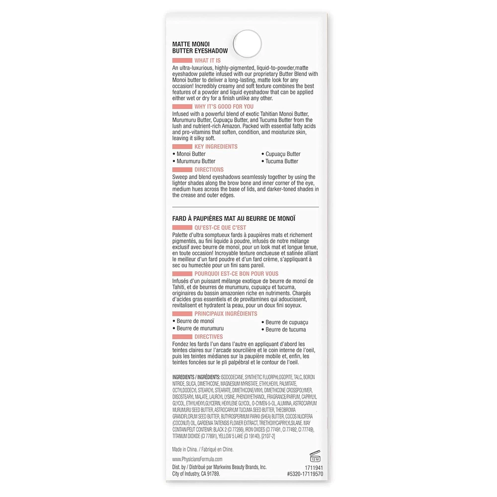 Eyes That Pop: Create the look of your dreams with color that pops. This liquid-to-powder eyeshadow palette includes gorgeous colors with a soft matte finish. Blendable and beautiful, this palette is perfect for natural and artistic looks. Nourishing + Moisturizing: Made with a blend of monoi butter, murumuru butter, cupuacu butter, and tucuma butter from the nutrient-rich Amazon, this makeup is packed with essential fatty acids and pro-vitamins that soften, condition, and moisturize the skin. Smooth Application: Whether you use a makeup brush or even just your fingers, cosmetics from the Butter Collection glide on with ease and seamlessly blend into the skin for attractive all-day coverage. Made for Sensitive Skin: Physicians Formula makeup is specifically formulated with your skin's health and comfort in mind. That's why we use high-quality ingredients, that leave you looking and feeling beautiful from the inside out. Cruelty-Free: All Physicians Formula foundations, eye makeup, lipsticks, and other cosmetics are always cruelty-free and never tested on animals. Embrace your inner goddess with this luxurious matte eyeshadow palette from Physicians Formula. Based on our iconic butter blend of Murumuru Butter, Cupuacu Butter, and Tucuma Butter, this enhanced 6-pan eyeshadow palette adds Tahitian Monoi Butter for a luxuriously creamy, skin-loving shadow that kisses your skin with the warmth of the tropics. Buildable and blendable with a long-lasting matte finish, these shadows are packed full of essential fatty acids and pro-vitamins that make you look and feel radiant. Apply either wet or dry for a finish unlike any other. About Physicians Formula: It all started in 1937, when leading allergist Dr. Frank Crandall created Physicians Formula as an expression of love for his wife Edith, who suffered from lupus and longed for makeup that wouldn’t aggravate her sensitive skin. Since then, we have continued Dr. Crandall’s concept of “healthy beauty.” To this day, every one of our products is carefully crafted and tested to meet our strict requirements: they are hypoallergenic, safe for sensitive skin and eyes, and created without any of the 150+ known harsh ingredients found in other personal care items.