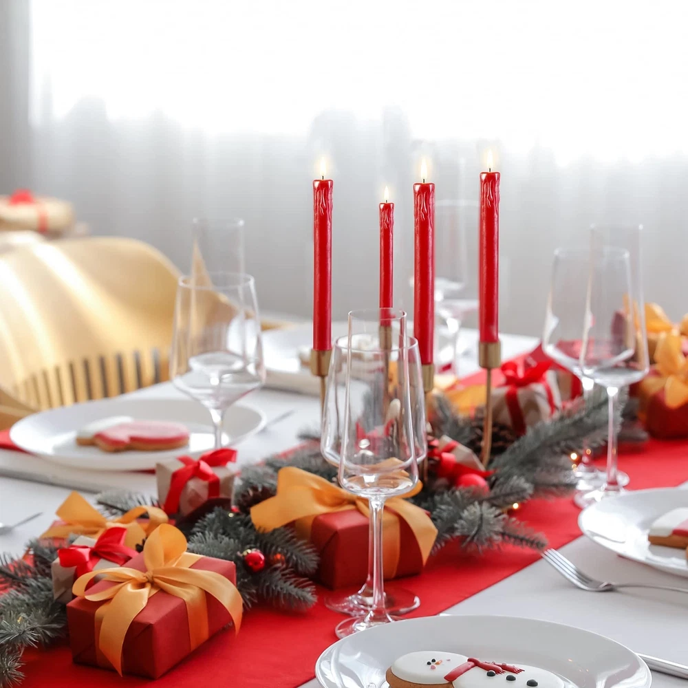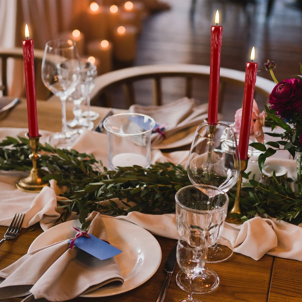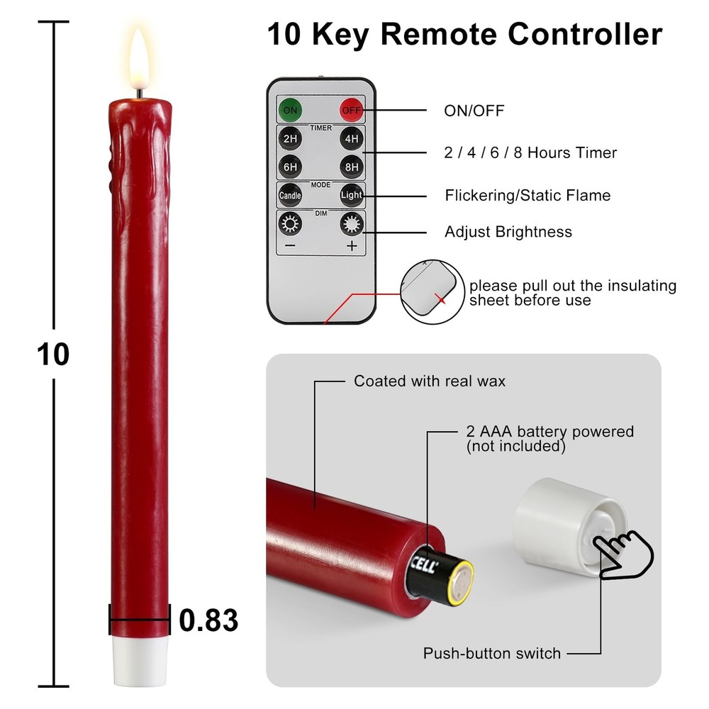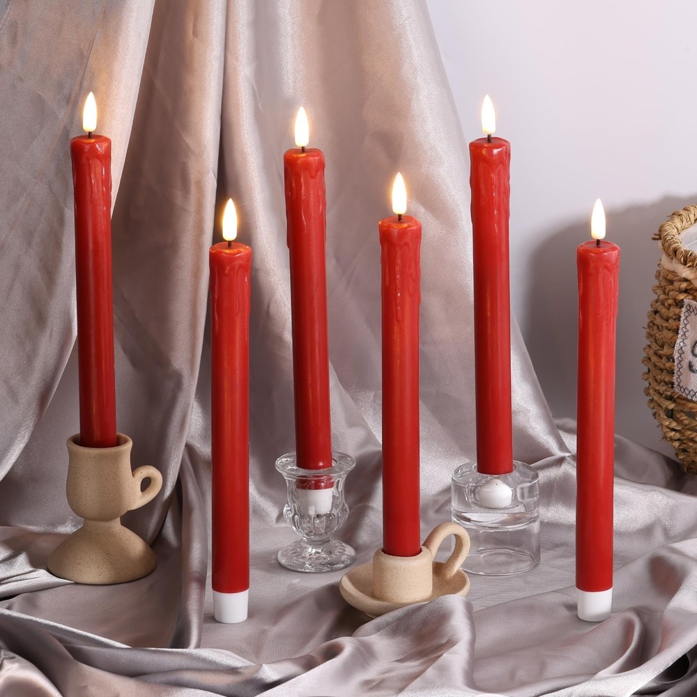 Eywamage Red Christmas Flameless Taper Candles with Remote, Realistic Dripping Wax Battery LED Candlesticks Set of 6 Product Details Color: Red Brand: Eywamage MPN: MA015-S6-Red UPC: Does not apply EAN: Does not apply Finish Type: Coated Product Dimensions: 0.86"D x 0.86"W x 5"H Lamp Type: Mood Light Shade Color: Red Shade Material: Plastic Finish Type: Coated Product Dimensions: 0.86"D x 0.86"W x 5"H Lamp Type: Mood Light Shade Color: Red Shade Material: Plastic Switch Type: Remote Style: Modern Brand: Eywamage Color: Red Special Feature: Cordless Light Source Type: LED Material: Paraffin Wax + ABS Room Type: Bathroom, Kitchen, Living Room, Bedroom Power Source: Battery Powered Number of Light Sources: 6 Included Components: 6 piece led taper candles, 1 remote and user manual Is Waterproof: false Mounting Type: Tabletop Wattage: 6 watts Number of Items: 6 Lighting Method: LED Indoor/Outdoor Usage: Indoor Number of Pieces: 6 Voltage: 3 Volts Is Cordless?: Yes Manufacturer: Eywamage Shade Height: 5 Inches Part Number: MA015-S6-Red Item Weight: 1.15 pounds Item model number: MA015 Batteries: 1 CR2 batteries required. Finish: Coated Special Features: Cordless Batteries Included?: No Batteries Required?: Yes Date First Available: August 24, 2024 Unique Tear-drop Design: stand out with these electronic taper candles featuring a distinctive dripping-wax shape, adding a modern twist to traditional candle aesthetics Rich Dark Red Hue: our dark red LED taper candles offer an elegant ambiance, perfect for adding a touch of timeless elegance to your home decor or festive celebrations Battery Powered & Long Battery Life: each taper candle takes 2 AAA batteries (not included), lasting over 350 hours; remote takes 1 cr2025 coin cell ( included) Convenient Remote & Timer Function: effortlessly control the ambiance with the included remote, allowing you to control power, adjust brightness, set timers, and choose from various flicker effects at the touch of a button within 20 ft Safe & Versatile Application: these flameless taper candles provide a safe and hassle-free alternative, ideal decor for home, Christmas, wedding party, events, also wonderful gift