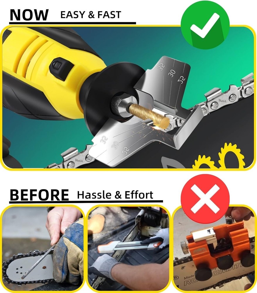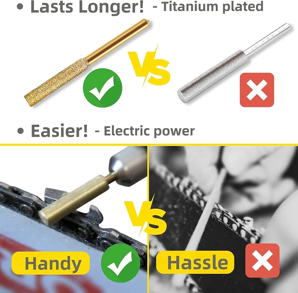 Electric Chainsaw Sharpener Kit with TITANIUM-PLATED Diamond Bits - High-Speed Chain saw Sharpener Tool and 6 High Hardness Sharpening Wheels For All Chainsaw Chains. Durable ➡ The latest, hardest titanium-plated diamond WHEEL we’ve ever made, owns a long lifetime. So you don't have to replace it often, 6 pcs [5/32''×2, 3/16'' ×2, 7/32'' ×2] of wheels are provided which can help sharpen any of the chains out there. Less but better. Easy to Use ➡ No chain removal required, No replacement parts needed, Only 4 installation steps are needed at the first time of usage, and an easy-to-follow VIDEO is provided. Let's simplify your sharpening work with this helpful Chain saw Sharpener. Fast Result ➡ This is a HIGH-POWER sharpening tool, which means that even sharpen the bluntest chain, you can see how quickly your sharpening work could be done just in a few minutes. And get rid of troublesome hand sharpening once and for all. This is a great replacement for hand chain saw file/ sharpener. Accuracy ➡ With the Angle Attachment' help, see how easily you can be a professional and sharpen chainsaw blade at an exact angle & depth, which can efficiently makes the chain razor-sharp & protects the chain from wrong-angle damage. Thus, getting you chain back to razor sharp is no longer a unique ability of hand files. Perfect Assistant ➡ This efficient chainsaw sharpener is the perfect companion for chainsaws. It sharpen the chain, protects the chain, makes work easier & safer than ever before. And the exquisite packaging makes it a unique and practical GIFT for father husband and logger. So, get it and you will find you are a cool working style leader!