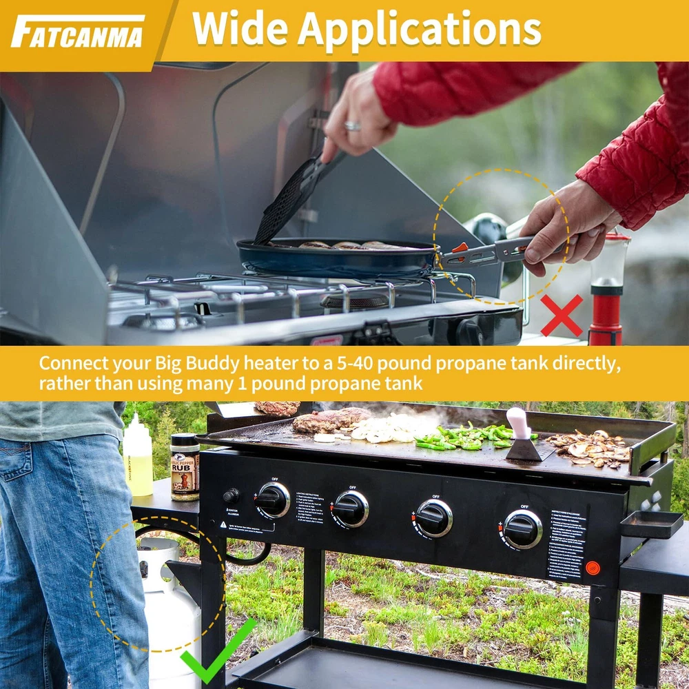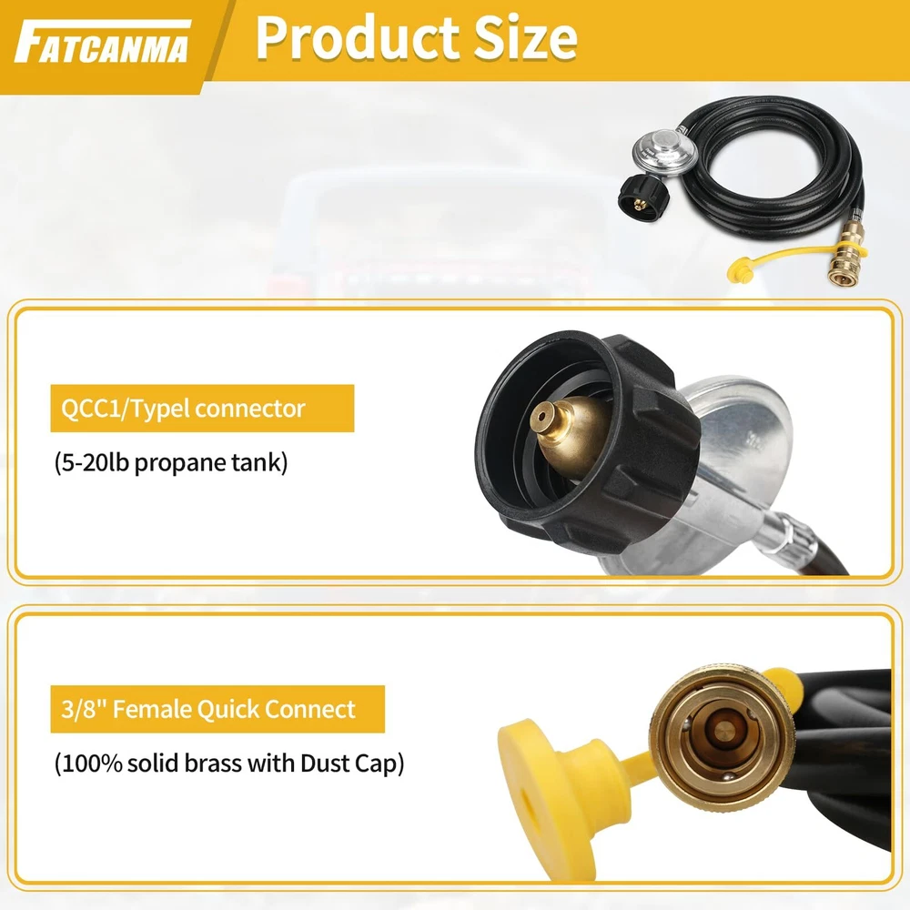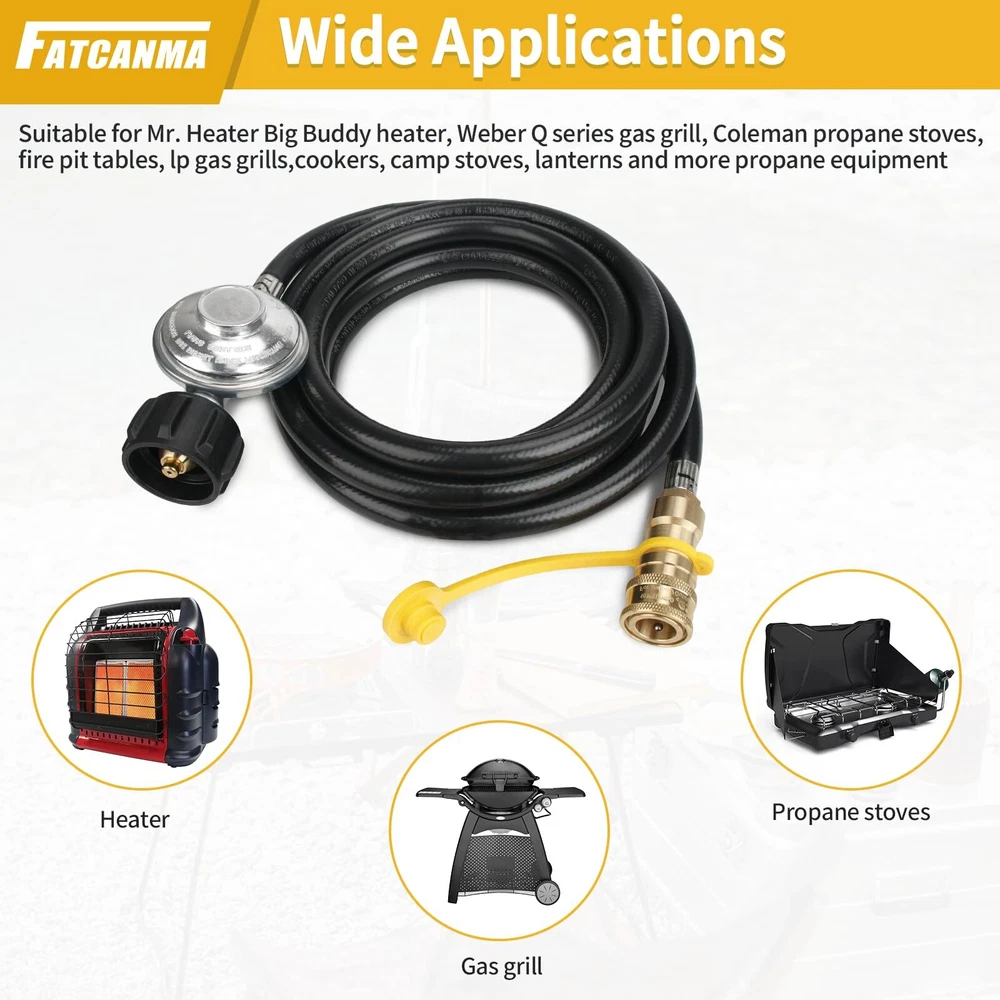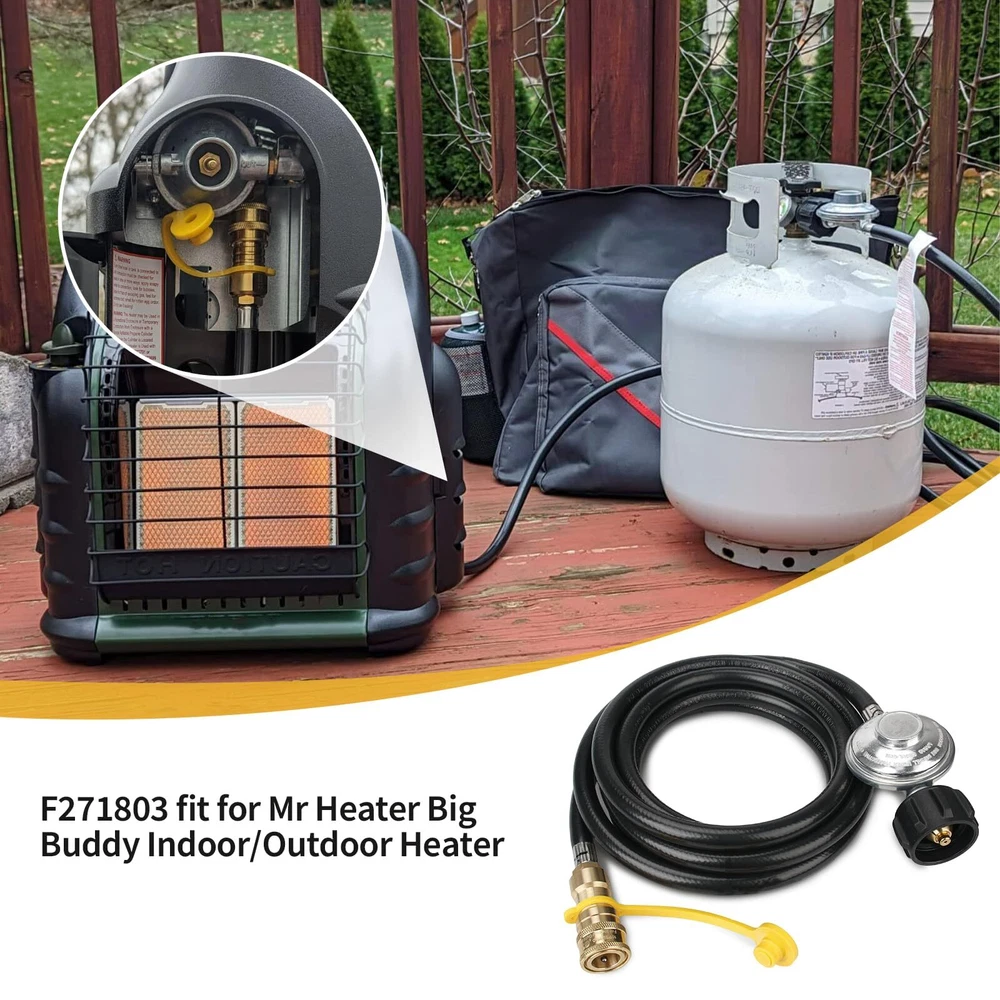 Only fit for Mr. Heater Big Buddy: The propane regulator hose assembly for use on Mr. Heater MH18B & F274830 Big Buddy indoor / outdoor heater. This quick connect hose only work on Big Buddy models, so please don't be for other heater models buy it Convenient to Move the Heater Freely: The 12ft long hose provides you with the flexibility to place the heater in the desired location, offering more choices for creating comfortable spaces, no longer restricted by the placement of propane tanksn Quality Propane Hose Regulator: High hose is made of high-quality brass and rubber tubing connection, high-quality air tightness, can prevent air leakagecan prevent air leakage Easy to Install: 12 feet propane hose with regulator are ready to use right out of the box. Connect the POL connector directly to the propane tank and tighten the connector by hand, no tools required Note:Please confirm the model and size before purchasing. If you have any questions about our F271803 12 FT propane hose with regulator, whether it is pre-sales or after-sales, please feel free to us through support for greater assistance
