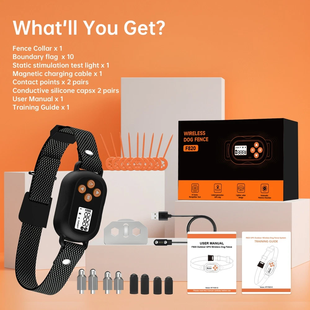 Model F820 improves upon the best-selling F800 model in critical ways: Latest generation GPS computer chip: Offers a stable GPS connection no matter how complex the environment with the ability to connect to multiple satellites at once, ensuring a stable connection whether you are in a dense urban setting or multi-acre property with mixed terrain (i.e. mountains close-by, trees, neighbours, etc). We tested this recently when a buyer based on a 5-acre property in Burpengary, north of Brisbane struggled to maintain a stable connection with the original F800 model but has had no issues at all with the new F820! Shorter Radius for More Domestic Uses: The minimum radius of the new F820 can be set as low as 23-metres from set point whilst the F800 original's minimum is 33-metres. This means more dog owners in smaller properties can benefit from wireless GPS dog fence technology than ever before! 40% Lighter than the Original: The new F820 is only a total of 98g combining collar and belt whilst the original F800 is 158g. This offer more versatility for fitting on small to medium dogs and less strain on your dog's neck overtime. Multiple Software Upgrades: F820 features the latest software upgrade with intelligent scene recognition, weak signal compensation, anti-interference and enhanced automatic dog protection mode. HOW IT WORKS Set up the central starting point for the e-collar and distance to the boundary. Minimum radius is 25 yards (approx 22m) and maximum radius is 999yards (approx 913metres). Install boundary flags a safe distance from the boundary limit. This is where you want the collar to warn your dog about progressing further before static or vibration correction. Choose whether you prefer to use vibration or static correction modes and if you want the collar to automatically increase the intensity level or fix it yourself at a specific level. Spend time training your dog to recognise the boundary flags and what to do when they hear the warning (training guide supplied). PRODUCT HIGHLIGHTS New lightweight design with latest generation GPS chip for best-ever stability in complex environments. New software upgrades for more effective boundary training, enhanced dog protection and more efficient power usage. Create a circular boundary around your property with radius distance from 25-metres (25 yards) to over 900-metres (999 yards). Flexible training with the choice of using vibration or static correction with five levels of automatic correction sequence. Intuitive boundary training correction automatically increases in intensity from levels 1 to 5, depending on the dog's behaviour. IPX7 completely waterproof e-collar allows your dog to take short swims or stay outside in any weather. Large 700mAh rechargeable Li-ion battery plus enhanced signal stability provides power to the collar for up to 48 hours on a single charge. (Note: It is advised to limit your dog wearing the collar to no more than 12 hours per day.) Collars will not interfere with each other if you need to contain more than one dog. PACKAGE INCLUSIONS 1 x Boundary Fence E-collar 2 pairs metal contact points (short and long) with conductive silicone covers Magnetic suction USB charging cable 10pcs yellow flags for boundary training 1x Test Bulb 1x Operating Guide 1x Training Manual. COLLAR SIZING Collar receiver size dimensions: 7cm across x 4cm tall x 3cm thick Belt size range: 23cm to 66cm neck circumference Total weight (collar and belt): 98g Ideal for dogs weighing between 6kg to 60kg.