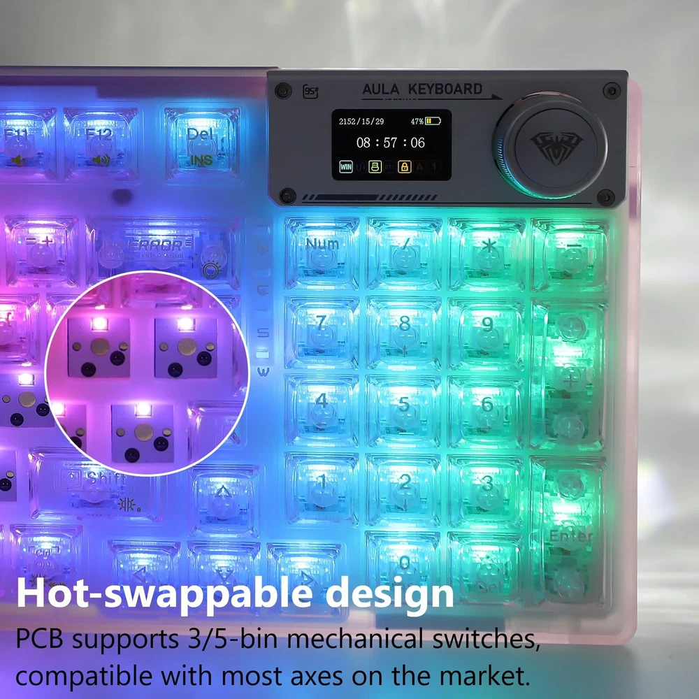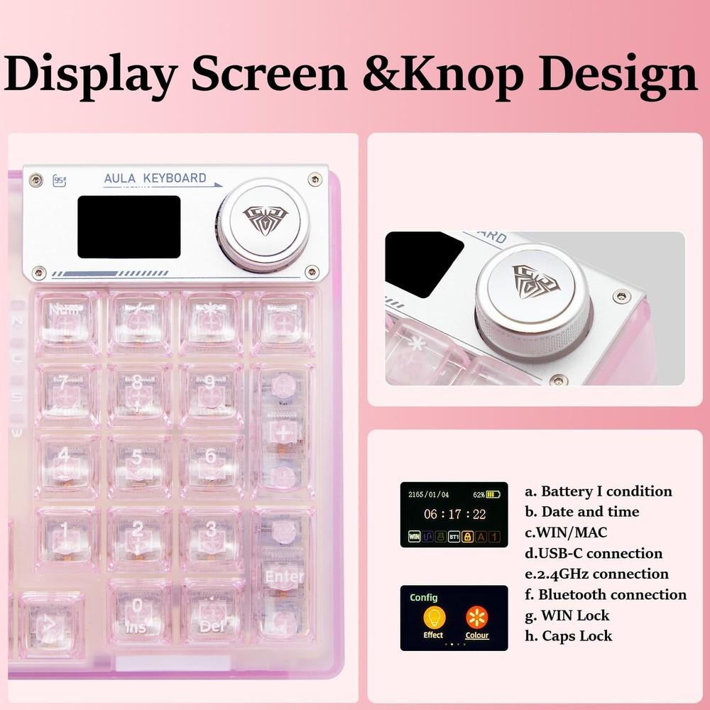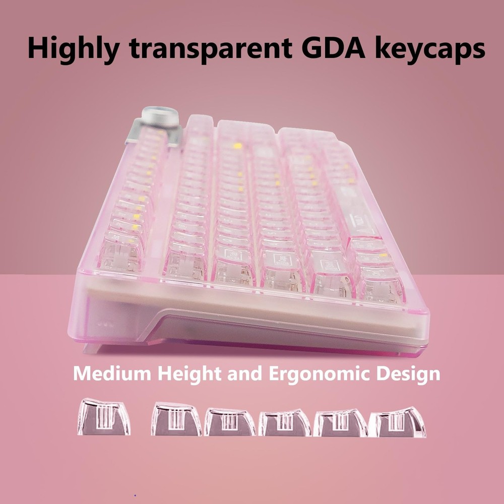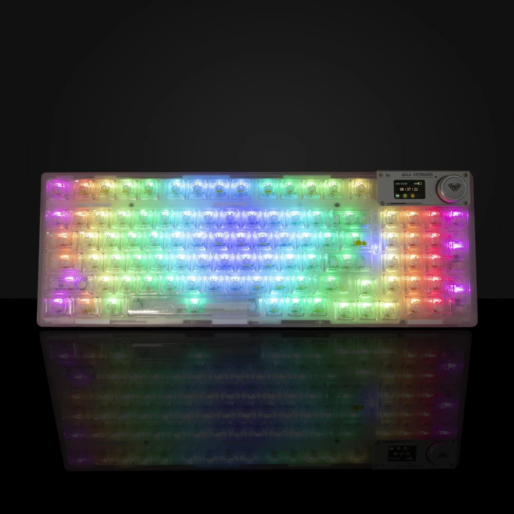 【Transparent keyboard with OLED smart display】The OLED screen casing is protected by an aluminum alloy, adding a mechanical touch to this stylish keyboard. the OLED screen switches between display screens by turning a knob. It is mainly divided into a main page, a GIF page, and a function settings page. On the function settings page, the user can adjust the keyboard connection mode, system switching, backlight mode, color, brightness, speed, volume control, and language selection with the knob. You can also customize and draw your own images and GIFs using software compatible with WIN(Driver software is not available for macos systems). 【Special Keycaps Hot Swappble Switch Mechanical Keyboard】 The hot-swappable design is compatible with commercially available PCBs and 3Pin/5Pin mechanical switches. It can be freely replaced even if one of the keys breaks, and there is no need to disassemble the keyboard to replace the axis body. It also provides fast response time. 【Transparent Keycaps】 This entire fashionable keyboard is designed with the ultimate in transparency and is made of high quality materials. The transparent shell and keycaps are designed to bring out the keyboard's 19 different south-facing RGB backlights. Even in dark environments, the RGB backlighting appears clear and bright. The keyboard's characters are printed using a proprietary printing process, making it durable and resistant to damage. It features a dual-layered foot support frame and a curved finger-contact design that minimizes fatigue even after prolonged use. 【Support for multiple system and device connections】The transparent wireless keyboard can quickly switch between Bluetooth 5.0 & 2.4GHz & USB-C connections through a combination of OLED smart screen or hot keys. The keyboard is powered by a 4000mAh battery, and a separate battery compartment is designed so that the battery can be replaced without disassembling the keyboard if you want to replace it with a higher capacity battery. It is compatible with laptops, Windows,and Android. No complicated connections are required, and the OLED smart screen can be easily switched with a knob. 【Mechanical Keyboard with Gasket】Adopting a gasket structure, the keyboard has a cotton multi-layer structure with sound deadening cotton cushion sandwiched inside the keyboard, effectively eliminating typing noise and voids when using this stylish, cute and transparent keyboard. The highly elastic silicone cushion reduces vibration generated during typing, making typing sound softer and more delicate to the touch. *If you need driver software, please contact us.