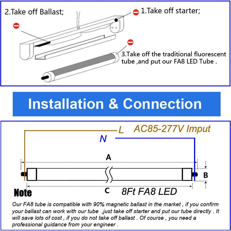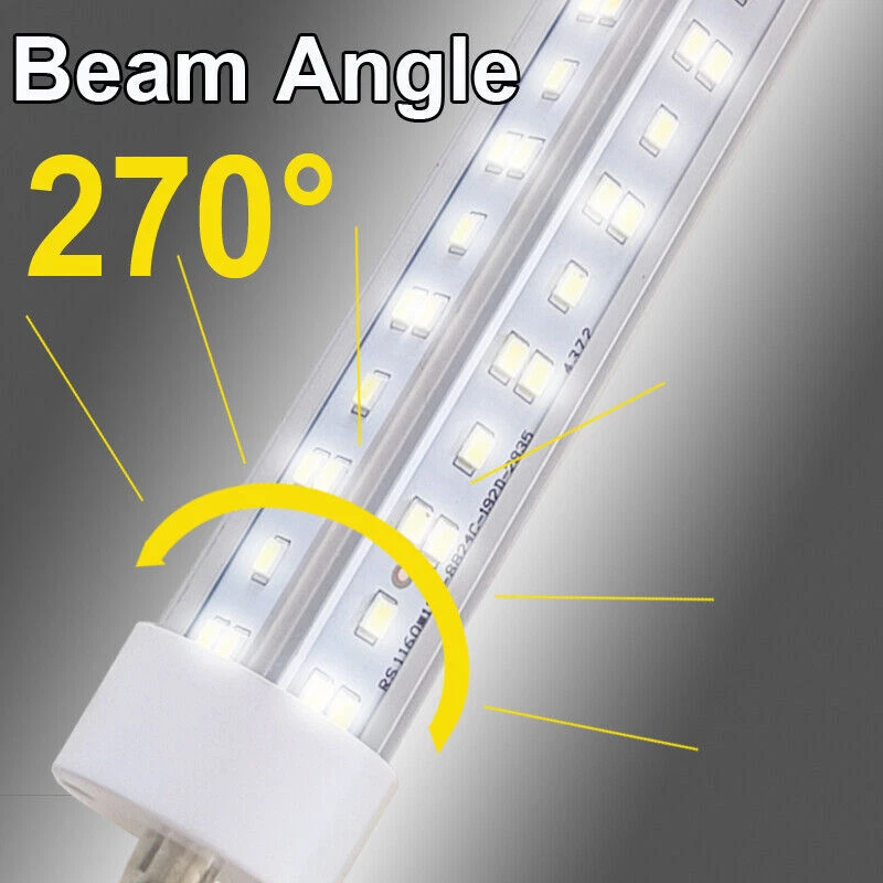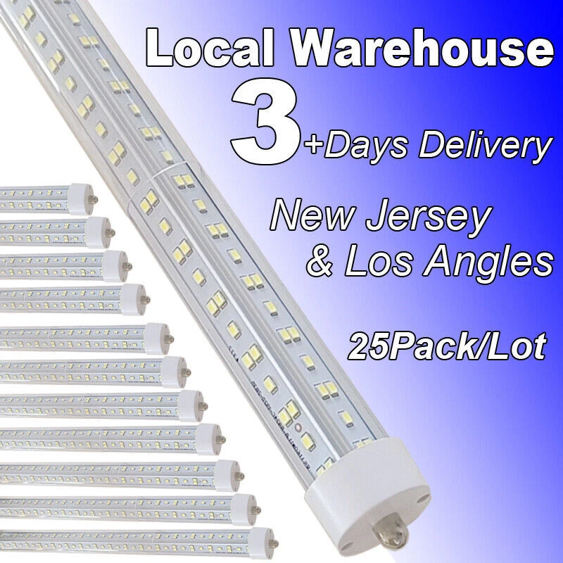 FAST DELIVERY - Ship from New Jersey or Los Angeles Warehouse via FedEx , 3-7 Days Delivered Your Door . SCIENTIFIC DESIGN - 8Ft LED Shop Lights Fixture is Made of 6500K Cold White SMD2835 LED Chip ,Plastic Clear Cover , Aluminum Bracket Housing ,and AC85-277V Constant Current Driver . It can work in -68F to 120F Temperature Conditions EASY INSTALLATION - The Integrated Tube Fixture Can be Install on Wall or Ceiling ,Easily Replace Traditional Fluorescent Tube Bulb . Plug and Play , Free Accessories (Power Cords, Connector , Extension Cords , Clip and Screw ) Come with Tube Lights Together WIDE APPLICATION - Linkable 8Ft Bulbs Widely Used in Garage Ceiling , Barbershop , Schools, Hospitals Basement , Factory Warehouses , Supermarkets Cooler Door , Offices, Shops,Hotels, etc FA8 T8 8FT LED Shop Lights Single Pin 144W LED Tube Light Bulbs 6500K 25PACK 【No RF & FM Interference】LED Driver have passed Electromagnetic Magnetic Compatibility EMC tests,No cause EMI ,No longer subject to any RF & FM jamming. Never interfering with the signal of your garage roller shutter door,No make noise when you listen radio 【Easy to Install】Just simply bypass the ballast and connection AC85-277V AC power . Not compatible with single-ended powered sockets 【Wide Application】 - 8Ft 144W V Shaped FA8 HO LED Bulb fitted to replace traditional F96T12 T8 T10 T12 fluorescent bulbs. Widely used in Garage,supermarkets, offices , convenience stores , gas stations , warehouse,parking lot,shops, hotels,Refrigerator,coolers or freezers illumination,etc 【High Output】8Ft 144W 18000LM FA8 【Rotate Cap & Swivel End】 Easy Adjust rotated Lighting Direction within 180 degree after Installation