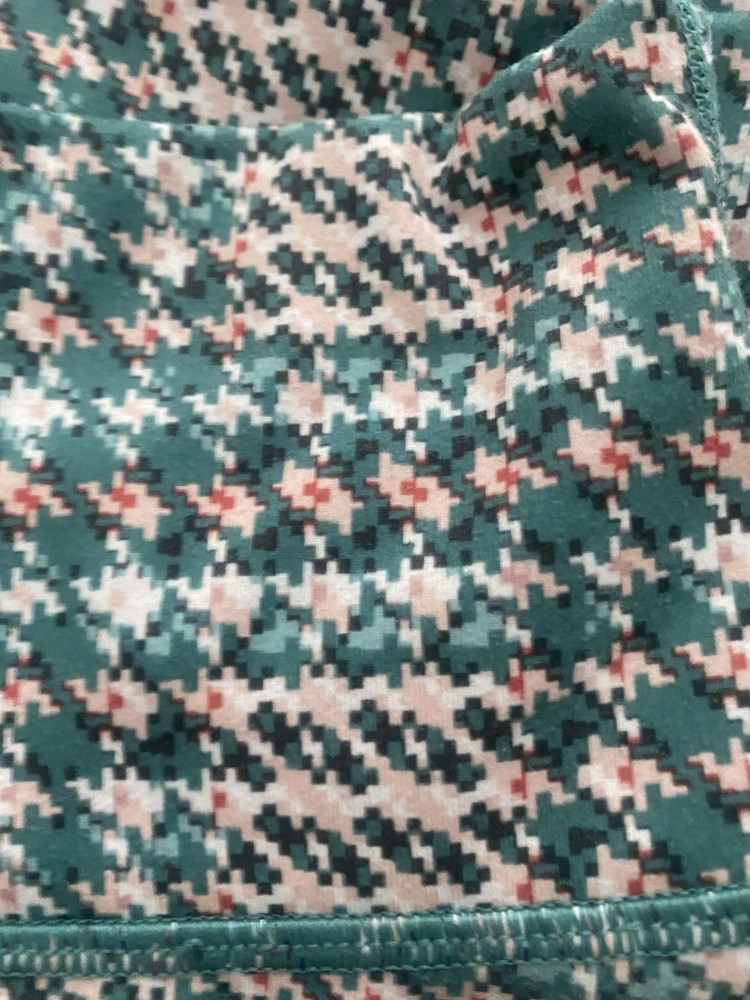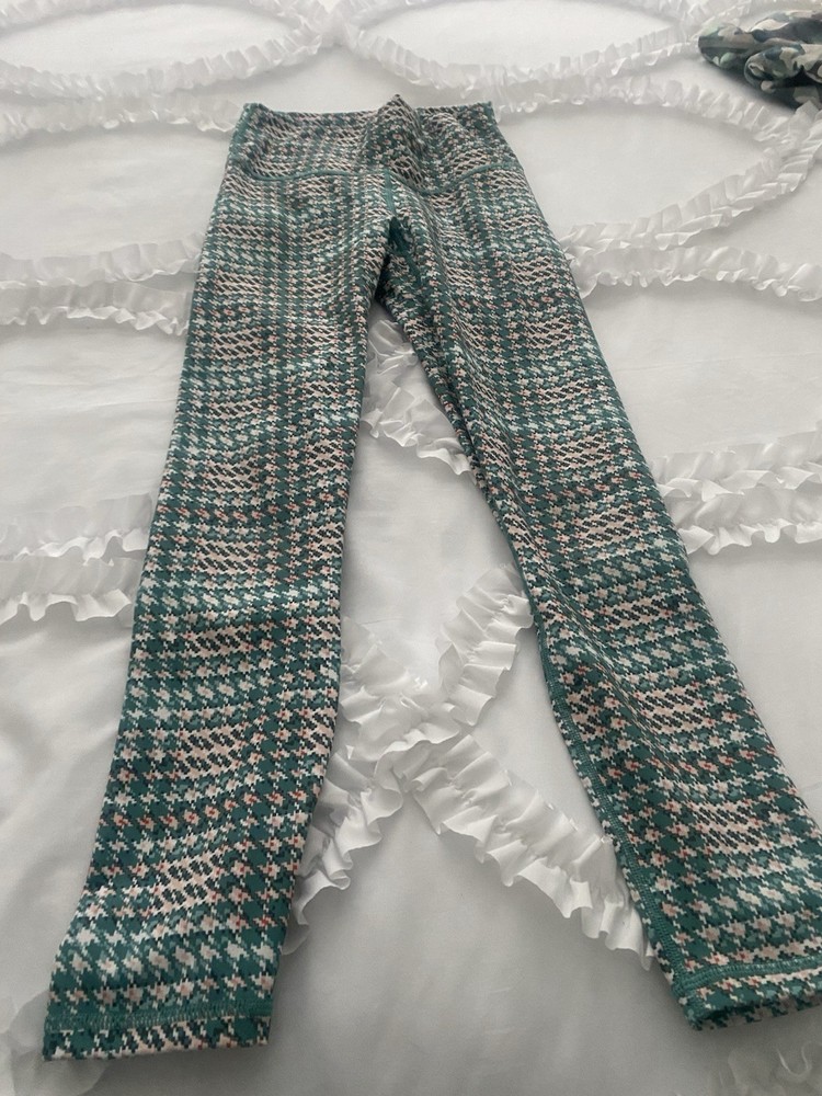 The product is a pair of Fabletics Define Power hold high-waisted leggings in a green check pattern, featuring a high-rise design with a length of 7/8. Made of a polyester blend material, these leggings are designed for women in a size 2XS. The leopard print theme adds a stylish touch to these leggings from the brand Fabletics, making them a fashionable and comfortable addition to any workout or casual wardrobe.