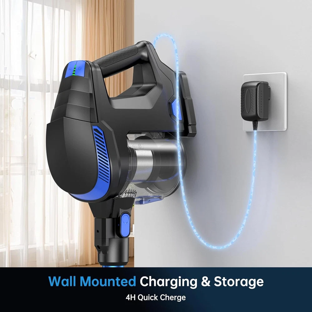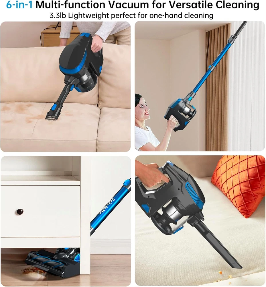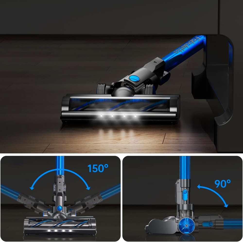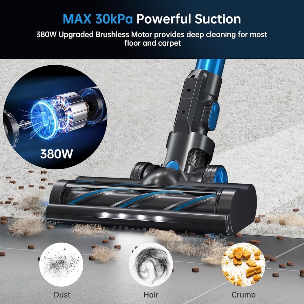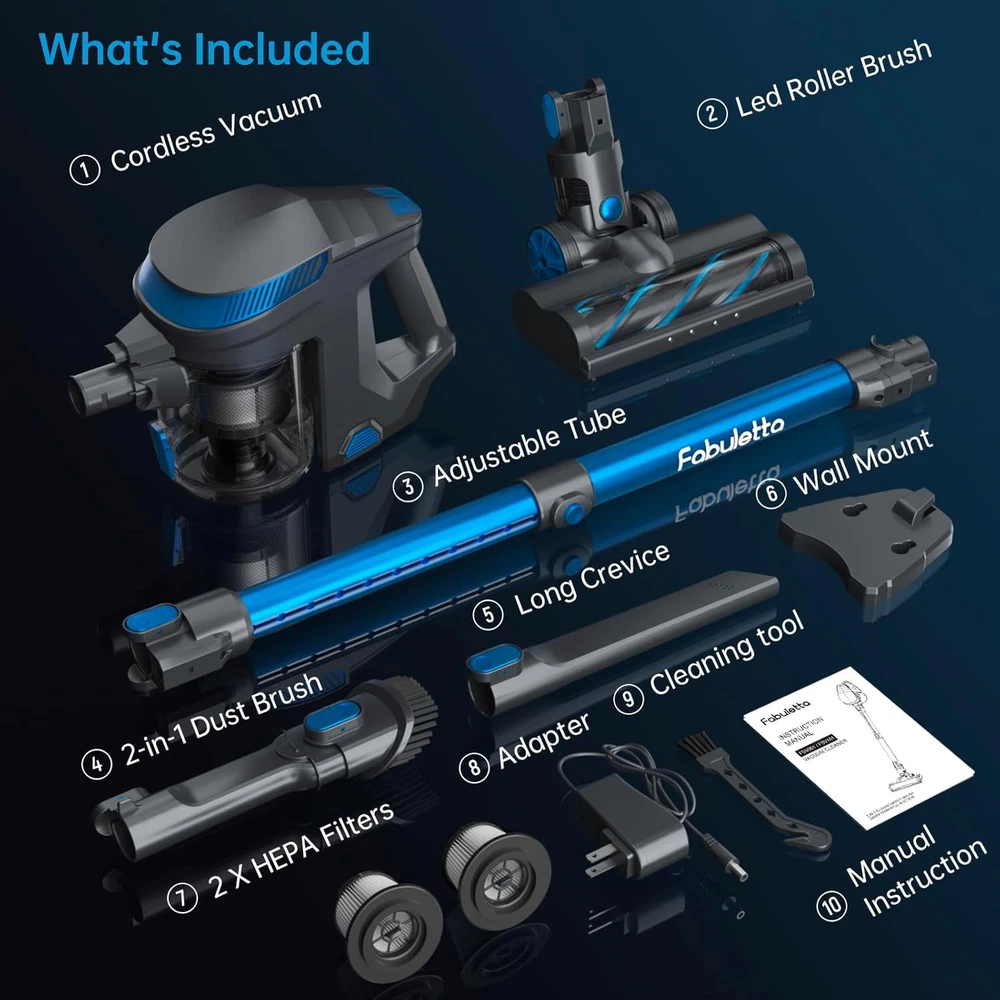 FABULETTA Cordless Vacuum Cleaner, 30Kpa/380W Stick Black-blue Product Details Brand: FABULETTA Special Feature: Brushless Motor, Max 30KPa Powerful Suction, Max 50mins Runtime, 8x2500mAh Detachable Battery, Cordless Filter Type: HEPA Filter Included Components: 2 HEPA Filter & Cleaning Tool, Power Floor Brush with Led Lights, Dusting Brush, Adjustable Telescopic Alloy Tube, Long Crevice Tool Is Cordless?: Yes Capacity: 1.5 Liters Wattage: 380 watts Runtime: 50 minutes Charging Time: 4 Hours Recommended Uses For Product: Carpet, Hard Floor Form Factor: Stick Color: Black-blue Model Name: FSV003 Product Dimensions: 17.5"L x 11.8"W x 7.6"H Battery Description: Lithium-Ion Noise Level: 75 dB Amperage: 12.84 Amps Battery Life: 50 minutes Manufacturer: FABULETTA Number of Items: 1 Controller Type: Push Button Motor Horsepower: 0.51 horsepower Control Method: Touch Style: Black-blue Number of Speeds: 3 Portable: Yes Number of Handles: 1 Number of Power Levels: 3 Number of Wheels: 2 Series Number: 3 Indoor/Outdoor Usage: Indoor Finish Type: Glossy Item Weight: 5.5 pounds Country of Origin: China Item model number: FSV003 Batteries: 1 Lithium Ion batteries required. (included) Finish types: Glossy Batteries required: Yes Battery type: Lithium-Ion Special Feature: Brushless Motor, Max 30KPa Powerful Suction, Max 50mins Runtime, 8x2500mAh Detachable Battery, Cordless Brushless Motor, Max 30KPa Powerful Suction, Max 50mins Runtime, 8x2500mAh Detachable Battery, CordlessBrushless Motor, Max 30KPa Powerful Suction, Max 50mins Runtime, 8x2500mAh Detachable Battery, Cordless See more Included Components: 2 HEPA Filter & Cleaning Tool, Power Floor Brush with Led Lights, Dusting Brush, Adjustable Telescopic Alloy Tube, Long Crevice Tool 2 HEPA Filter & Cleaning Tool, Power Floor Brush with Led Lights, Dusting Brush, Adjustable Telescopic Alloy Tube, Long Crevice Tool2 HEPA Filter & Cleaning Tool, Power Floor Brush with Led Lights, Dusting Brush, Adjustable Telescopic Alloy Tube, Long Crevice Tool See more Surface RecommendationPower Source: Hard Floor and CarpetBattery Powered VoltageItem Weight: 29.6 Volts5.5 Pounds 【Powerful Suction with Upgraded Brushless Motor】The FABULETTA FSV003 cordless vacuum cleaner is equipped with a high-performance Brushless Motor, with a maximum suction force of up to 30Kpa. Whether it's dust, dirt, or pet hair, this cordless vacuum cleaner ensures thorough cleaning on various surfaces, leaving your home spotless. Choose different suction modes(High/Middle/Low) according to different scenarios to reduce power consumption 【Up to 50 Mins of Runtime】The FABULETTA stick vacuum cordless rechargeable features a detachable 8x2500mAh large capacity battery, providing max 50 minutes of cleaning in standard mode. It only takes 4-4.5 hours to be fully charged, only a single charge can provide a thorough deep cleaning of the entire house, without stopping to charge the battery, allowing you to enjoy the fun of cleaning 【6-in-1 Multi-function Vacuum】] FABULETTA lightweight cordless stick vacuum cleaners for home come with Floor Brush with LED light, Long crevice tool, Dust Brush, and adjustable Telescopic Alloy Tube. The various attachments can deeply clean furniture, such as floors, short-pile carpets, beds, curtains, pet cushions, and even cars, capable of all kinds of tasks you need, bringing you the best cleaning performance and efficiency 【High-Efficiency Filtration System】FSV003 vacuum cleaner cordless equipped with 6-stage fully sealed cyclone filtration system, capturing 99.99% of dust particles as small as 0.1 microns. And release of ultimate purified air while effectively preventing secondary pollution, providing your family with fresher air. The large dust cup capacity allows multiple cleaning sessions without frequent emptying 【Flexible LED Motorized Floor Brush Head】The vacuum cleaner floor brush head has a built-in independent motor for extra power. The LED headlights of the floor brush illuminate the dust, debris, and hair under furniture or other hard-to-reach dark corners and track it. Flexible 150° sideways rotation and 90° up and down rotation let you clean the dust under furniture and bed. Relaxing your wrist and arm with an ergonomic handle