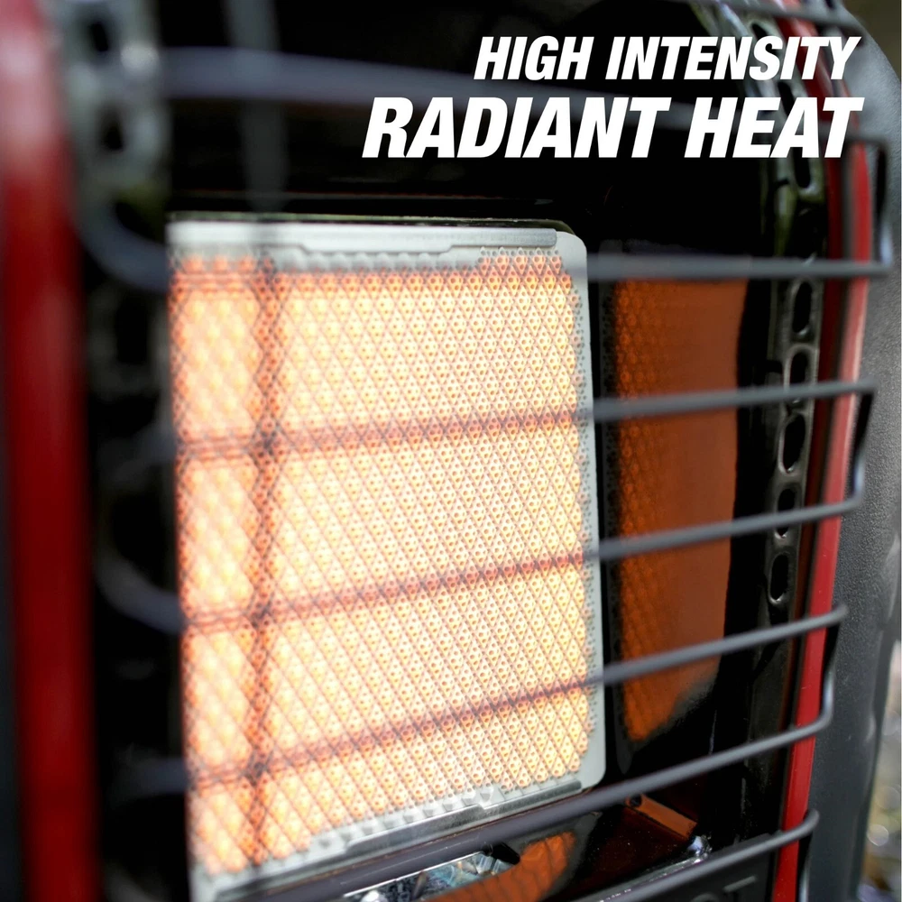 Model: Mr. Heater Buddy MH9BX Material: Wood, Aluminum, Brass, Ceramic, Steel BTU Heating Rating: 9000-9999 BTU Annual Fuel Utilization Efficiency (AFUE): 95-100% MPN: MH9BX Voltage: Not Electric Item Width: 9 in Item Length: 14 in Air Direction: 1-Way Power Source: Gas Operating Sound Rating: Standard Cable Length: Heater Type: Portable Heater Heating System: Radiant Brand: Mr. Heater Color: Red Control Style: Rotary Knob, Digital, Analog/Mechanical Area Covered: 201-250 sq ft Tank Capacity: 1 gal or Less (5 L) Mounting Location: Baseboard, Floor, Desk/Tabletop, Bulkhead, Cabinet Features: Auto Shut-off Number of Heat Settings: 2