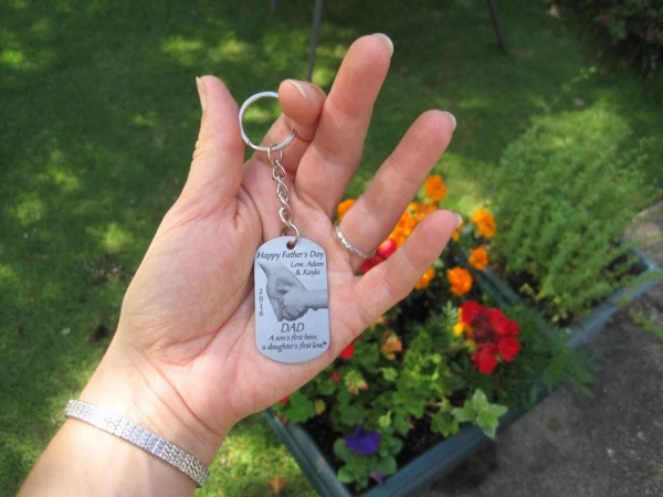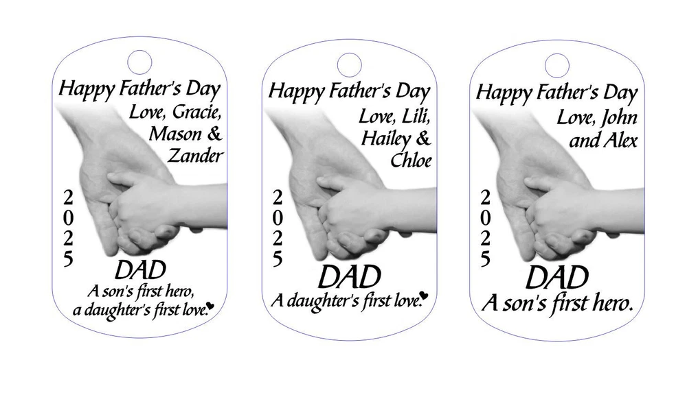 THE PERFECT GIFT FOR DAD! Dad A Son's First Hero A Daughter's First Love This is such a great quote for a special dad! This would be a wonderful gift. Personalized for free with his children's names. Personalization Options: 1. Children's Names 2. Choose Style: Son & Daughter quote, Daughter only, Son only Limited Space: No more than 4 names please. Our stainless steel dog tag keychains are similar to military tags but a little heavier and better quality. They are glass blasted to a satin finish, then engraved with a state-of-the-art laser machine. Actual size is about 1" by 2". You won't find these in stores! Please email me your personalized info after checkout or send through a message.