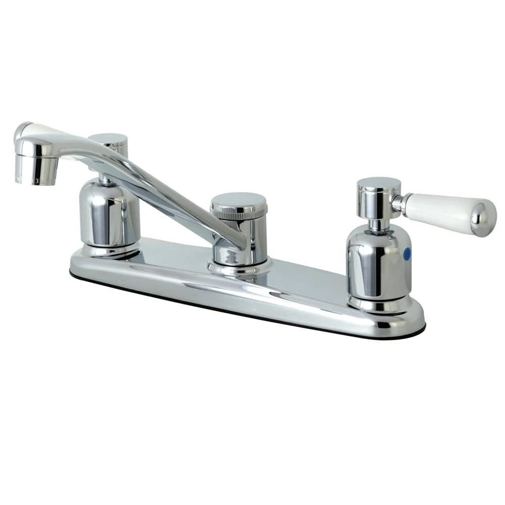Crafted to bring aesthetic beauty alongside exceptional performance, the feature of porcelain lever handles and rounded architecture solidifies pristine refinement in this faucet. Easily adaptable to any style, centerset faucets are admired for their single unit and ease of installation. The polished chrome finish will also add a glistening elegance to your kitchen ensemble. A sturdy brass construction and swivel abilities make for a reliant and long lasting fixture. Matching accessories are available for use. Solid brass, alloy and nylon construction Durable washerless cartridge Deck mount 8" centerset 2-hole installation 1.8 GPM/6.8 LPM spout flow rate at 60 PSI Standard 1/2" IPS connection 4-1/2" spout clearance 7-11/16" spout reach Lever handles meet ADA Guidelines Corrosion-resistant finish Designed for long-lasting durability