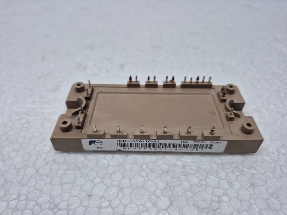 Insulated-gate bipolar transistor (IGBT) is a type of transistor with an insulated gate. It's a power transistor with a MOS input and a bipolar output transistor. The 7MBR15SA120 is an IGBT Module that operates at 1200V and 15A current and is often used to drive small to large motors in inverter circuits (for DC-to-AC conversion). Motor drive inverter applications, AC and DC servo drive amplifier applications, and uninterruptible power supply applications all use the 7MBR15SA120.