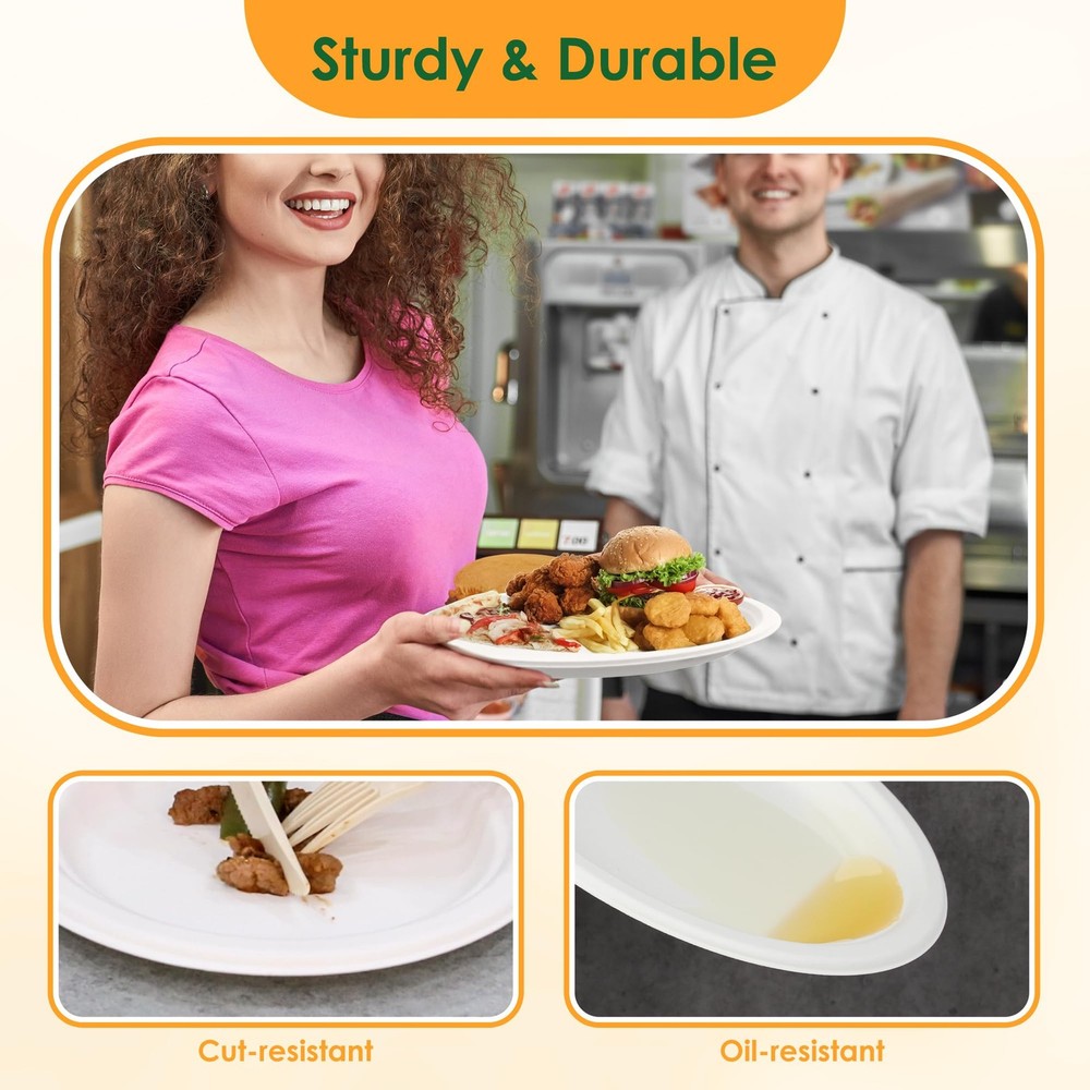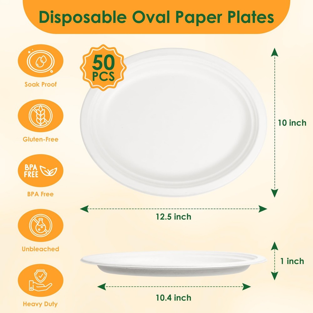 FEHHTO 100% Compostable Oval Paper Plates, 12.5Inch 50Pack 50pcs, Off-White Product Features Certified Products: Our biodegradable paper plates meet ASTM D6400 and D6868 standards and are FSC and SGS certified, showing our commitment to the environment. They are also BPI certified as 100% compostable products 100% Natural Material: Our oval paper plates are made from bagasse and contain no BPA, wax, or gluten. The 12.5-inch oval shape is perfect for dinner or lunch and convenient for everyday meals Oil and Cut Resistant: Our paper plates are sturdy and durable, with no plastic or wax lining. They can withstand many types of food, from sauces and dressings to meat grease, remaining cut-resistant and oil-resistant Sturdy and Durable: Disposable plates hold food firmly in place and retain their shape even when heated in the microwave or chilled in the refrigerator. These sugarcane plates can completely decompose within 3 to 6 months Suitable for Any Occasion: These high-quality plates are perfect for family gatherings, school events, office lunches, barbecues, picnics, parties, weddings, and more Shipping: Shipping is complimentary within the lower 48 US States. We Do Not Ship to PO/APO Boxes, HI or Alaska We Do Not Ship Outside of the Continental US All items ship within 24-72 hours of Payment For large items that require Freight shipping a valid phone number is required to call and schedule your delivery Terms of Sale and Feedback: Feedback is extremely important to us and eBay If you are satisfied with our transaction, please take a moment to leave Positive Feedback. YOUR Satisfaction is our #1 Priority! If there are any issues, PLEASE contact us BEFORE leaving a neutral or negative rating so that we may resolve any concerns. We PROMISE we can make you happy if you give us a fair chance. Returns / Concerns: All items qualify for returns within 14 - 30 days of receipt. Buyer is responsible for return shipping on any item that is not damaged Please be sure this is an item you want before making your purchase. Customer Satisfaction is our TOP priority! All items are IN STOCK at time of listing. Inventory on eBay changes constantly and it is impossible to maintain a perfectly accurate count of all items. Please do not penalize us if we have to issue you a refund! Thank You For Your Business!