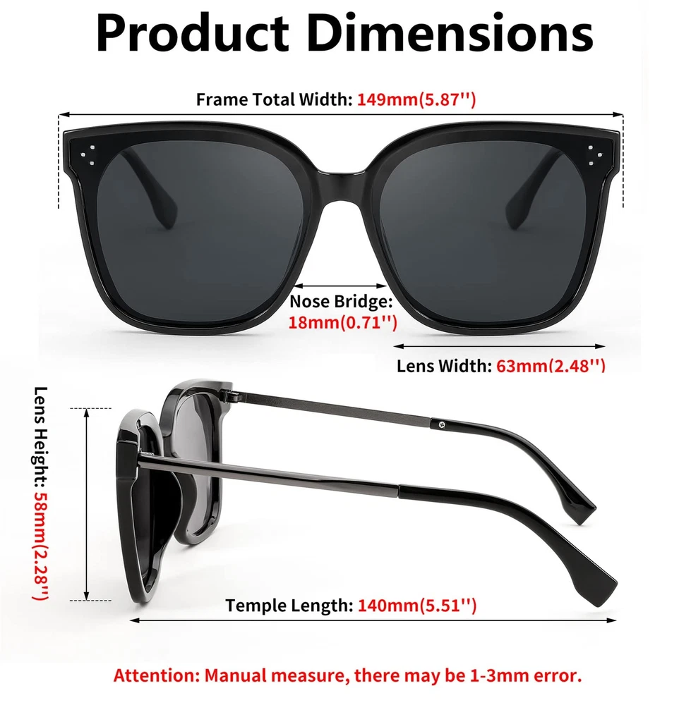 FEISEDY Retro Design--Oversized square frame sunglasses make you more stylish. Nice quality frame, good texture, anti allergy and suitable for any face and comfortable to wear. Polarized Lenses – FEISEDY polarized lenses filter out sunlight reflected glare, protect your eyes from long-term damage by blocking 100% of harmful UVA and UVB rays. These FEISEDY square sunglasses are made of high-quality frame material, UV400 lenses, solid metal hinges, all the details ensuring you a long time using.The one-piece nose pads design makes it wears comfortable without pressure on face or nose. Adapt to All Occasions -- such as walking, driving, shopping, taking photos, and is suitable as high fashion accessory and daily wear all year round. It is also gift ready, making it a wonderful yet practical gift idea for friends and Family. Product Dimensions -- Lens Width: 63mm(2.48''), Lens Height:58mm(2.28''), Temple Length: 140mm(5.51''), Nose Bridge: 18mm(0.71''), Frame Total Width: 149mm(5.87''). Attention: Manual measure, there may be 1-3mm error.