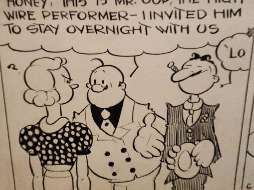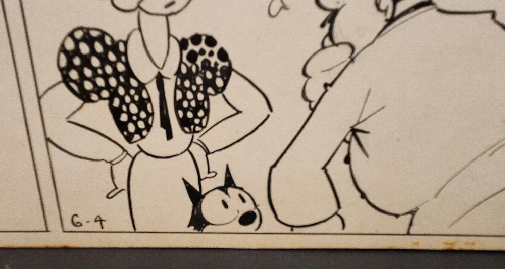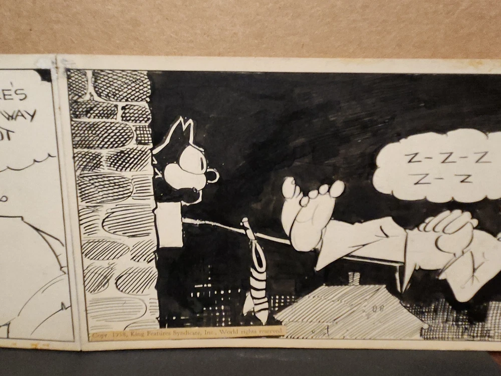 Greetings. Offered for sale is the original artwork for the daily comic strip FELIX THE CAT by Otto Messmer (1892-1983). Description : -Art Type: Daily comic strip original artwork. -Medium: Pen and ink over pencil/graphite on art board. -Publisher: King Features Syndicate, Inc. -Publication Date: June 4, 1938 -Dimensions: 27.125" wide by 5.75" tall (board dimensions; image slightly smaller) -Signed: No. -Description: This is the original artwork for the 6-4-1938 daily comic strip Felix The Cat by Otto Messmer. Felix was Garfield and Heathcliff long before they existed. Star of cartoons, comic strips and comic books, Felix was a cultural touchstone for the first half of the 20th century. Pat Sullivan was credited with creating the character in his animation studio, but the comic strip was drawn by the wickedly talented Otto Mesmer. In this daily, Pop has invited Mr. Oop, a high wire artist, to spend the night. Mom is not pleased as all of the guest rooms are occupied. No worries, as Mr. Oop clearly feels right at home on the clothes-line. Felix is shown in two of the three panels. A cute gag brilliantly rendered by Messmer. TDI Condition : -The art is in very good to excellent overall condition. The board is scored between the second and third panels (probably for mailing). It is able to be folded in half (and will be so shipped). Neat tape reinforcement to reverse. Minor to moderate age/handling wear. Pencil notes to reverse. Shipping/Payment : - Domestic buyer pays $35.00 for USPS priority mail shipping (includes tracking and insurance); this also includes packaging/handling charge. - International buyers please note that international shipping is handled by eBay international shipping. - Customs fees , duty, charges and taxes, including VAT, are NOT the responsibility of the seller and are the sole and exclusive responsibility of the buyer. - Payment is due upon purchase/auction ending. If you wish a non-standard payment method, please message me to discuss. Thank you. Please check my other listings for a selection of comic strip original art, comic book original art, books, graphic novels, music CDs, DVDs, knives, and other collectibles.