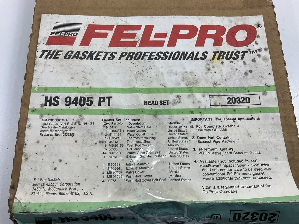 Fel-pro part number HS9405PT. 2.5L PLEASE NOTE: ORIGINAL PACKAGING MAY BE TORN OR DISTRESSED. WE RESERVE THE RIGHT TO OPEN AND VERIFY THE CONTENTS OF ALL GASKETS. WE WILL SHIP IN THE MOST ECONOMICAL WAY POSSIBLE BY ROLLING UP OR FOLDING OVER THE ORIGINAL PACKAGING WHEN POSSIBLE (EXAMPLE: RUBBER VALVE COVER GASKET). Free Shipping is for continental USA only. If you live in Alaska, Hawaii, or PR please contact us for a shipping quote before bidding. Packaging appearance and condition may vary. Examples include torn and distressed packaging and packaging that has been opened to verify contents. Items may contain shelf wear or imperfections due to the age of the product. Fitment: Applications are provided through literature and research and are correct to the best of our knowledge. Listed applications should be used as a guide and may fit additional vehicles. Please verify the part that you are ordering fits your application prior to purchase. Please contact us if you have any questions before purchasing. Shipping: Free Domestic Standard Shipping! Expedited shipping is available at an additional cost. Free shipping applies to continental US, Hawaii, Alaska, Puerto Rico and US territories. International shipping is available. Contact us before purchasing and we will determine the best rate. Items are shipped the next business day after receiving full payment. Returns: We gladly accept returns 30 days after purchase. Items must be returned in the condition that they were sent for a full refund.