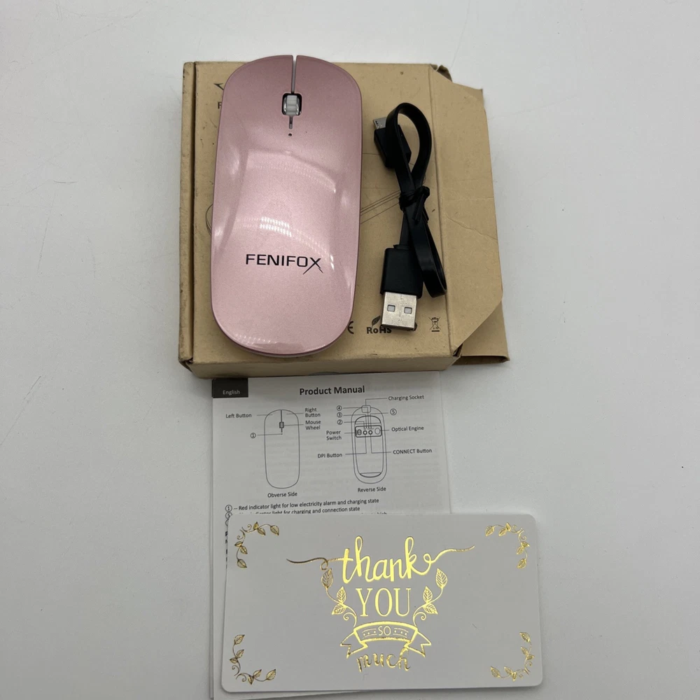 📝 Item Description: Brand: FENIFOX Color: Pink Type: Wireless Bluetooth & 2.4GHz USB Mouse (Dual Mode) Power Supply: Built-in rechargeable battery Charging Port: Micro-USB Condition: Good pre-owned condition. Fully functional. Cleaned and tested. ⸻ 💡 Features: • Ultra-thin and lightweight design – perfect for travel or commuting • Silent click buttons – ideal for office, library, or nighttime work • Dual-mode: connect via Bluetooth or USB receiver • Can be used while charging • Compatible with Windows, macOS, Android, Linux, Smart TV • Wireless range up to 10 meters ⸻ 📦 Includes: • 1x FENIFOX Wireless Mouse (Pink) • 1x Micro-USB charging cable ⸻ 🔍 Perfect for: • Travel • Students • Home office setups • Noise-sensitive environments ⸻ 🔑 Search Tags (SEO): fenifox mouse, slim wireless mouse, pink bluetooth mouse, rechargeable usb mouse, quiet mouse, silent click, laptop mouse, portable wireless mouse, computer accessories, office mouse