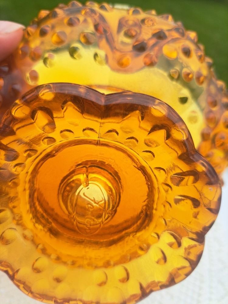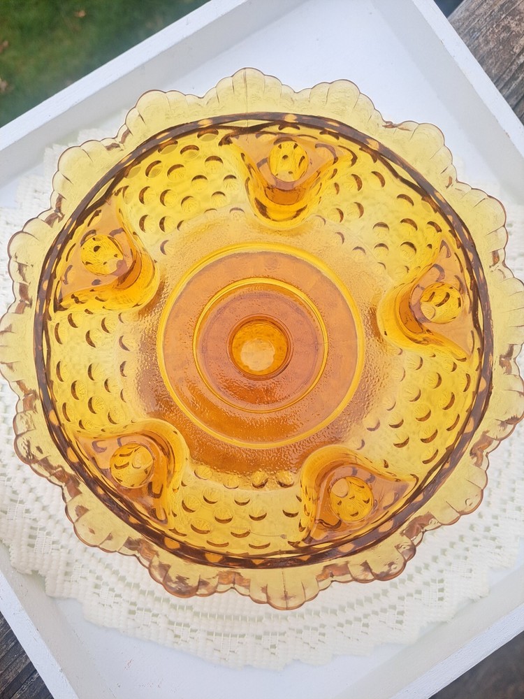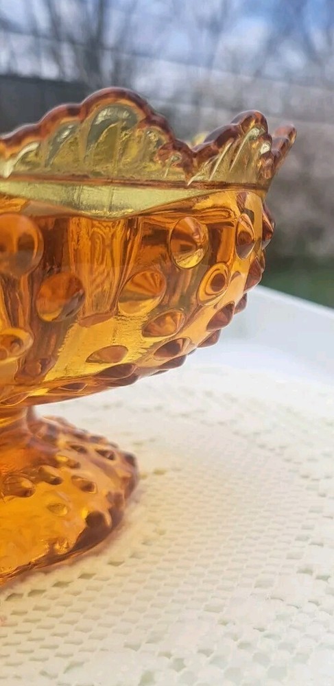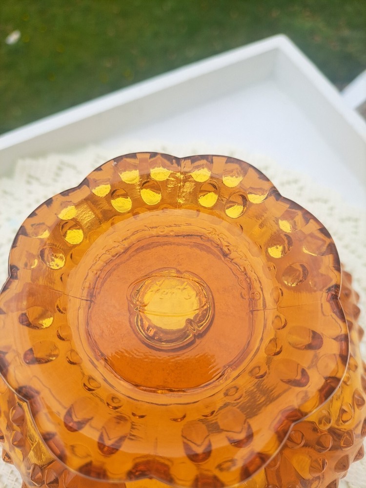 Add a touch of vintage elegance to your home decor or tablescape with this beautiful Fenton Amber Hobnail Footed Candle Bowl. This amber candle holder features the vintage, classic hobnail design and can also be used as a candy or anything dish! Fenton is known for its exceptional quality and beauty. Would look fabulous in a Fall tablescape and decor! It's radius is about 6 1/2 inches and stands about 3 1/4 inches high. This is true vintage.