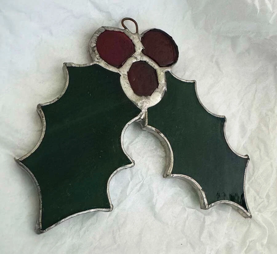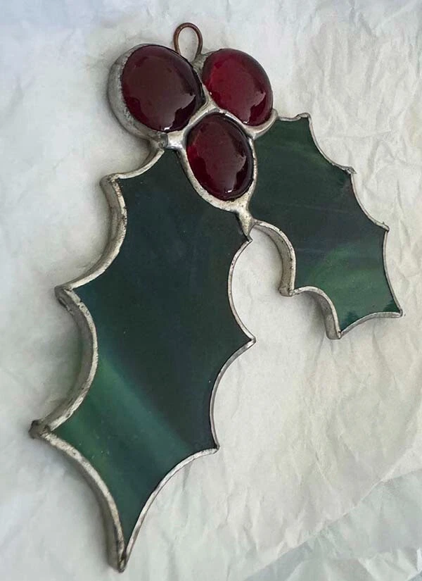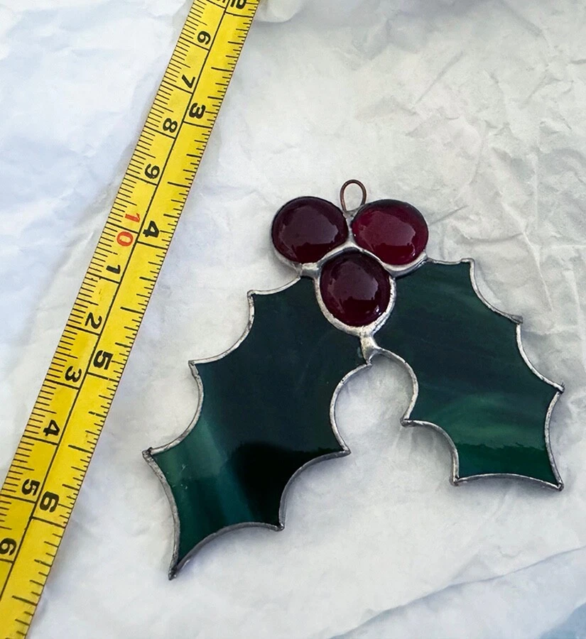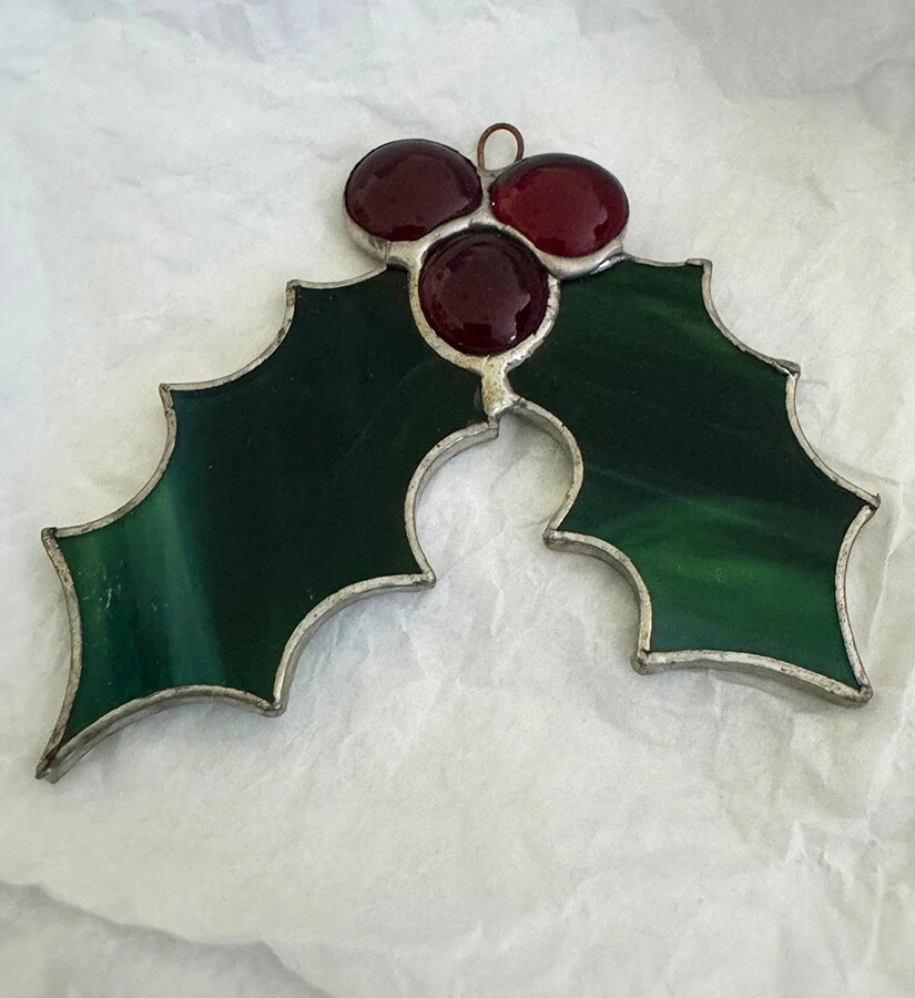 Add a Touch of Artistic Delight to your Christmas & Holiday Décor with this Colorful Christmas Ornament. ** FESTIVE COLORS ... RED & GREEN STAINED-GLASS HOLLY BERRIES & LEAVES .... *Couldn't find a brand mark. Looks Hand-Made., Perhaps Home-made...with Joy.... *Very Good /Good condition. Pre-Owned, Craftsmanship is Average. Probably Home-made. Has some wear and aging. *Please see photos above as part of item description. Color may vary from actual Ornament in Photos. Ships via USPS mail. Carefully wrapped. No International Shipping. Ships in US only. Thank you. HAPPY ALOHA HOLIDAYS! See our other rare and interesting items up for sale on eBay, including Tiffany & Co ornaments and other rare special items