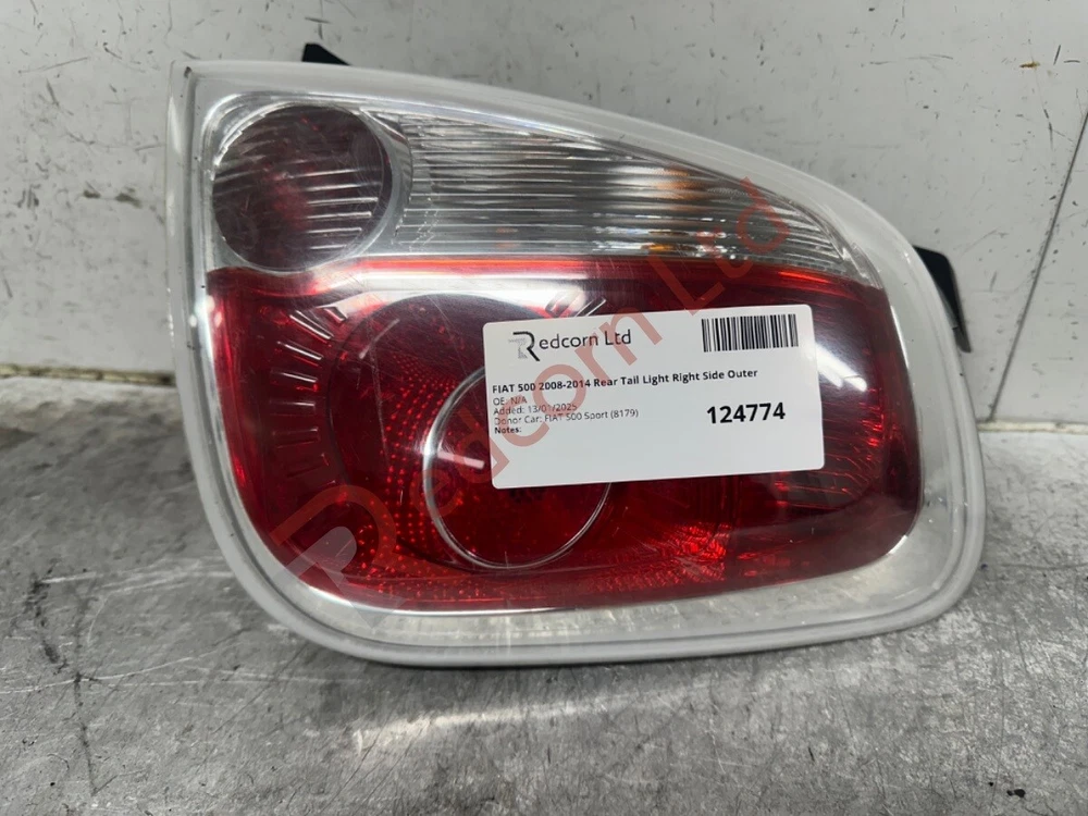FIAT 500 2008-2014 Rear Tail Light Right Side Outer Mon-Fri: 8am-5pm | Sat: 8am-3pm | Sun: Closed STORE ABOUT CONTACT FEEDBACK FIAT 500 2008-2014 Rear Tail Light Right Side Outer Manufacturer Part Number: Not Available SKU Code: 124774 Part Number: 118442 Grade: A Please note that goods CANNOT be held; goods aren't confirmed until payment has been completed This Part's Donor Vehicle Vehicle/Model: FIAT 500 Sport Bodywork Colour: WHITE Interior Trim Colour: Not Available Interior Fabric Colour: Not Available Manufactured Year: 2009 More From This Vehicle DonorVehicle:8179ID More From Similar Vehicles SimilarVehicle:18448NUM Information & Compatability Compatibility is provided on listings to give an indication of some of the cars this part will fit. However, it may not fit your car due to the many differences with specification and changes on model years. Please take eBay's compatibility as a guide. The best and the easiest way to quickly check if the part is right for you is to compare part numbers. We are experts; so, if in doubt please call or message us and our technical team will be happy to advise. Please be aware that our products are sourced from recycled, used cars. The parts are fully functional, tested and have been removed from UK spec, right hand drive vehicles unless otherwise described. However, please note that you can expect general wear and tear corresponding to normal usage for a car of that year and mileage. Any significant damage or defects will be as listed in the item condition. All mechanical items sold from our site for £5 or more benefits from an automatic 14 day REPLACEMENT guarantee. Should any mechanical item with a value over £5 prove defective within 14 days of purchase please contact us and we will arrange for a suitable replacement to be dispatched to you. All items shipped out are security marked - any security marks showing evidence of the item being tampered with, (especially electrical items), will not be refunded or replaced. All engines and gearboxes are tested before removal from the doner vehicle unless otherwise stated. We take every effort to ensure accuracy in our listings but we can offer no guarantee of colour code being available and if it will be a 100% match to your vehicle due to fade and wear and tear. Coloured body panels should be assumed that a repaint will be required. Customers should note that all items sold with a warranty are engraved & marked with security paint. It is in your interest not to interfere with these markings as signs of tampering will void your warranty guarantee. Find Us For any help or advice with this part please get in touch. We are here to help. Please find us on Google Redcorn Ltd . Office Opening Times: Mon-Fri: 8am-5pm, Sat: 8am-3pm, Sun: Closed. eBay Messages will be replied to within business hours. Collection is welcome. Brantwood Rd, London, N17 0DX Redcorn Thank you for choosing Redcorn Ltd for your used car parts. We are salvage car specialists and provide the market with excellent quality used car parts online direct to you. If you require a part for this car which is not listed on our shop please send us a message with your requirements, we will be able to source the part and provide a new listing for you. Huge Range We recycle over 100,000 vehicles per year. After Sale Support We pride ourselves on our aftercare; just contact us for help. Massive Range of Stock We keep a huge range of stock in our purpose built facility. Money Back Guarantee You can get a full refund if you return the goods within 30 days. CONTACT DETAILS Address: Brantwood Rd, London, N17 0DX Phone: 020 8880 9555 QUICK LINKS Our Store About Us Contact Us Feedback REDCORN LTD We have thousands of parts in stock, with new items arriving weekly. Everything you see on our website is in stock ready for immediate dispatch. © Copyright 2024. Redcorn LTD. All Rights Reserved. Powered By Eladene Systems