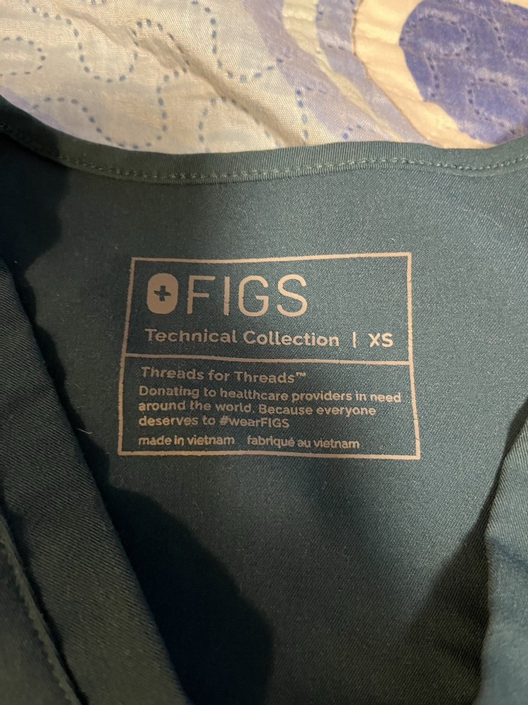 Measurements and conditions as shown in photos The FIGS scrub top for women in XS size is a solid blue color with a V-neck and short sleeves, made of polyester material. Designed for the medical industry, this top is suitable for nursing professionals. The top does not have a personalized design, making it a practical and stylish choice for those in need of a technical medical scrub. Made in Vietnam, this FIGS scrub top combines functionality and style for the healthcare workforce.