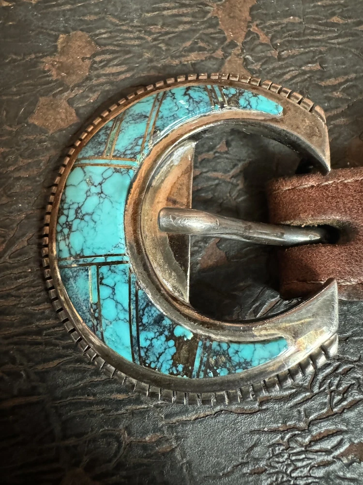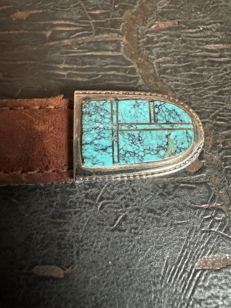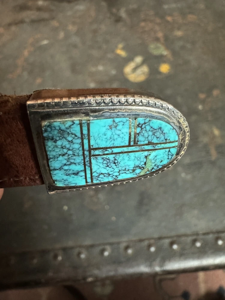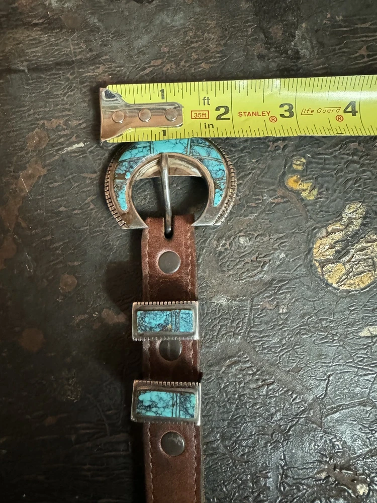 Signed FIJ 925 Sterling Silver Turquoise Inlay 4 Piece Belt Buckle Set. Buckle, 2 keepers and tip. Measurements provided in photos which act as description. Fits 3/4” belt. Very good condition. I don’t know if the tip was manufactured to open for removal but one end of the back strap is disconnected(photos provided). May have been constructed as such. I don’t know. I don’t see how it could have been removed from a belt had this not been done. At any rate, full disclosure. Hardware is currently installed on an Oil Tanned Harness Leather Belt, size 42. The ends are 3/4” wide and the body is 1.25”. The belt is 48” long. Very few pictures of the belt because I wanted to highlight the buckle set. The belt is in very good condition, solid brown. We aim to please! Thanks for looking!