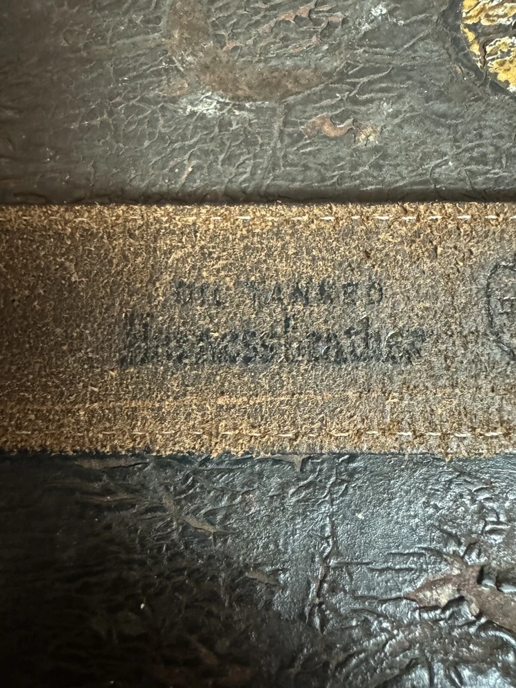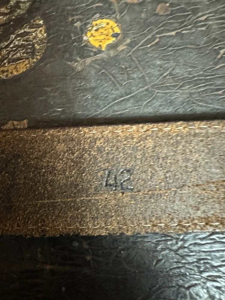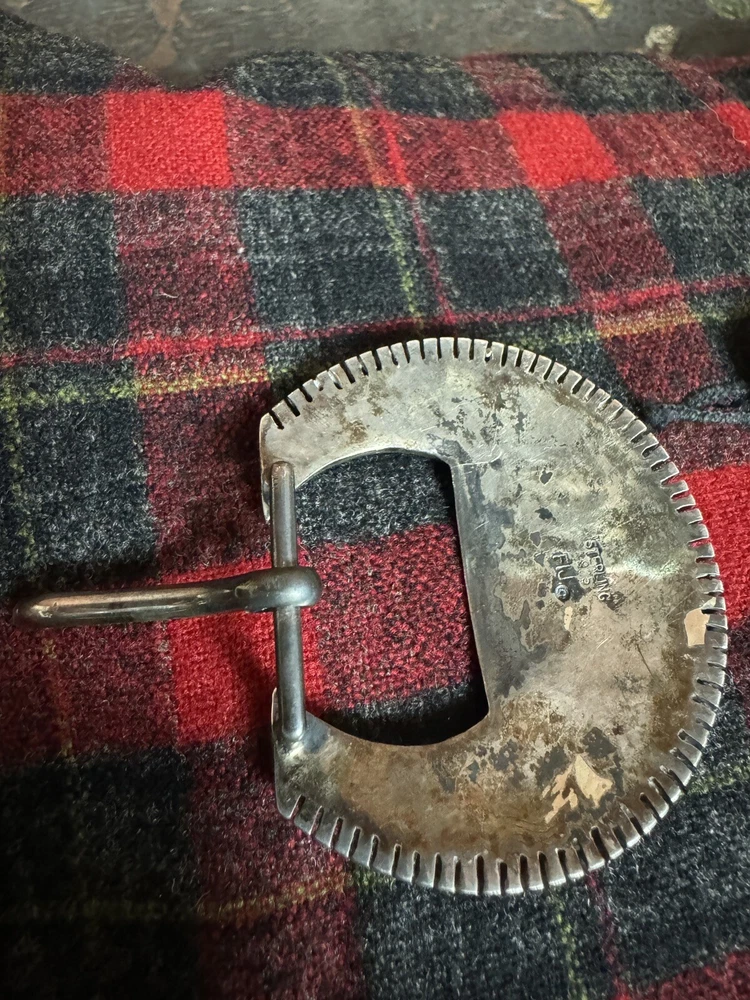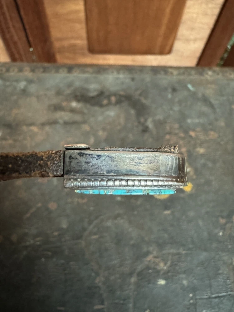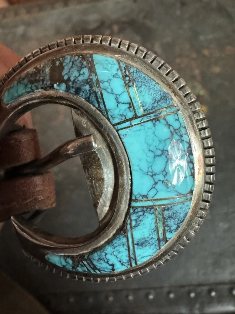 Signed FIJ 925 Sterling Silver Turquoise Inlay 4 Piece Belt Buckle Set. Buckle, 2 keepers and tip. Measurements provided in photos which act as description. Fits 3/4” belt. Very good condition. I don’t know if the tip was manufactured to open for removal but one end of the back strap is disconnected(photos provided). May have been constructed as such. I don’t know. I don’t see how it could have been removed from a belt had this not been done. At any rate, full disclosure. Hardware is currently installed on an Oil Tanned Harness Leather Belt, size 42. The ends are 3/4” wide and the body is 1.25”. The belt is 48” long. Very few pictures of the belt because I wanted to highlight the buckle set. The belt is in very good condition, solid brown. We aim to please! Thanks for looking!