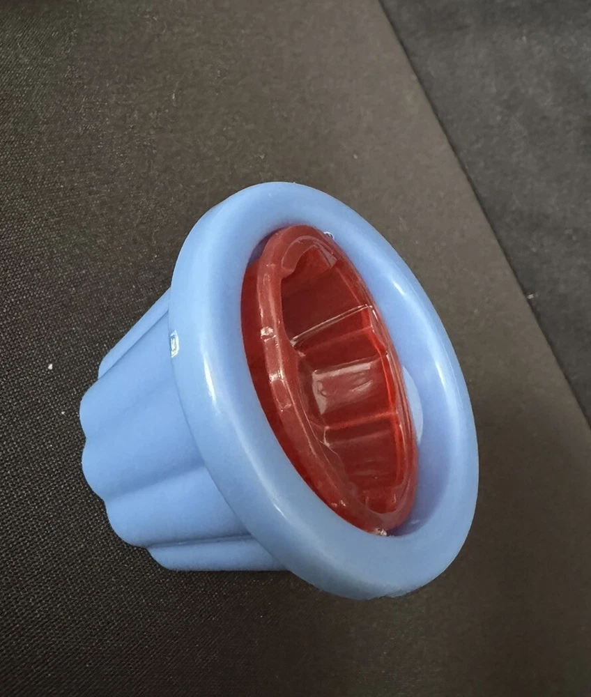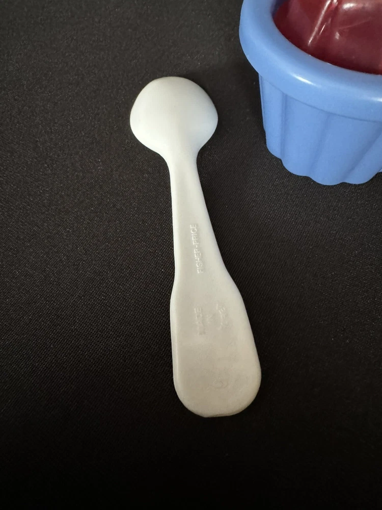 The Fisher-Price Fun Food Jello Squares Cup Dessert set from 1998 features a hard-to-find white flower spoon. This vintage Fisher-Price toy is part of the Fun Food collection and is a sought-after item for collectors. The set includes Jello squares in a cup, providing a fun and imaginative play experience for children interested in pretend play with food items. EUC
