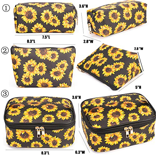 Love these cute and practical makeup bags! The three different sizes are perfect for organizing all my cosmetics, whether for travel or daily use. The waterproof material and sturdy zippers keep everything safe, and the brush holders are a nice touch. Super stylish with the sunflower design—great gift idea too! Fast shipping and reliable seller make it even better. Highly recommend!
