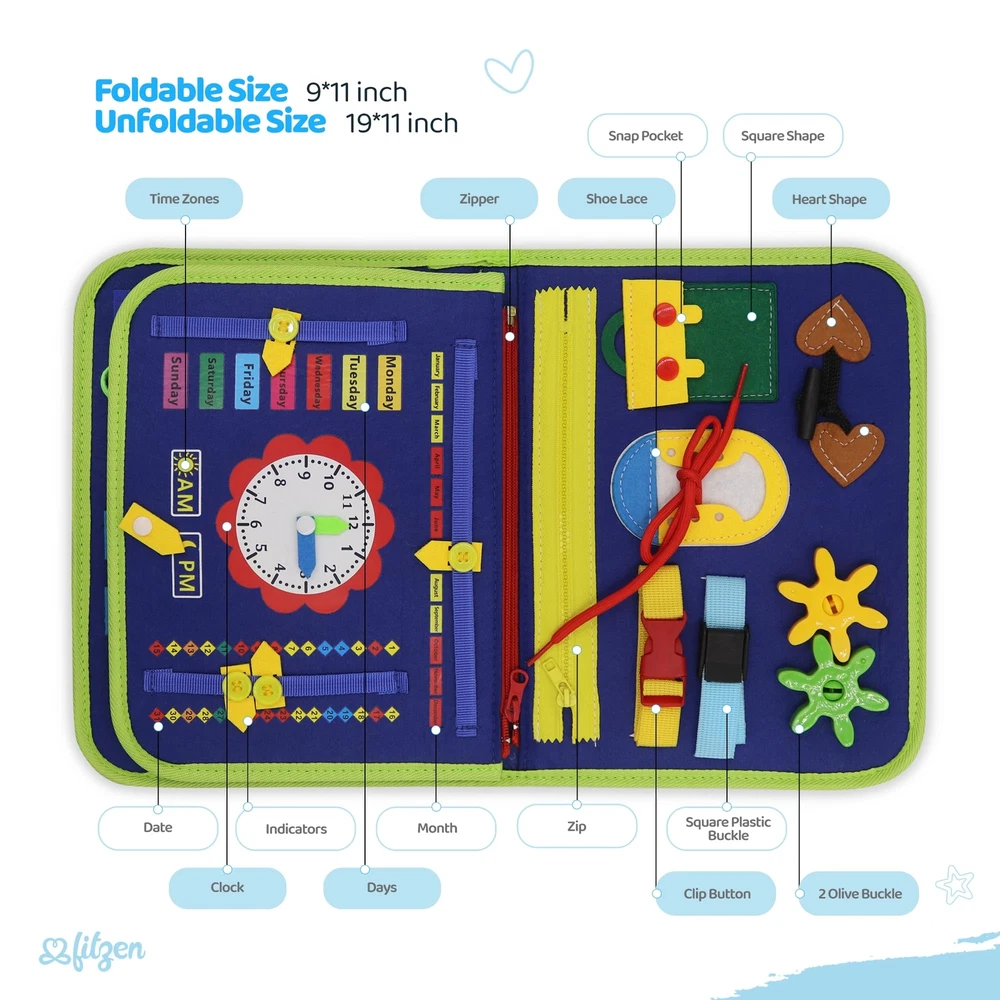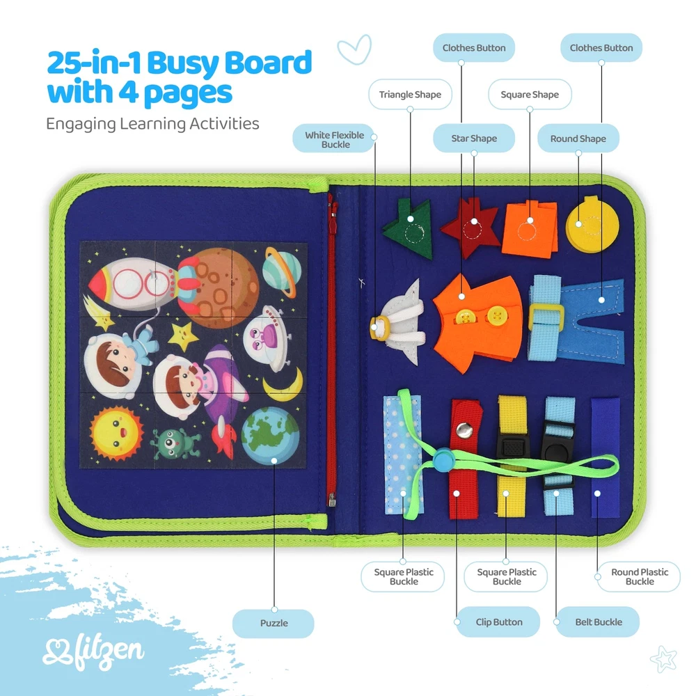 FITZEN Montessori Busy Board - Sensory and Educational Toy for Toddlers 3-5 Enhances Fine Motor Skills and Learning Toddler Travel Toys for Plane Car Busy Board Preschool - 4 Pages (Blue) 🎓 MONTESSORI LEARNING TOY - Engage your toddler with our 25-in-1 Montessori Busy Board, featuring a variety of playful activities like zippers, shoelaces, and buttons. Designed for ages 3-5, it encourages hands-on learning and discovery. 🧠 INTERACTIVE EDUCATIONAL EXPERIENCE - Celebrate the Montessori approach with our Busy Board, where toddlers can immerse themselves in learning. Interactive elements like an alphabet puzzle and a teaching clock foster an understanding of time and seasons. 👶 SENSORY EXPLORATION - Our Busy Board is a sensory delight for toddlers, offering tactile experiences with various textures and manipulatives. It's crafted to evolve with your child, presenting challenges that nurture problem-solving abilities. 🛫 PERFECT TRAVEL COMPANION - Made from child-safe soft fabric, our Busy Board is the ideal travel toy. Lightweight and portable, it's perfect for keeping little ones occupied and learning on long car trips or while waiting for appointments. 🤲DEVELOPMENT OF FINE MOTOR SKILLS - Tailored for toddlers, our Busy Board is a fun way to develop fine motor skills. Activities like buckling and unbuckling not only entertain but also teach dexterity through play. 🎓 MONTESSORI LEARNING TOY - Engage your toddler with our 25-in-1 Montessori Busy Board, featuring a variety of playful activities like zippers, shoelaces, and buttons. Designed for ages 3-5, it encourages hands-on learning and discovery. 🧠 INTERACTIVE EDUCATIONAL EXPERIENCE - Celebrate the Montessori approach with our Busy Board, where toddlers can immerse themselves in learning. Interactive elements like an alphabet puzzle and a teaching clock foster an understanding of time and seasons. 👶 SENSORY EXPLORATION - Our Busy Board is a sensory delight for toddlers, offering tactile experiences with various textures and manipulatives. It's crafted to evolve with your child, presenting challenges that nurture problem-solving abilities. 🛫 PERFECT TRAVEL COMPANION - Made from child-safe soft fabric, our Busy Board is the ideal travel toy. Lightweight and portable, it's perfect for keeping little ones occupied and learning on long car trips or while waiting for appointments. 🤲DEVELOPMENT OF FINE MOTOR SKILLS - Tailored for toddlers, our Busy Board is a fun way to develop fine motor skills. Activities like buckling and unbuckling not only entertain but also teach dexterity through play. Shipping from the USA All of our products are shipped from the USA, ensuring quick delivery to your destination. Payment We offer the following payment methods: PayPal, credit card, bank transfer, and eBay's secure payment system. Free Shipping & Free Returns Shipping within the USA is FREE. Additionally, any return is absolutely free for you. Risk-Free Purchase You have the option to return an item within 30 days without any justification. We cover the return shipping costs! Fast Shipping We ship immediately upon receipt of payment. Generally, the package is delivered within 2-3 days in the USA. If it takes longer, we will contact you. Quality and Costs Made in Europe, USA, China No customs fees or additional charges Total satisfaction guarantee Invoice with declared VAT available upon request in .pdf format Feedback Your feedback is very important to us. After you pay for your purchase, you will automatically receive positive feedback from us.