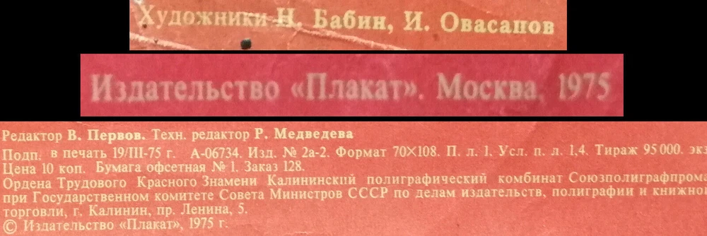 Original slogan on the poster: ЗАВЕРШИМ ПЯТИЛЕТКУ ПО УДАРНОМУ! Literally English translation: LET'S FINISH THE FIVE-YEAR PLANS WITH SHOCK WORK! Inscription on the badge: THE SHOCK WORKER OF THE 9TH FIVE-YEAR PLAN Inscriptions on the books: SOCIALIST OBLIGATIONS POSTER ARTIST: BABIN N. & OVASAPOV I. PRINT YEAR: 1975 SUBJECT: WORKERS OBLIGATIONS LANGUAGE: RUSSIAN PRINT RUN: 95.000 PUBLISHED BY: "PLAKAT", MOSCOW SIZE: IN: 27 ¼ x 40 ¼ = CM: 69 x 102 CONDITION: ROLLED, GOOD The poster was folded one time in the middle, there is creases and paper loses at upper left corner, some tape repairs on the revers, however the poster is in a good overall condition. Before your bid please consider the poster condition from attached pictures and text description, if you still need more information please feel free to require additional pictures or video, it would be my pleasure to assist you with any questions regarding this auction. Shipping folded in a good packed envelope. Please Note: The poster is personally hand signed by three artists - one of the signatures is by Surikov - But can't exactly understand what Surikov, both of famous Soviet artist Pavel Surikov and Alexander Surikov died at 1940s. www.facebook.com/sovietartposters Listing and template services provided by inkFrog