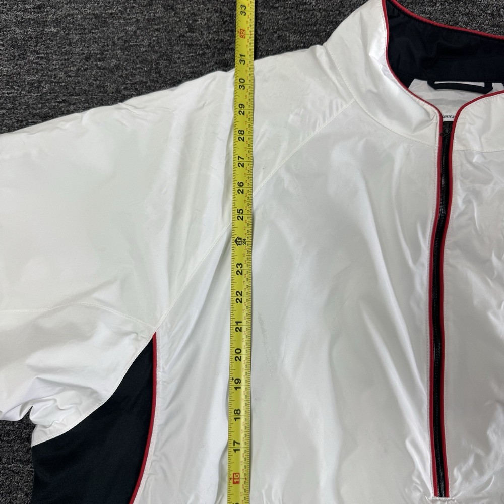 The FJ Footjoy Dryjoys Tour Collection 1/2 Zip Short Sleeve Golf Windbreaker in size 2X is a stylish and functional jacket designed specifically for golf enthusiasts. Made from 100% polyester, this white jacket features a solid pattern and a short length for ease of movement. With a zip and pullover closure, it is perfect for traveling and casual wear. The lightweight design and all-season features make it an ideal choice for outdoor activities, while the classic FootJoy brand adds a touch of sports-inspired style. Ideal for those who appreciate quality and performance in their clothing choices. The photos are the BEST indication of the condition please use the presented photos before purchasing the item. Thank you for checking out our page and let us know if you have any questions!