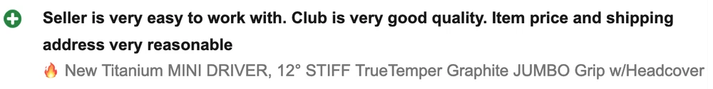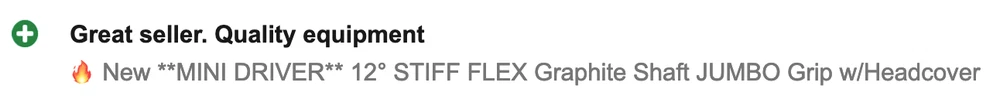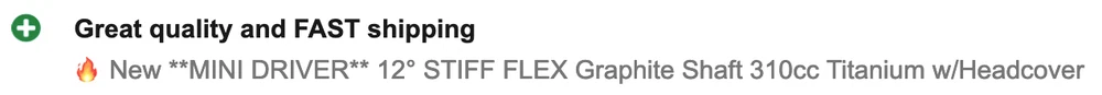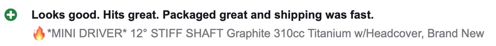 Normal Price: $229.99 SALE PRICE (limited time): $79.95 Right handed, REG, R-Flex, Regular graphite shaft, 10.5 degrees, Premium GOLF PRIDE grip, TITANIUM, BRAND NEW in plastic with head cover. Head cover may be different style than pictured, or different branding. Grip will be black and blue, black and gray, or black and orange. Assembled in USA! Ships from USA! Many additional lofts/shaft flex available. See my other listings. Like Taylormade Burner or 300 Mini Driver, or Callaway Paradym Ai Smoke Ti Mini Driver - but save money! Buy with confidence - 100% positive feedback! Please allow up to 6 business days for handling as items are custom made to order. (We try to ship much faster, often same or next day. Ships via FedEx Ground Economy, UPS Ground, or USPS Ground Advantage.) Thanks for your order! Buyer responsible for regular professional safety checks on equipment, including before first use. Buyer assumes all responsibility for safety of equipment.