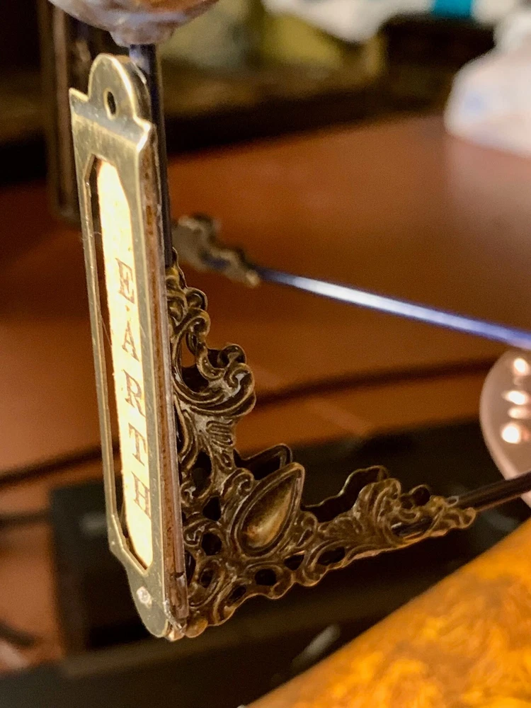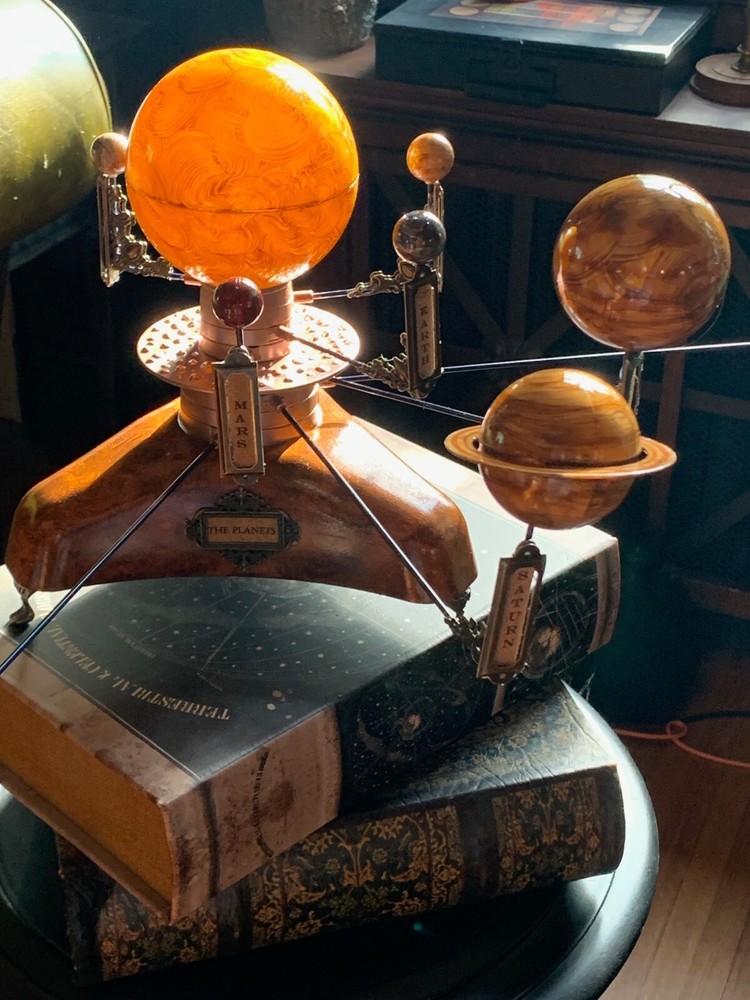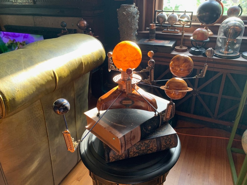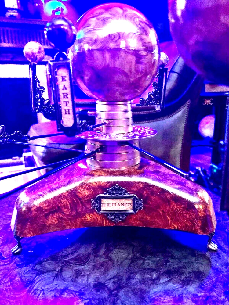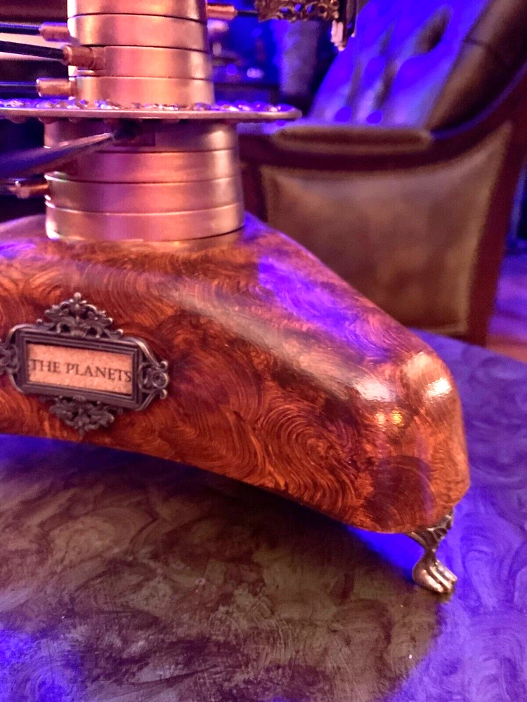 This is a student's model made of plastic and metal which has been completely disassembled and re-imagined as if it were found in some eccentric's Victorian library. The base has a faux finish appearance of burled wood with ornate brass fittings. The planets have been distressed and antiqued to look like wood and ceramic. The labels have been painstakingly put together (each require 9 different steps by hand) and because of the absurd amount of time and effort required, these will be limited, keeping the prototype in our own hundred-year-old library, before retiring this model we call "The Sherlock." This model normally requires 2-3 weeks before delivery - ask if you need it sooner. This is approximately 9.5" tall and extends about 18" out from the center. It's big and showy. Your kids will fight over this when you die. It runs on 4 AA batteries (included.) The model is not intended as a nightlight - it automatically shuts off after about 15 minutes. The four smaller planets rotate at a faster speed than the four larger planets which creates an impressive display. Video can be found here: https://youtu.be/TGur_BeoqeM Our models have appeared in Star Trek Discovery, Picard, and Snowpiercer. We have shipped all over the world with rave reviews. You will not find these offered by anyone other than Omaha Orrery.