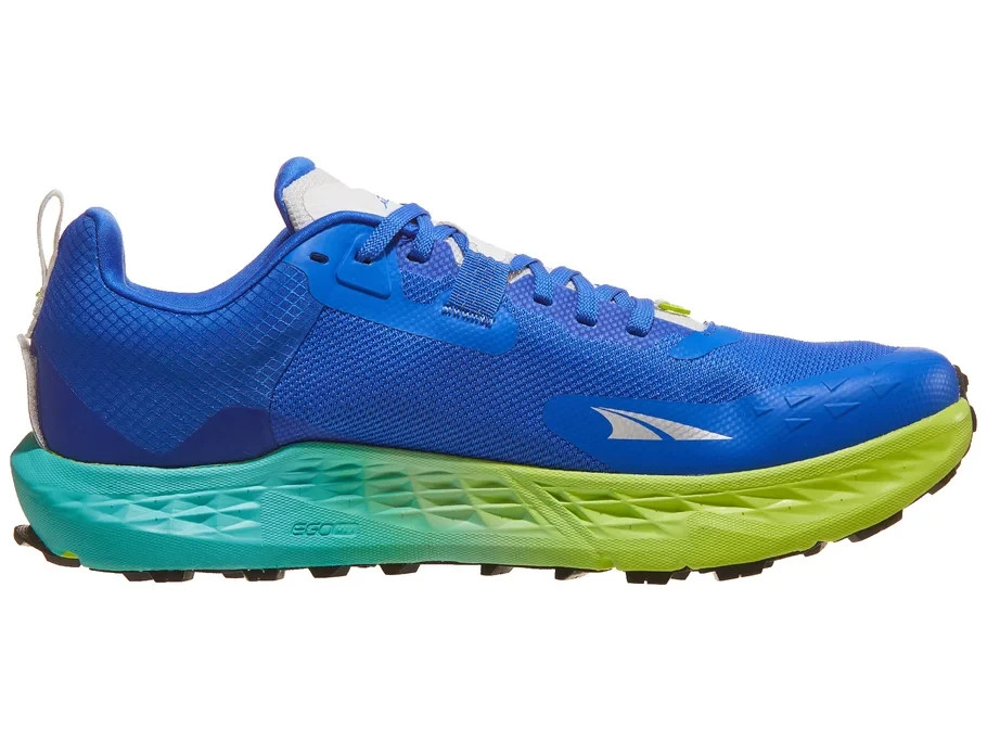 Altra Timp 5 Men's Shoes - Blue/Lime The Altra Timp 5 offers a balance of soft and responsive cushioning that allows it to excel for both long days and daily runs on the trails. The Altra EGO MAX midsole compound has been updated for a more cushioned ride that not only shields the legs from the rugged terrain but also propels runners effortlessly through diverse trails. A key feature of the Timp 5 is its new Vibram outsole that provides unmatched grip on a variety of surfaces and conditions. The strategically carved flex grooves in the rubber further contribute to the shoe's adaptability to ensure a smooth ride on everything from rocky trails to rolling fire roads. The breathable knit upper adds another layer of comfort, while the "Standard" foot shape strikes the perfect balance between the "Original" and "Slim" options that delivers a secure midfoot fit with a slightly roomier toe box. Overall, the Timp 5, with its soft and bouncy ride, will be a great option for casual trail runs, long mountain adventures, and everything in between. What's New: Updated EGO MAX compound Vibram Megagrip outsole