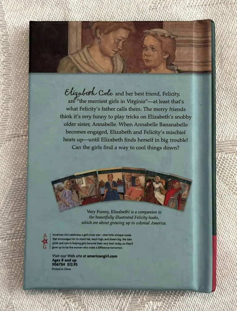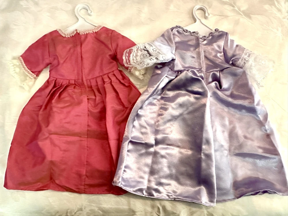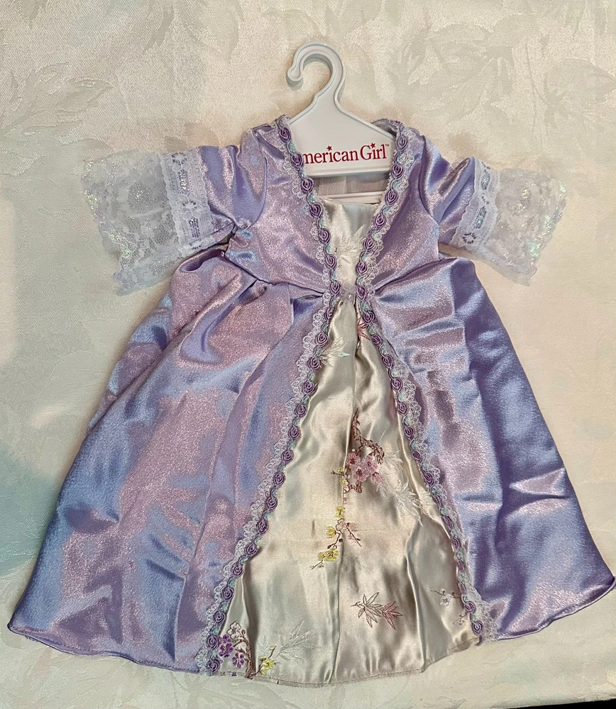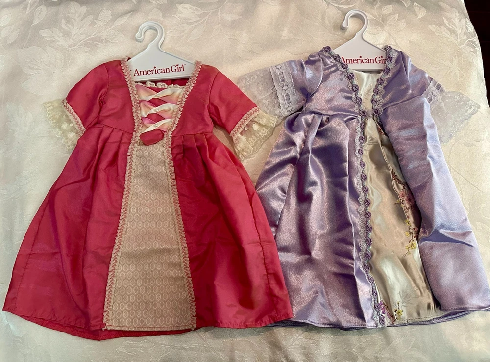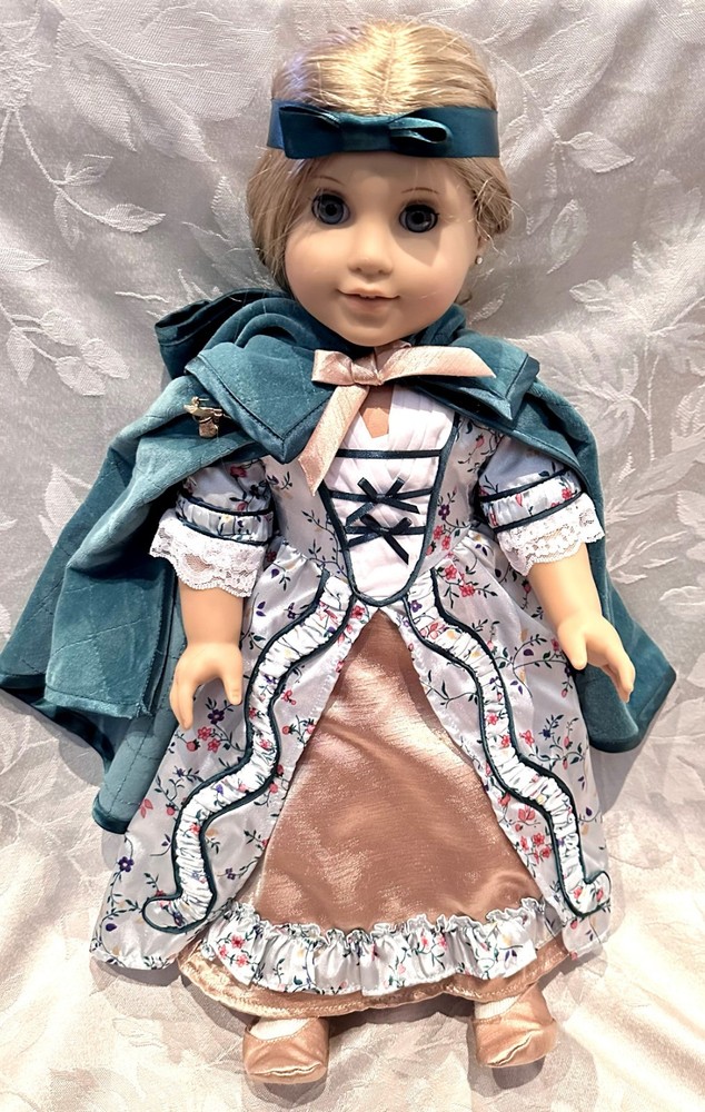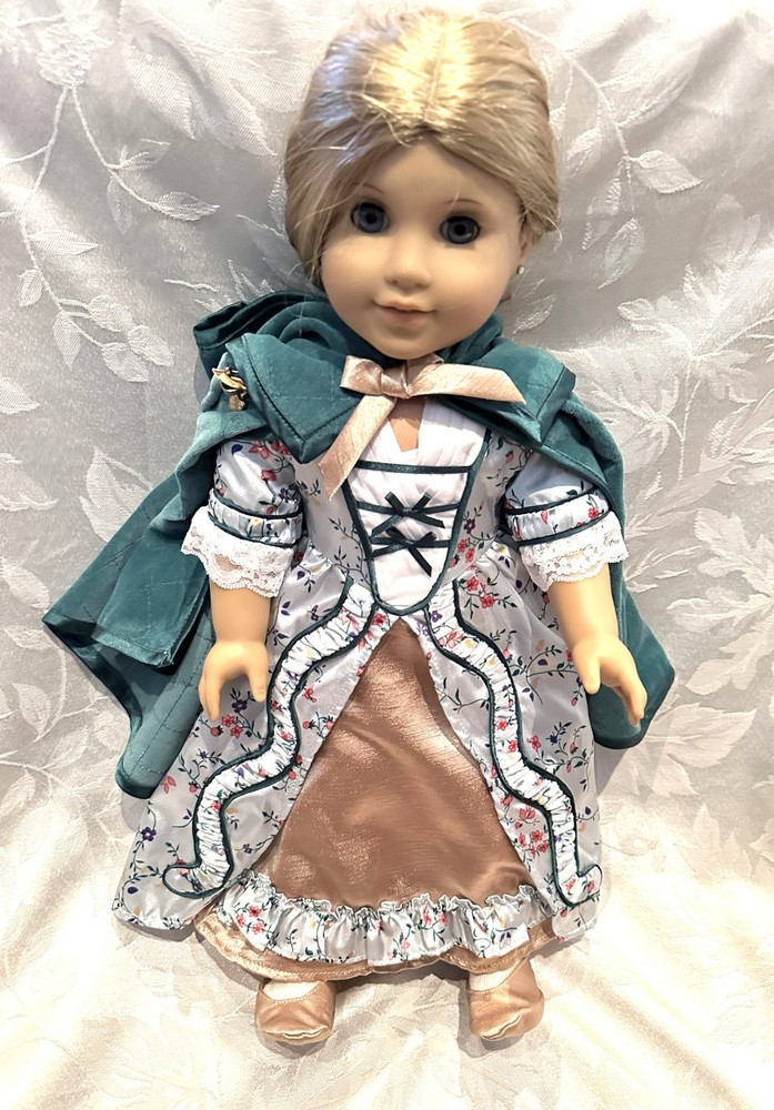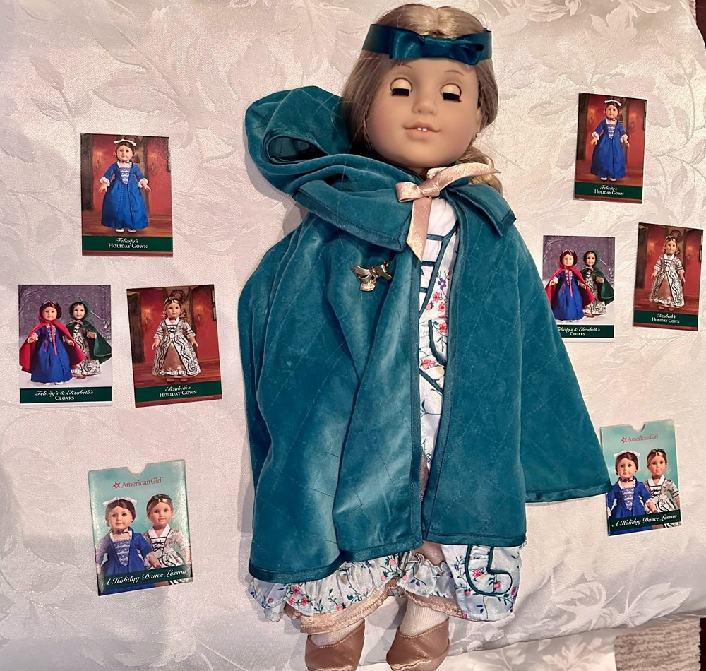 Celebrate the elegance of colonial America with this stunning Elizabeth Cole doll from the American Girl historical collection. She arrives dressed in her breathtaking Holiday Gown ensemble — a rich floral brocade layered over a peach satin underskirt, trimmed in lace and ribbon, and topped with her signature teal velvet cape . Every detail evokes the refinement of 1770s Williamsburg, from the puffed sleeves to the delicate ribbon ties at her neckline. Her long blonde curls are perfectly styled, and her lifelike blue eyes sparkle with the grace and poise that made Elizabeth a fan favorite. This doll has been carefully stored, preserving her pristine condition. Though she comes without her original box, she includes a curated set of extras that elevate her display and collector value: Original “Meet” outfit – pale pink gown with lace trim and matching shoes, as issued with her debut. Original “Very Funny, Elizabeth!” book — a charming companion story full of wit and warmth. 2 sets of Felicity Merriman collector cards – featuring artwork, facts, and character details from the colonial era collection. Additional historical dress — a gorgeous lavender dress (see photos). 2 American Girl original hangers Elizabeth is more than a doll — she’s a character with heart, history, and timeless style. Whether you’re expanding a collection or gifting a piece of American Girl magic, this ensemble offers beauty, storytelling, and rare craftsmanship in one unforgettable package. Whether you're a collector or gifting to someone special, this set brings beauty, story, and savings all in one.