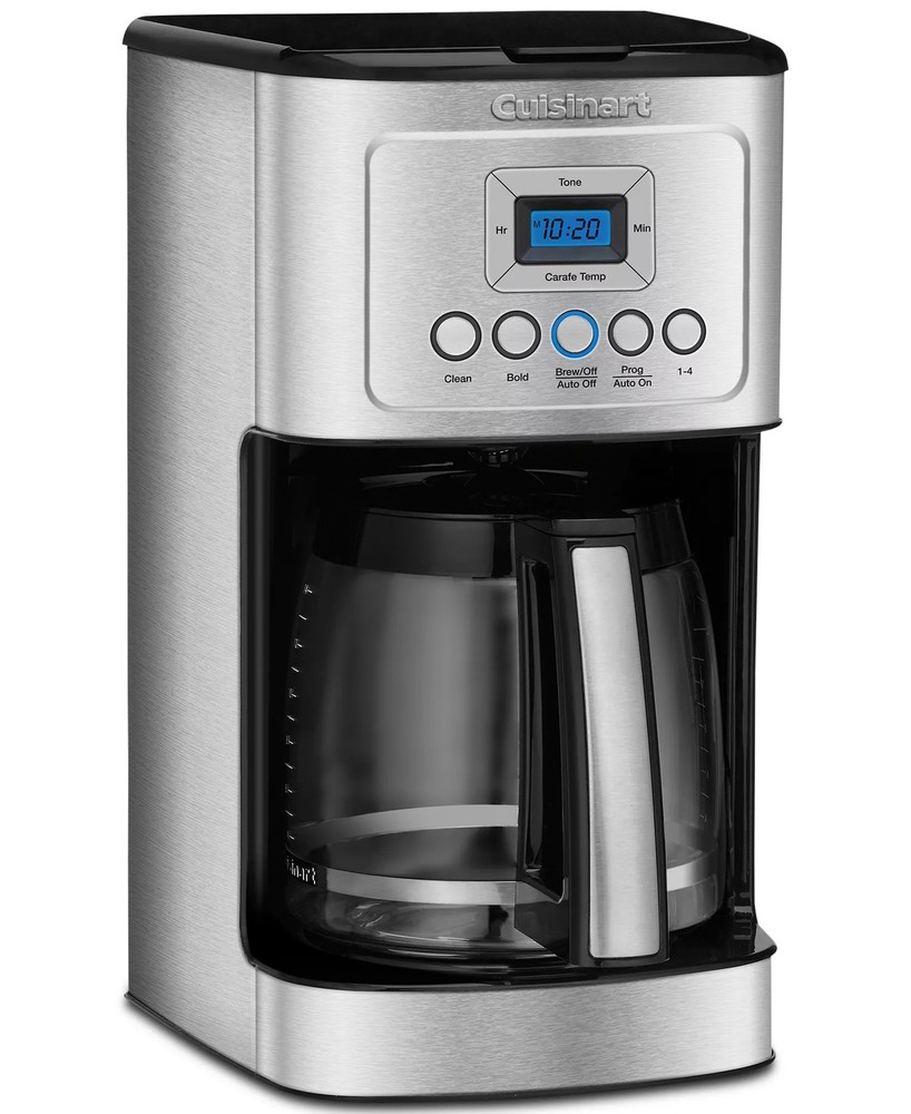 No more coffee runs. Have the best cup right at home with this fully programmable 14-cup brewer, which features a Brew Strength Control, so you can cater each cup exactly to your preferences. From having a pot ready when you wake up to allowing you to pour a cup mid-brew to offering 1-to-4 cup settings, this coffee maker knows you like to keep your options open. Model DCC-3200. Features Approx. dimensions: 7.75"L x 9"W x 14"H Even hotter coffee with the same rich flavor! Select regular or bold coffee flavor with the Brew Strength Control Fully automatic with 24-hour programmability, self-clean & auto-shutoff up to 4 hours 1-4 cup setting lets you choose how much you want to brew Brew Pause feature pours a cup mid-brew 14-cup glass carafe Gold tone permanent filter Charcoal water filter BPA-free design This product contains aluminum, nickel, chromium, manganese, iron and phosphorus and zinc