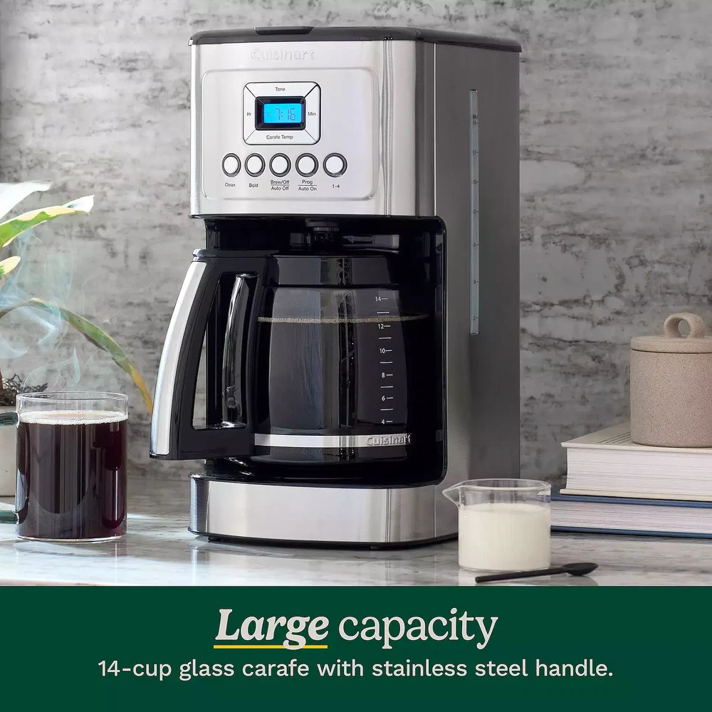 Enjoy Hotter Coffee: Utilize expert coffee-making technology to ensure your coffee temperature is perfect, delivering a delightful taste experience without compromising flavor or quality. Brew Strength Control: Tailor your coffee flavor to perfection by choosing between regular or bold settings, catering to your unique taste preferences with every brew. Fully Automatic Coffee Brewer: Experience convenience with 24-hour programmability, offering flexibility with 1-4 cup settings, auto-off functionality (0-4 hours), and an optional ready alert tone for added convenience. 14-Cup Glass Carafe: Indulge in generous servings of coffee with a sleek glass carafe featuring a decorative stainless-steel handle and matching body, creating a stylish addition to complement your kitchen appliances Fill with Ease: Enjoy accurate water filling through the easy-to-view water window, while Cuisinart's Brew Pause feature allows you to savor a cup of coffee before the brewing cycle completes, enhancing your coffee-drinking experience