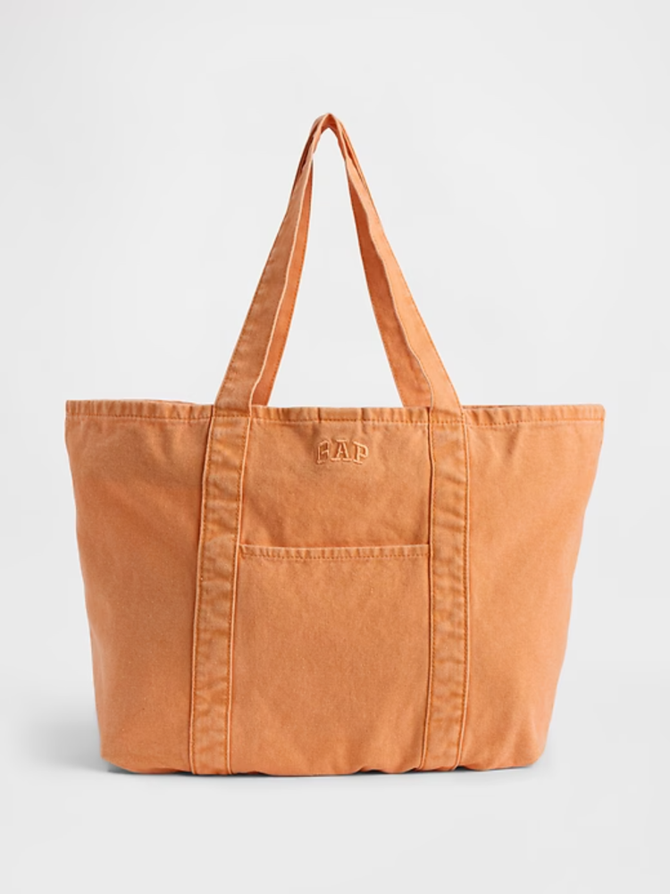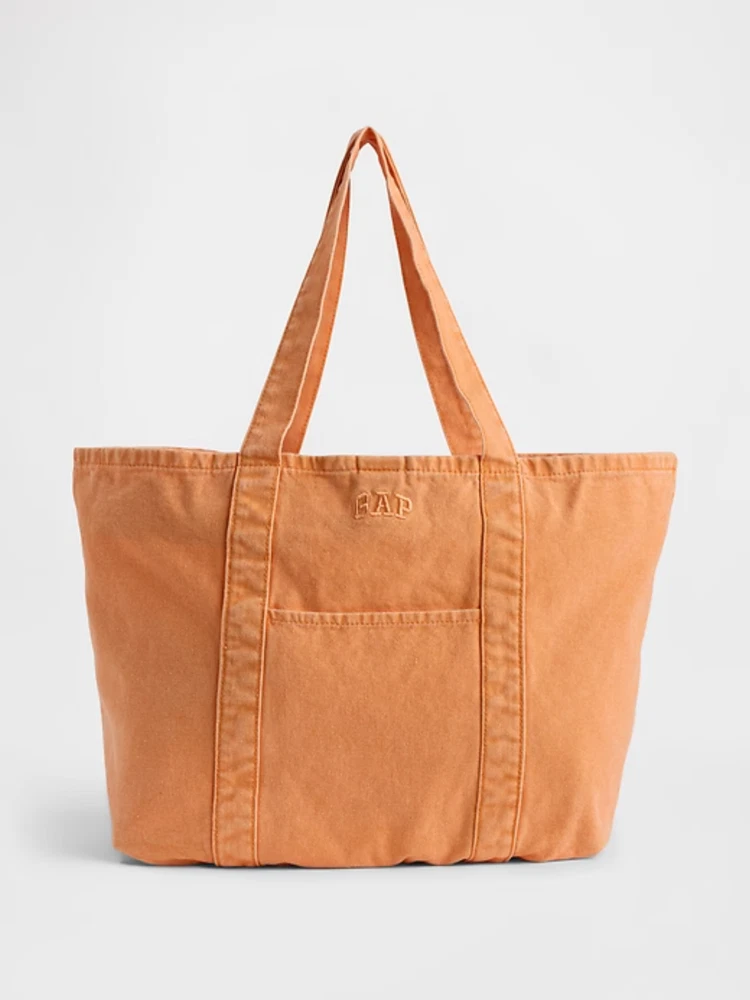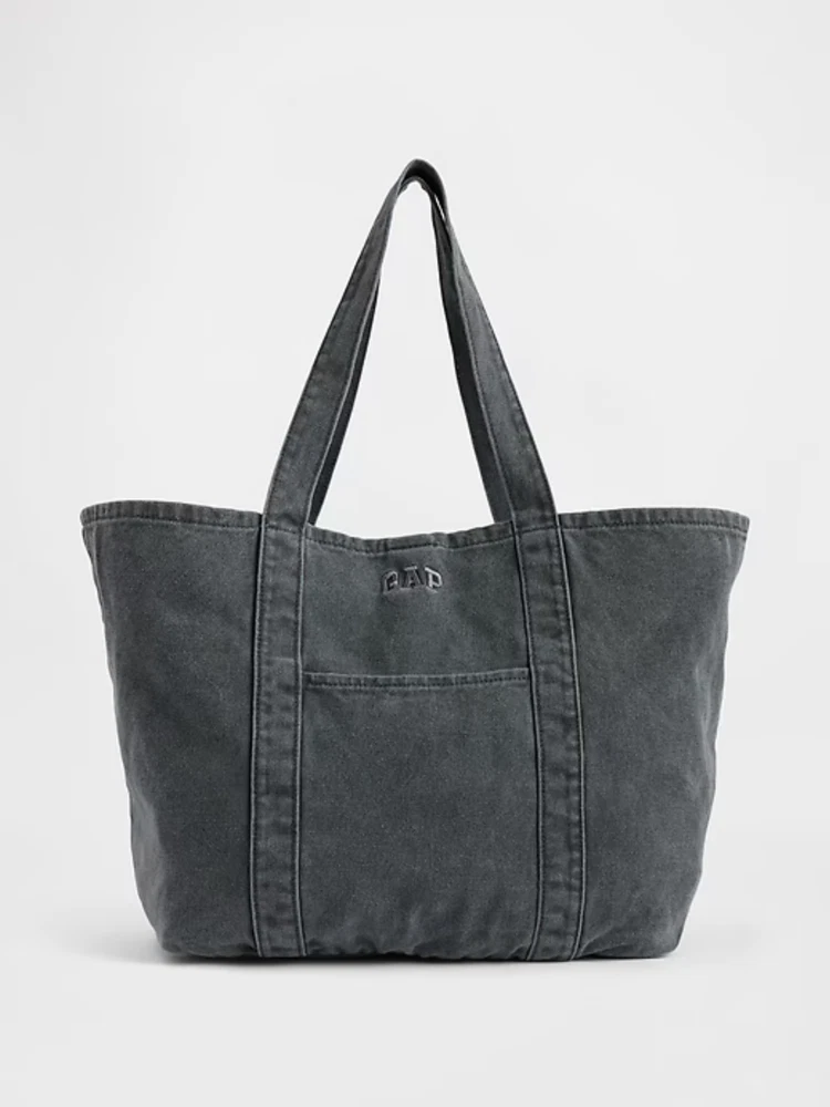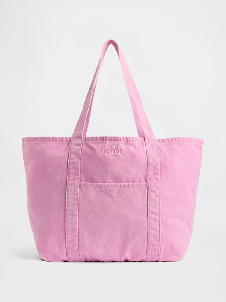 Product details Soft, overdyed cotton tote bag. Shoulder straps. Snap button closure. Outer and inner patch pocket. Embroidered mini Gap arch logo at front. Assorted colors & prints. #876406 Size & fit Dimensions: 14.6" H x 6.7" W x 20" L Fabric & care 100% Cotton. Machine wash cold, gentle cycle. Lay flat to dry.