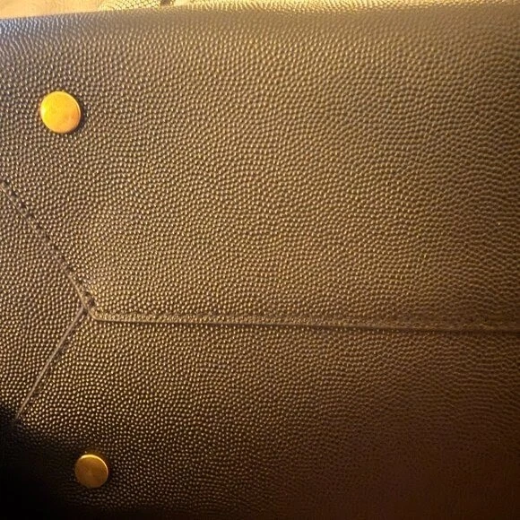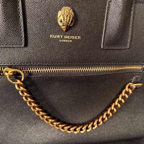 30% OFF! Luxurious textured leather exterior and smooth leather trim and satin lining interior. Large & elegant spacious tote bag finished with protective bottom feet. Versatile Carryall, works as handbag, briefcase, elegant shopper, or laptop bag For work or play Front Chain Link Zipper feature with signature Geiger brass & crystal eagle head ornament Dual top carry handles. 5" drop Exterior & Interior zipper pockets Plus slip-in pouch for handy essentials Geiger logo satin lining Thick textured Leather Imported from London. Brand New, no tags, no flaws Color: Brown Black Size: Height 9.5" Width 12" X Depth 6"