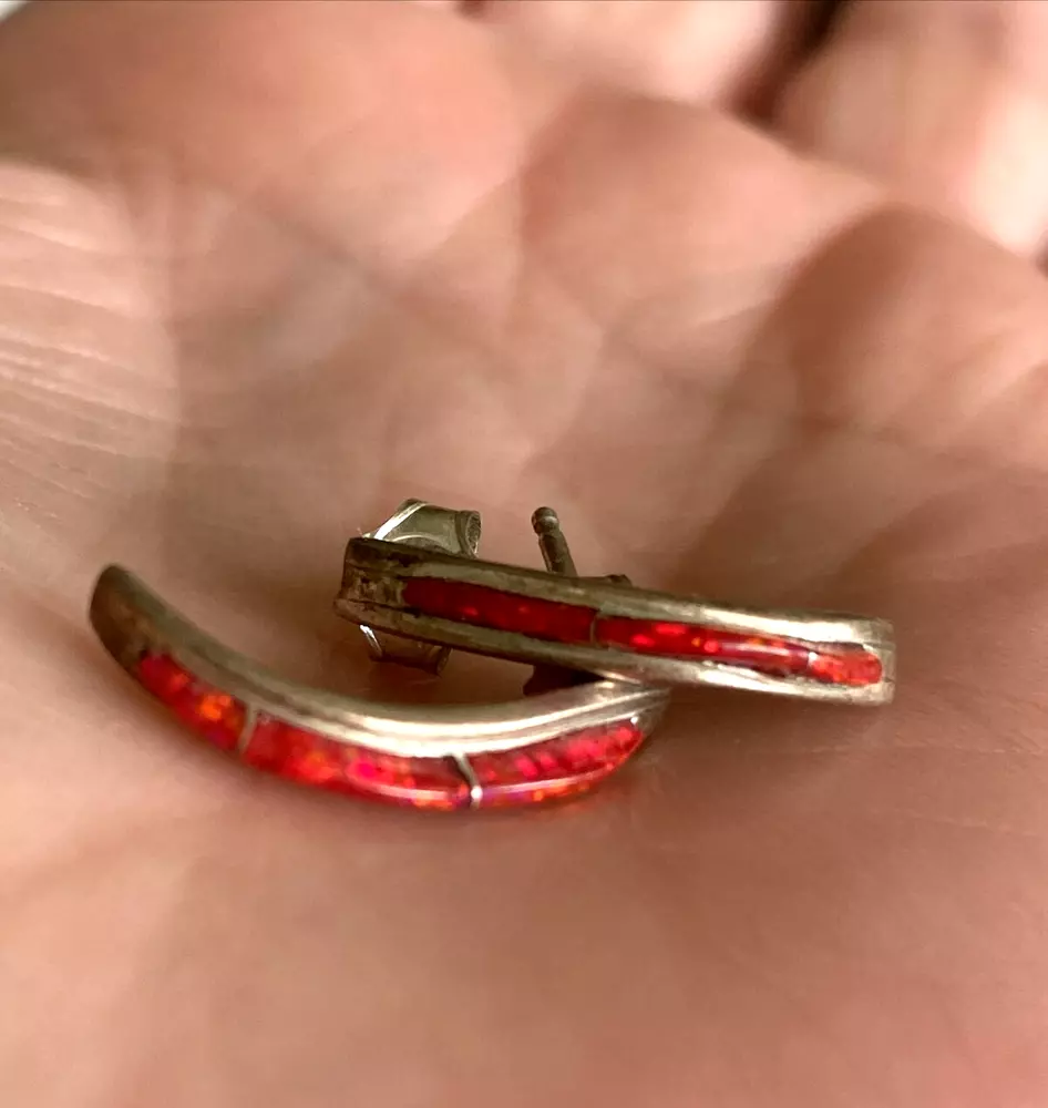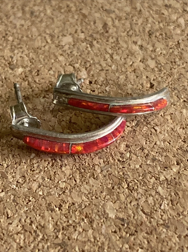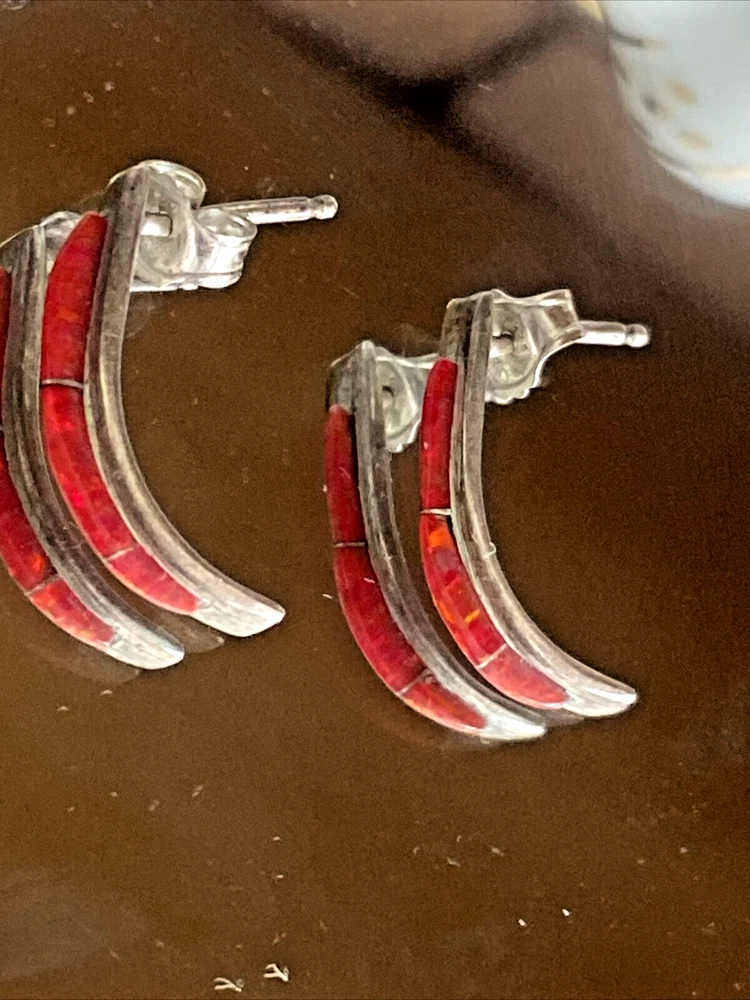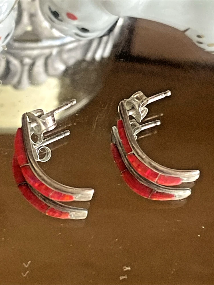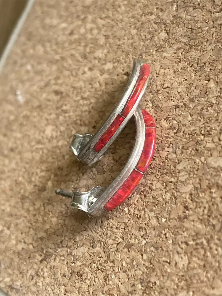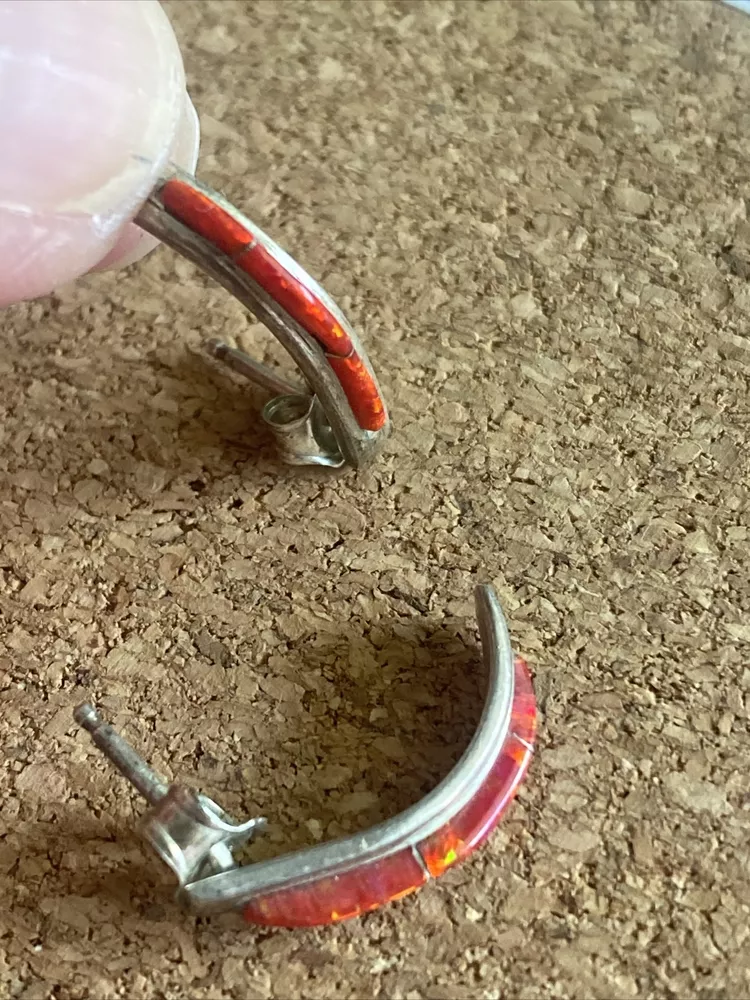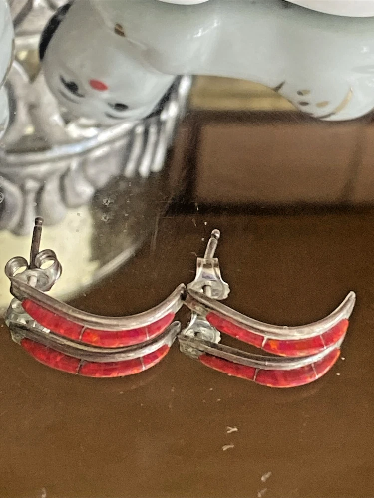 Handmade Native American Old Zuni inlay Petite Red Fire Opal Sterling Silver half hoop earrings. These earrings are not hallmarked which is common for older pieces. Very good vintage condition. Light tarnish. Opals are in great condition. No missing or damaged stones. Please see photos. Zuni style Inlay is the hand-cutting of each stone to fit in a flush surface. The stones are also slightly raised to give it depth. Very nice straight cut stones. No gaps between the stone inlay. Each stone is hand cut and carefully inlaid in the silver. Each earring features 3 petite needle point hand cut stones soldered and inlaid into silver bezel settings.. The earrings are approximately 1/8 inch’s wide & 5/8”inch’s long. Very beautiful and simple. Red Fire Opal is more rare and harder to find. Thank you for visiting our store