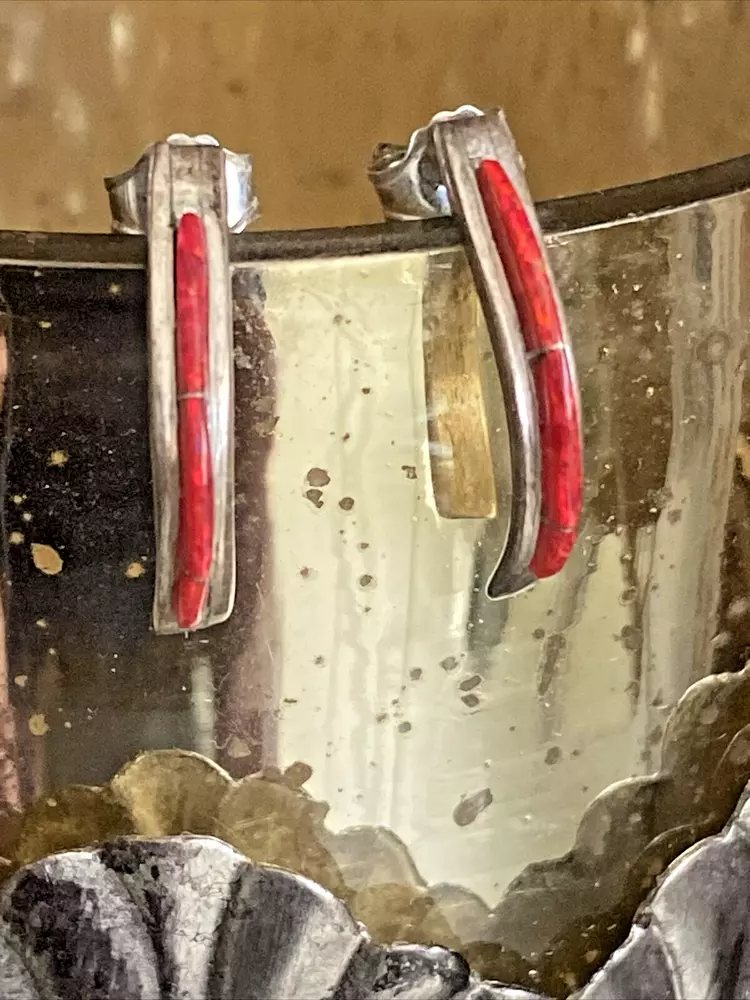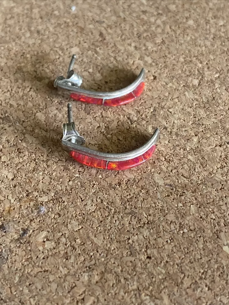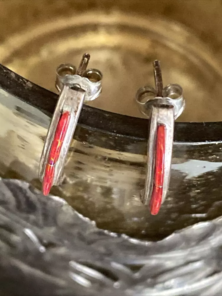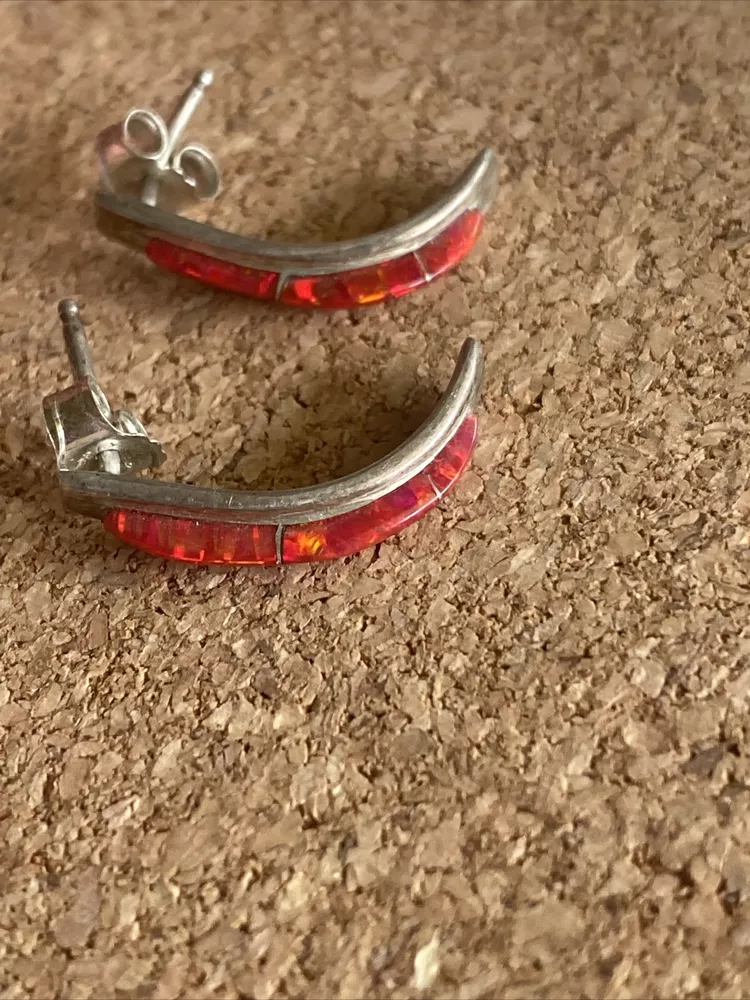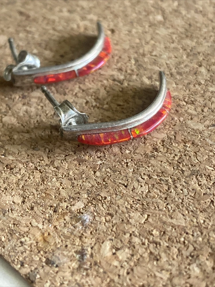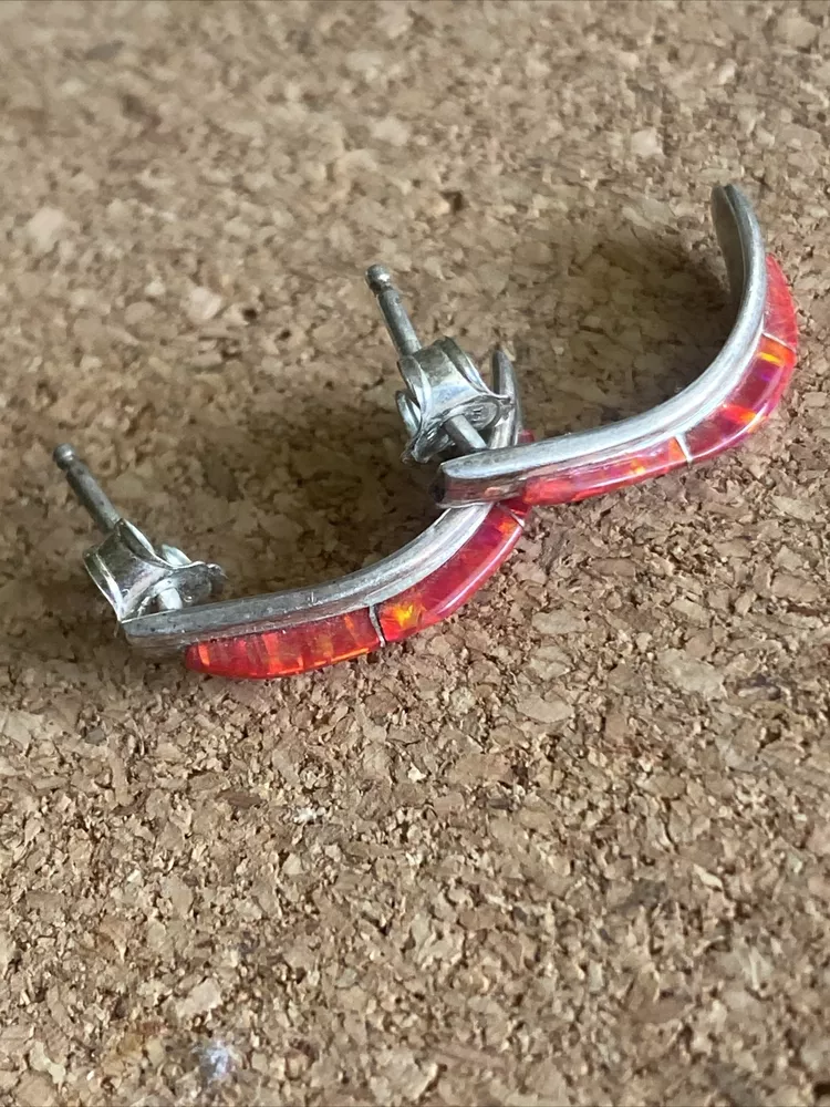 Handmade Native American Old Zuni inlay Petite Red Fire Opal Sterling Silver half hoop earrings. These earrings are not hallmarked which is common for older pieces. Very good vintage condition. Light tarnish. Opals are in great condition. No missing or damaged stones. Please see photos. Zuni style Inlay is the hand-cutting of each stone to fit in a flush surface. The stones are also slightly raised to give it depth. Very nice straight cut stones. No gaps between the stone inlay. Each stone is hand cut and carefully inlaid in the silver. Each earring features 3 petite needle point hand cut stones soldered and inlaid into silver bezel settings.. The earrings are approximately 1/8 inch’s wide & 5/8”inch’s long. Very beautiful and simple. Red Fire Opal is more rare and harder to find. Thank you for visiting our store