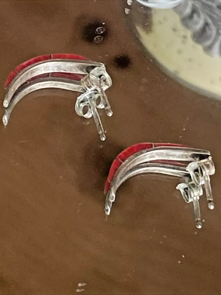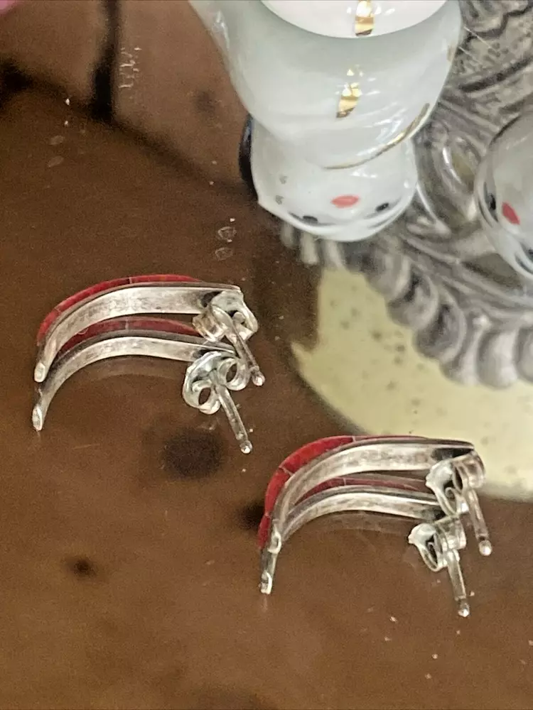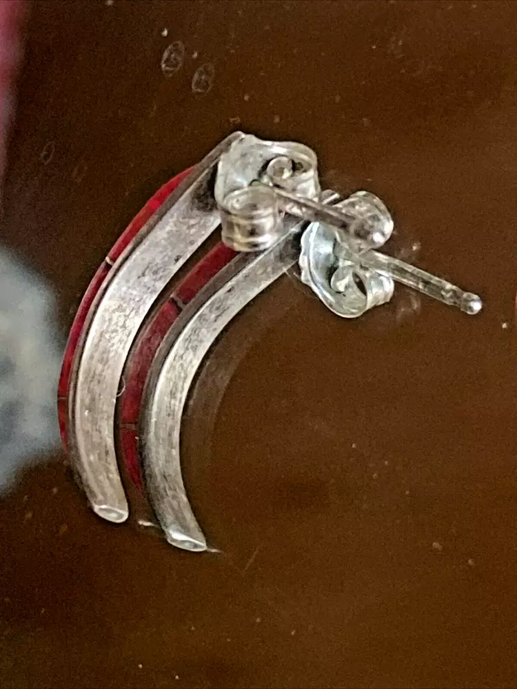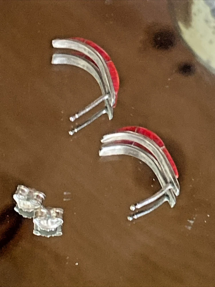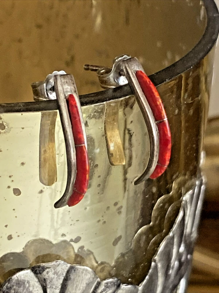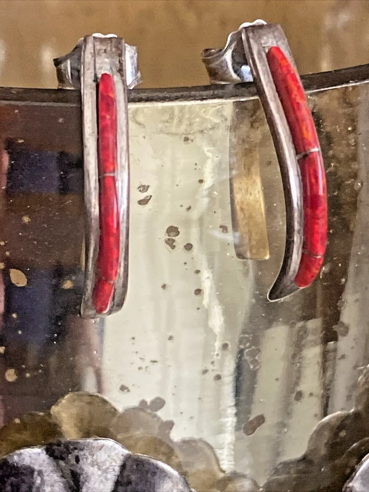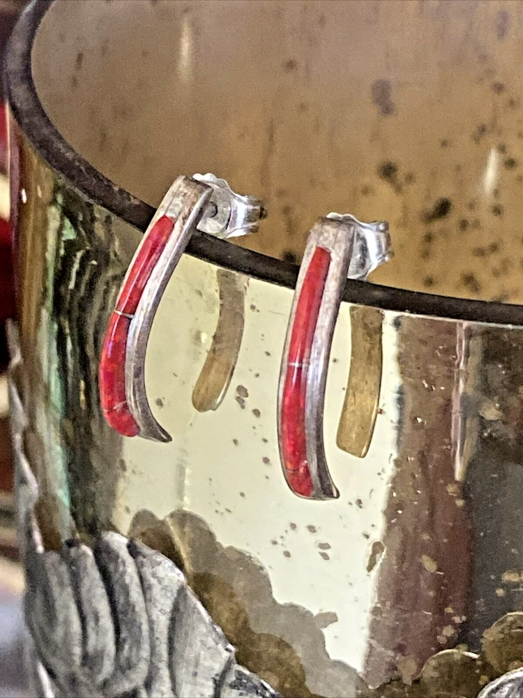 Handmade Native American Old Zuni inlay Petite Red Fire Opal Sterling Silver half hoop earrings. These earrings are not hallmarked which is common for older pieces. Very good vintage condition. Light tarnish. Opals are in great condition. No missing or damaged stones. Please see photos. Zuni style Inlay is the hand-cutting of each stone to fit in a flush surface. The stones are also slightly raised to give it depth. Very nice straight cut stones. No gaps between the stone inlay. Each stone is hand cut and carefully inlaid in the silver. Each earring features 3 petite needle point hand cut stones soldered and inlaid into silver bezel settings.. The earrings are approximately 1/8 inch’s wide & 5/8”inch’s long. Very beautiful and simple. Red Fire Opal is more rare and harder to find. Thank you for visiting our store