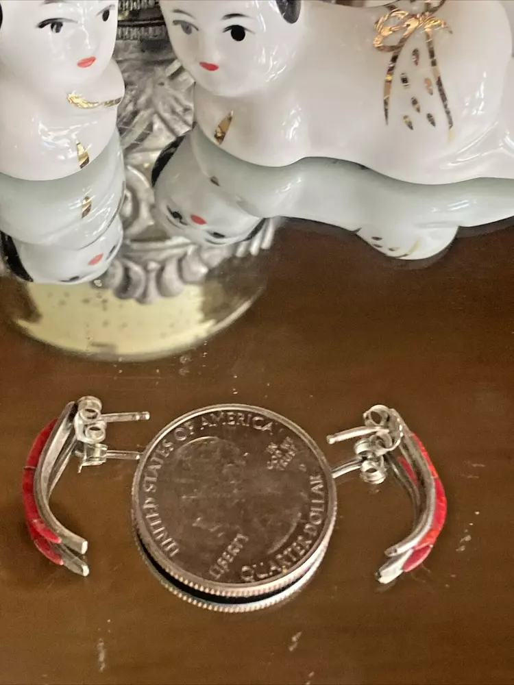 Country/Region of Manufacture: United States Metal Purity: Sterling Secondary Stone: Red Fire Opal Color: Red Ear Area: Lobe Handmade: Yes Department: Women Main Stone: Red Fire Opal Diamond Color Grade: ? Jewelry Type: Earrings Main Stone Color: Red lot: No Ethnic & Regional Style: Zuni Tribal Affiliation: Zuni Main Stone Shape: inlay Base Metal: Sterling Silver Signed?: unsigned Diamond Clarity Grade: ? Item Diameter: see description Country of Manufacture: United States Features: beauty Certification: ? Item Length: see description Number of Gemstones: 3 per earring Metal: Sterling Silver Material: Red Fire Opal, Sterling Silver Style: Hoop Closure: Butterfly Number of Diamonds: 0 Gemstone Clarity Grade: Eye Clean Cut Grade: Ideal Customized: No Signed: No Setting Style: Bezel Total Carat Weight: ? Vintage: Yes Country of Origin: United States Main Stone Creation: Unknown Type: Earrings Brand: Unbranded Featured Refinements: Zuni Earrings Main Stone Treatment: Unknown