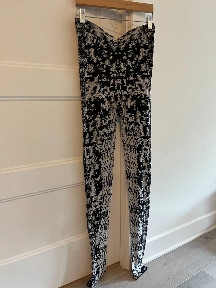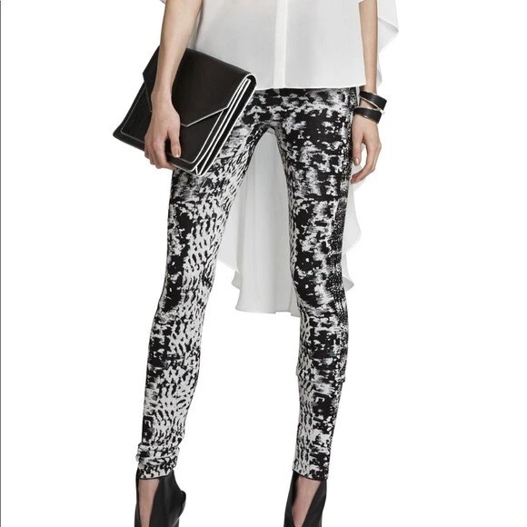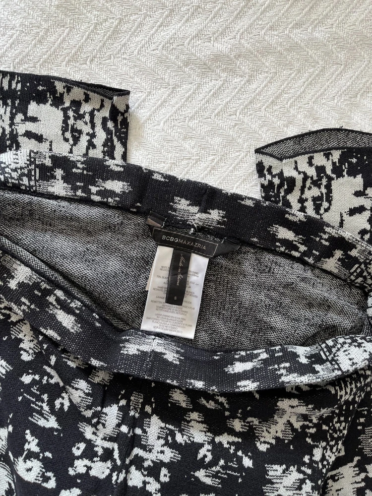 BCBGMAXAZRIA Pre-Owned | Mara Jacquard Leggings Black/Comb Edition The leggings have been bought a few years ago. They have been worn on a few occasions. They are g ently used and in great condition. A sewing alteration was made by a professional seamstress at the crotch area. There is no other alteration nor apparent defects. They have been handled with care and stored safely. Original retail value: $158.00 CAD