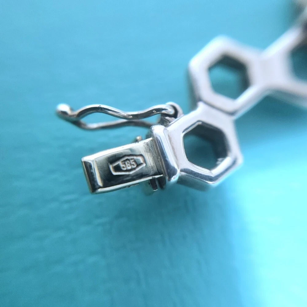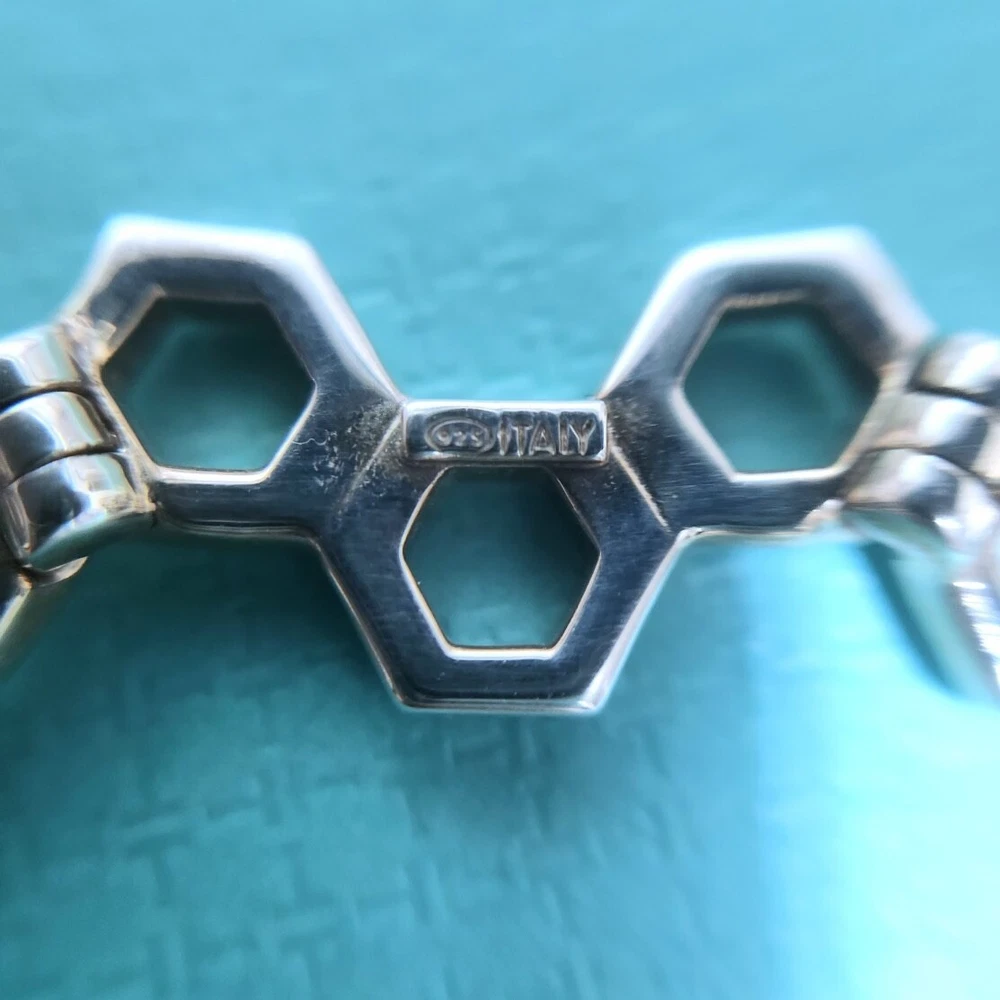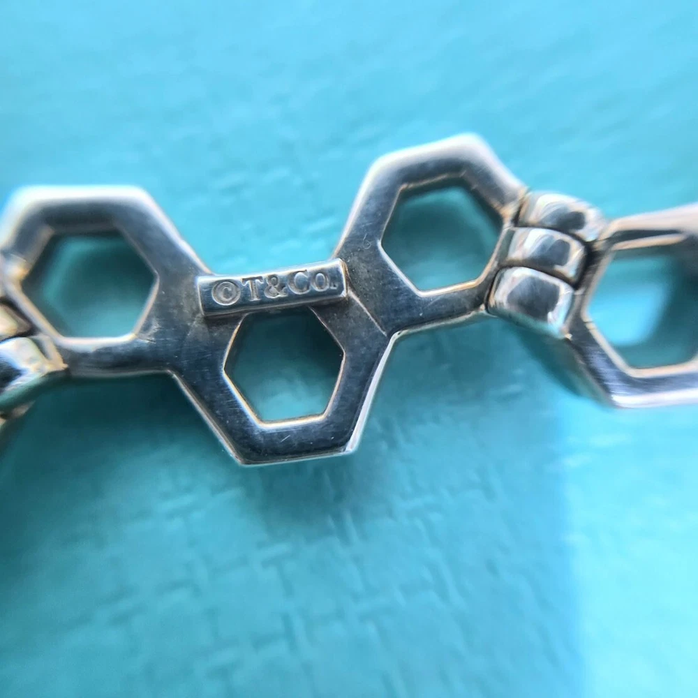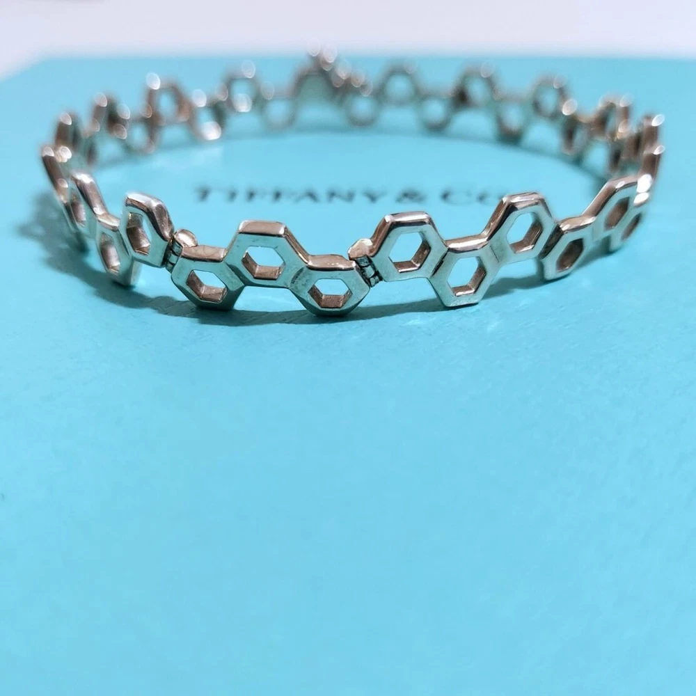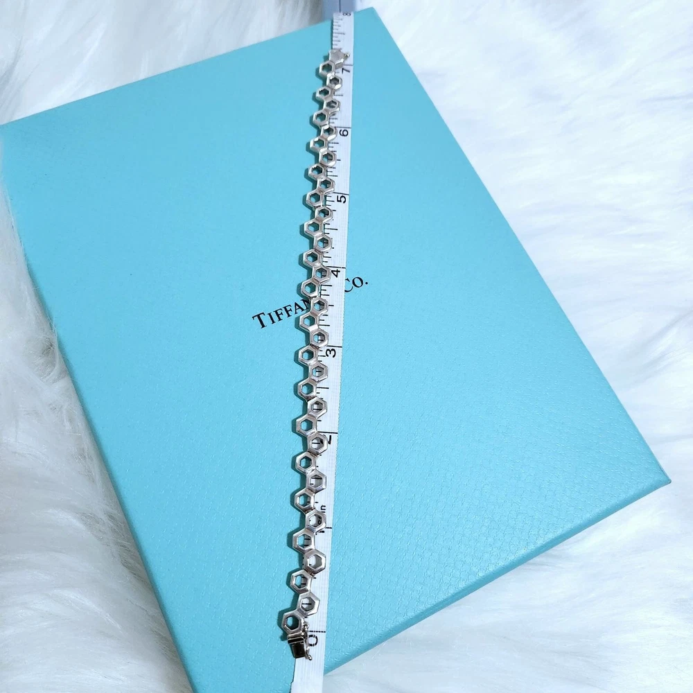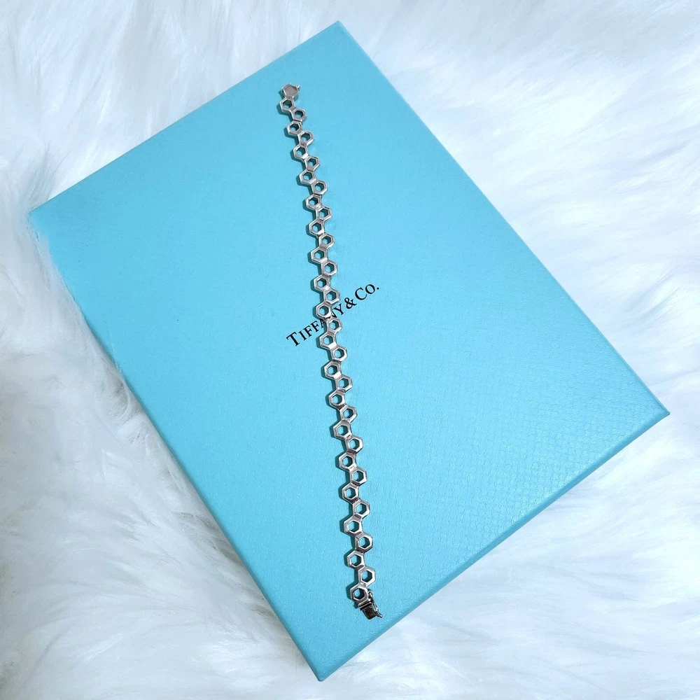 🩵FLASH SALE🩵 Extremely RARE & Hard to find!!! Beautiful collectible Tiffany piece! Vintage Tiffany & Co. honeycomb hexagon bracelet in sterling silver with 14k white gold. 7.25” long. In very good condition. May have scratches from normal wear. Please zoom on in every photo as a part of description! Comes with a box. ʕ•ᴥ•ʔ✿ NOTE: I've been a Tiffany lover and collector since 2018. I truly enjoy sharing beautiful, authentic Tiffany & Co. items with others and to support my “blue box” passion. All sales are final, and no returns are accepted for any reason. If a return is requested, a 20% restocking fee will apply. I ensure each item is exactly as described and shown in the photos, so please take a moment to read the descriptions and review the photos carefully. I also record a video before shipping to guarantee everything is in perfect order. ♡ 5-⭐️star rating would be much appreciated! Please ask me if you have any questions before purchase. Thank you!