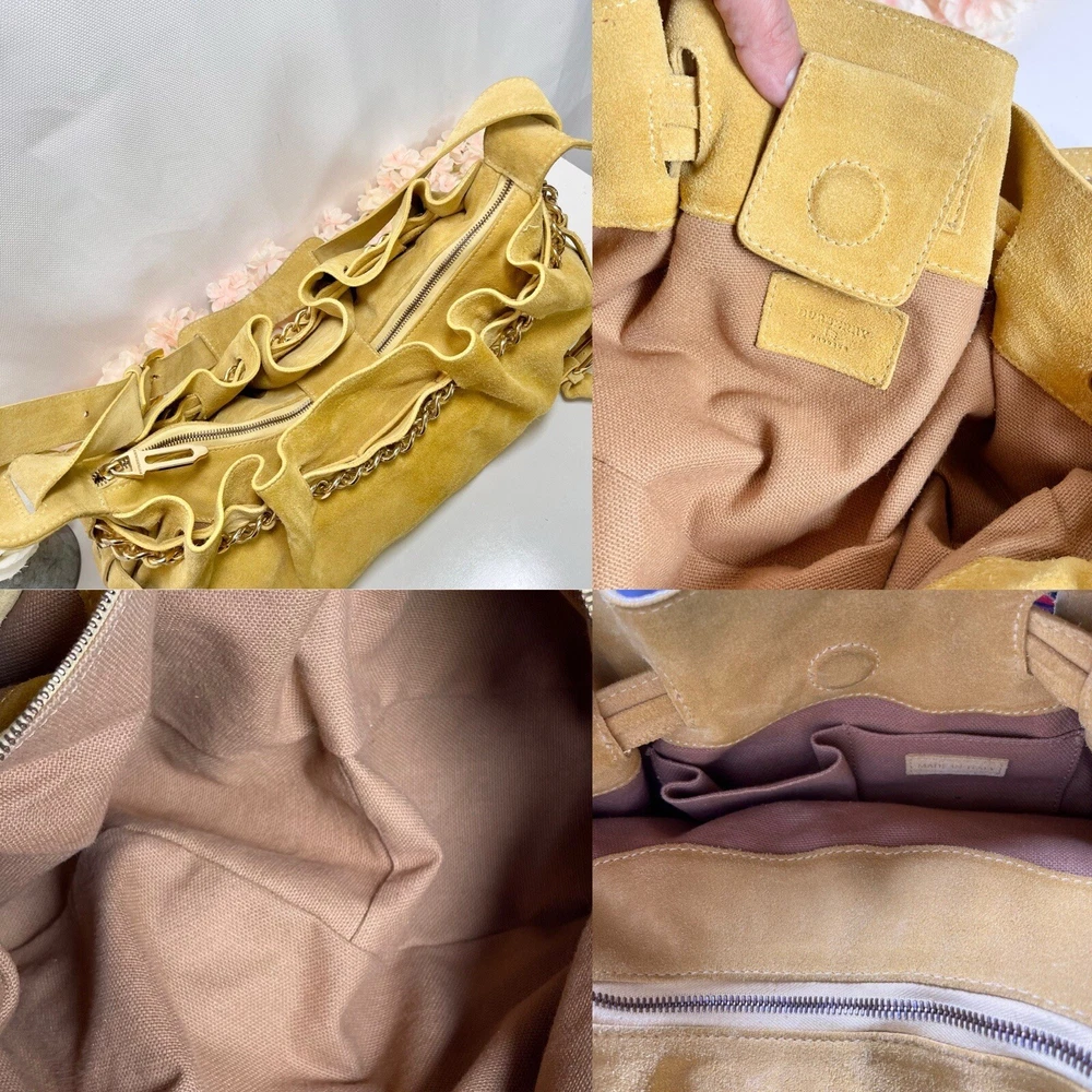 Gorgeous Burberry Suede leather shoulder bag Vintage & Rare hard to find bag! I personally could not find another one of these online. She has Straps & Buckle details Chain weaving in rouched trim Gold hardware with little to no wear or scratches Burberry logo etched on buckles Equestrian Knight logo on the studs 3 compartments: 1 Lg main + 2 on its sides 2 pocket slots on one side Zip closure to the main compartment Magnetic closure for the sides & main Adjustable strap w extra leather strap for comfort Great condition Flawless & Clean interior Exterior is soft suede, no matting, could use a light cleaning in some spots, shows very light wear for its age 18yrs vintage. She has a couple of scratches that are not that noticeable seen in close up pic. To make the flaw stand out more, I tried to show the color and suede changes given different lighting and a brushing of the leather. On camera, the color is a stronger/deeper yellow orange tan, but I’d say the pic closest to actual color is the second pic where the bag is laid flat 17” 6” 12” 14” shortest drop; adjustable length Accepting offers Bundle discounts Elevate your wardrobe with this rare Burberry Prorsum Runway Collection hobo bag. The exterior is crafted from luxurious suede and complemented by leather details. The spacious interior is lined with premium leather and perfect for carrying all your essentials. The chic design features a single strap for comfortable carrying, making it the ideal choice for busy women on the go. This bag is a must-have for any fashion-forward individual looking to add a touch of sophistication to their collection.
