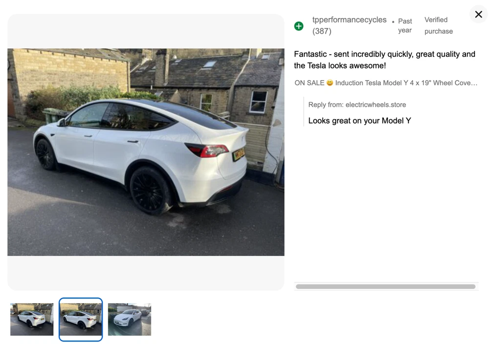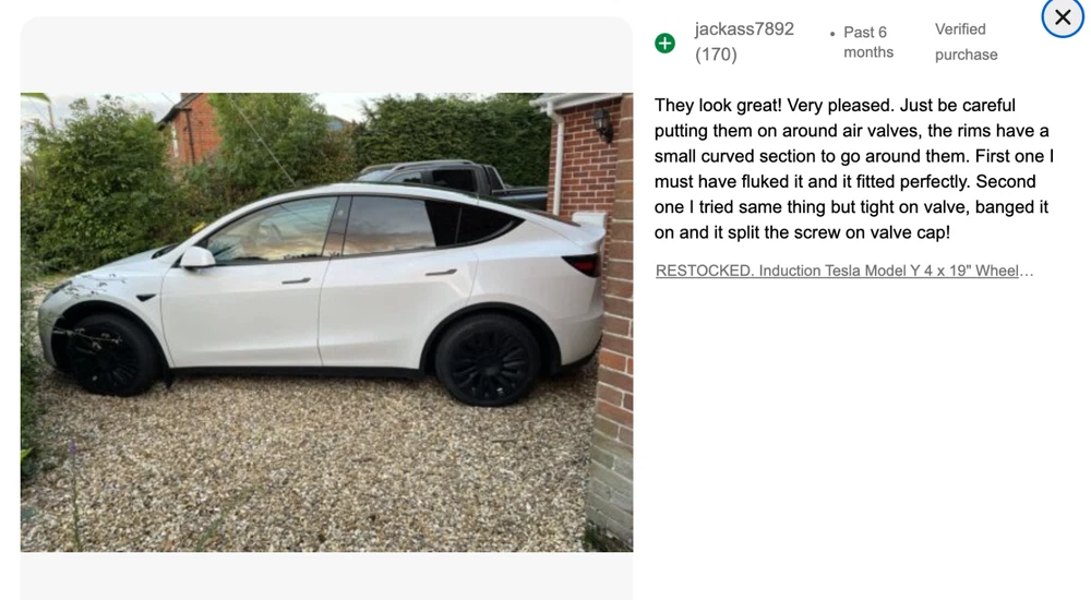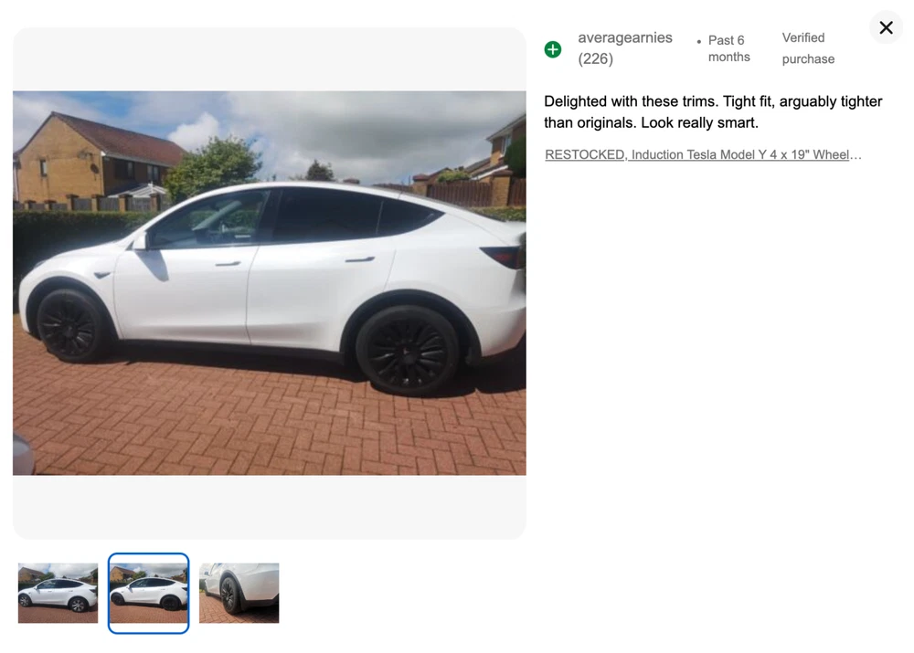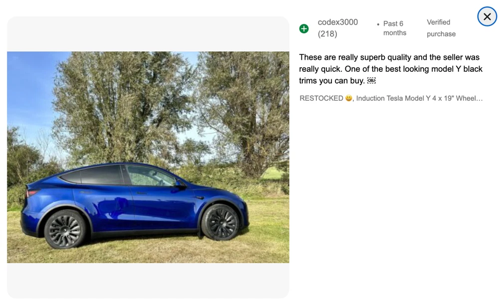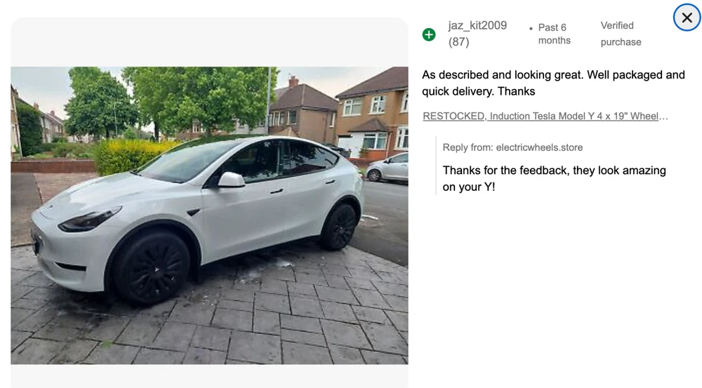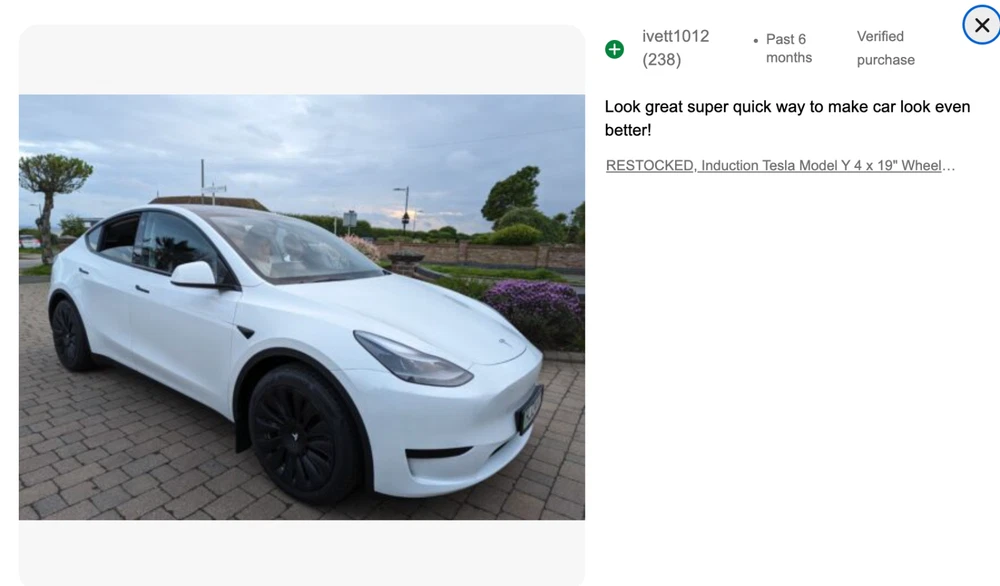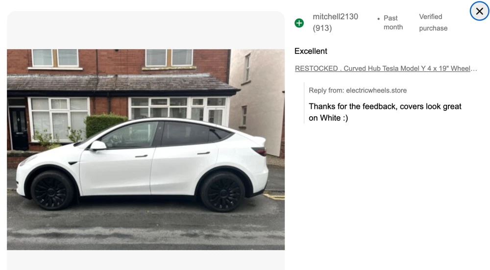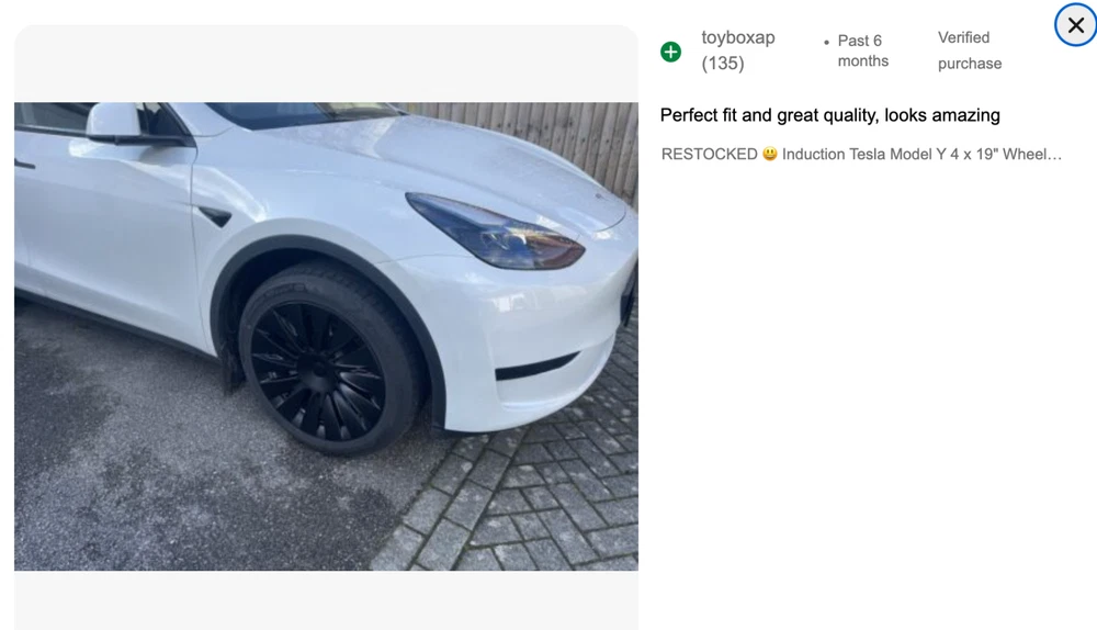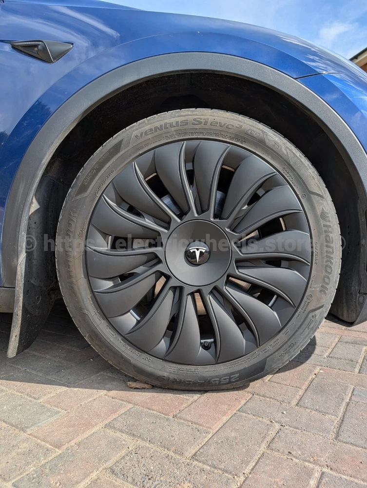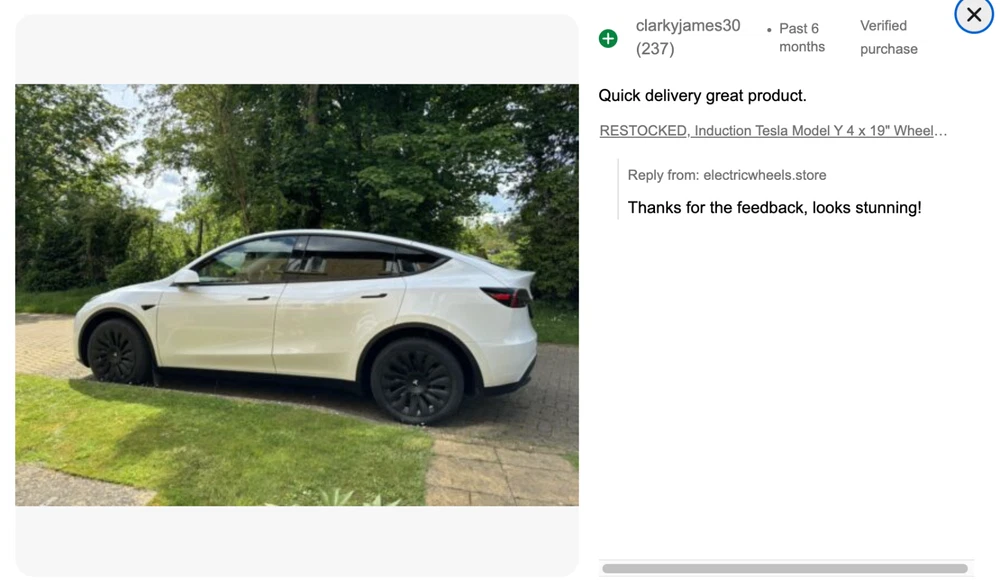 UK Exclusive Tesla Model Y Induction Covers 4 x 19 Inch Wheel Covers / Hub Caps. Includes Tesla Logo First in the UK for this Cover Style!! Most popular wheel cover on Facebook Owners Group. On the Model Y UK Owners Group: https://m.facebook.com/questions.php?question_id=6437784206284729 Closest match to the 20 inch Induction Wheel No Ugly Perforated Central Section See other listings for other styles of Model Y covers. 4 different styles on ebay! Search electricwheels.store for more styles, pictures and free delivery Check out my feedback - lots of happy owners saying how it transformed their Model Y UK Means UK High Quality UK Stock means UK Stock, sold from a UK Private Seller Beware of unreputable eBay sellers who steal our photos (taken on the front drive of my house with my Tesla) and pretend to sell the same quality covers as we do. Fast Dispatch I will dispatch fast on a next day delivery service. Subject to the carrier doing their job you should get your hubcaps the next working day. Try before you buy - Come and see how they look on my Tesla, save postage costs and pick up. I'm about 15 minutes from Newport Pagnell Supercharger Will it fit ? If you have a Tesla Model Y, with wheel covers like below this will 100% fit. Tested on my own Tesla High Quality Includes the Tesla decal for the centre of the wheel cover - gives it the OEM Feel Designed to be aerodynamically efficient . Looks great but also great range. Not like the other "Gemini" wheel covers where there are large holes on the wheel so you can see the silver alloy. These cover almost all the alloy - giving a performance look to the exterior of the car. These are not cheap "Halfords" type generic hub caps. 100% Designed for the Tesla Model Y wheels. Beware of the cheaper alternatives, checkout the Tesla Facebook groups where owners tell stories of the alternatives falling off Just like the factory wheel covers, all 4 covers are identical. This means that the curve of the spokes will be towards the front on one side and the back on the others. This is typical of how wheel covers are sold. Protect your Tesla These wheel covers cover the entire alloy. Unlike the OEM wheel covers and cheap ebay covers which leave the edge exposed Because they cover the whole wheel any kerb rash will be taken up by the cover and not the underlying alloy No expensive end of lease charges when you hand back damaged alloys - put the OEM covers back on What's in the box ? 4 Hub Cap / Wheel Covers - Securely Packaged in Bubble Wrap Tape to protect alloy ( optional to fit ) Do you want your Y to look like this? or this? Contact us We can be contacted at any time through eBay messages if you have any questions, comments or product requests. We will respond to you within 24 hours and do our best to help you out! We encourage our customers to contact us with any questions or concerns! We'd like to be sure you are completely satisfied with your purchase.